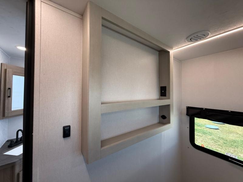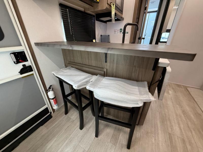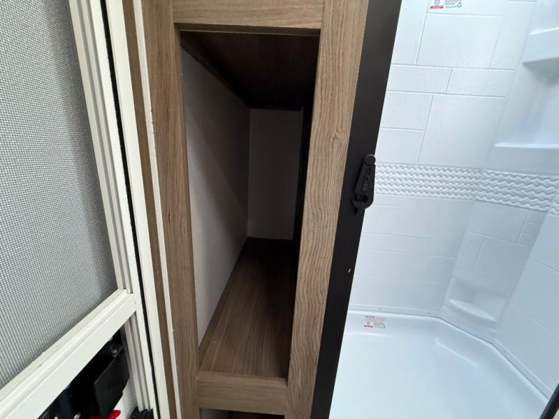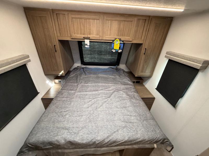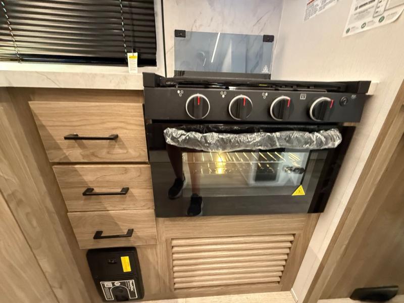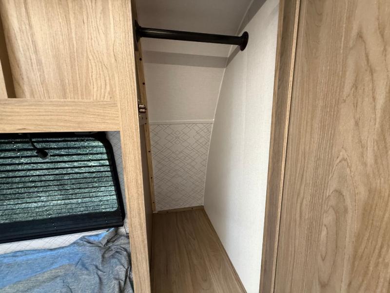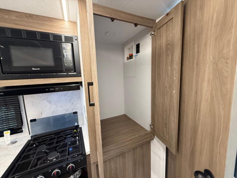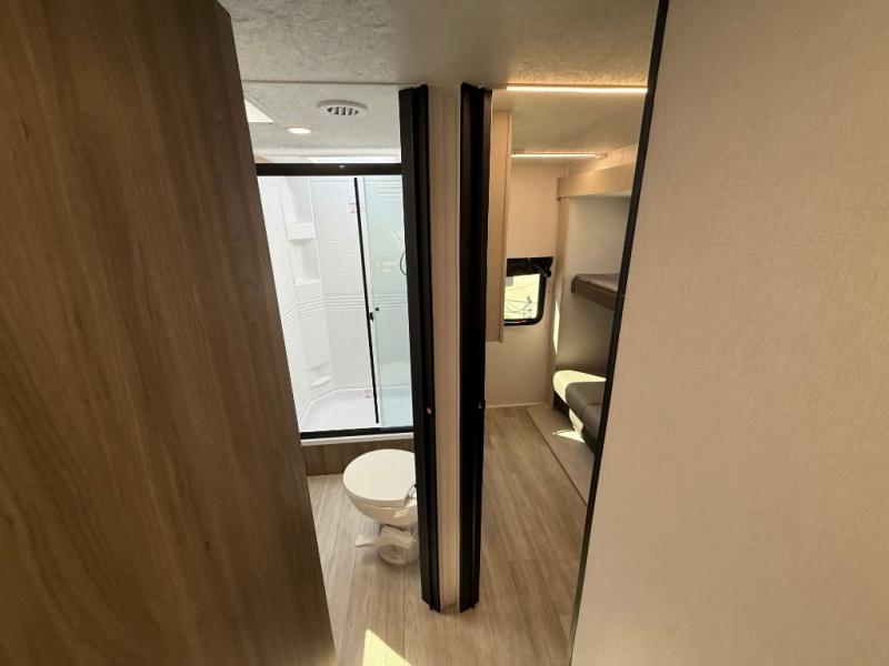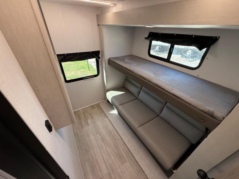 You will love camping in this spacious travel trailer! The rear bunkhouse offers a flexible space with bunks plus a sofa underneath. A rear corner bath will help for an everyday fresh start. At the front you will enjoy privacy in the queen bedroom, which has dual wardrobes and overhead storage for easy organization. Everyone will want to gather in the living area with a theater seat and why not crack a cold one conveniently stored next to you in the 12V refrigerator. The kitchen is well-equipped and will have plenty of room for entertaining and cooking with its bar top and flip-up countertop. There's an outdoor griddle as well if you'd prefer to cook outside.