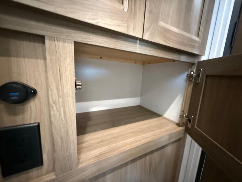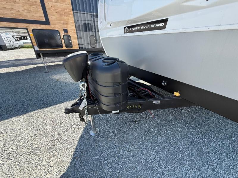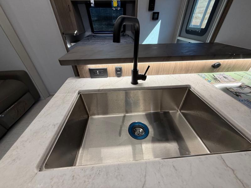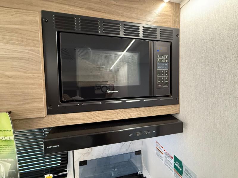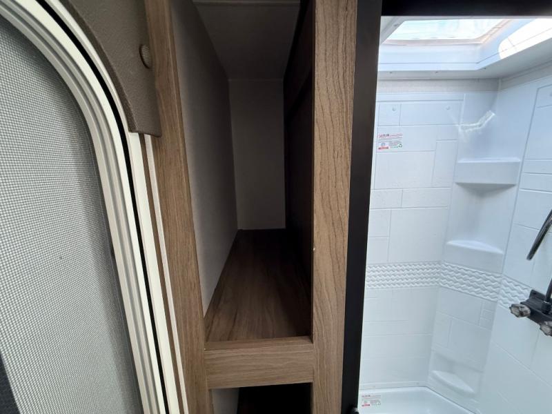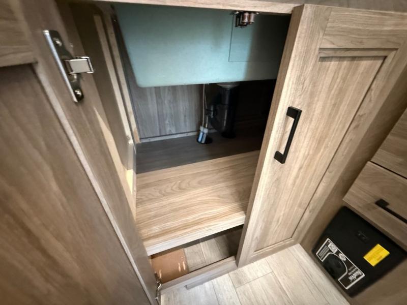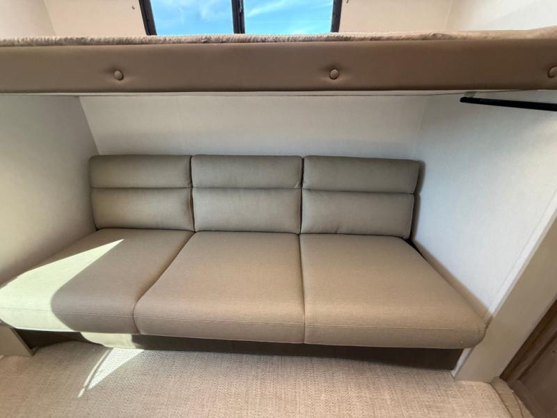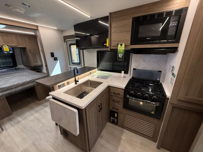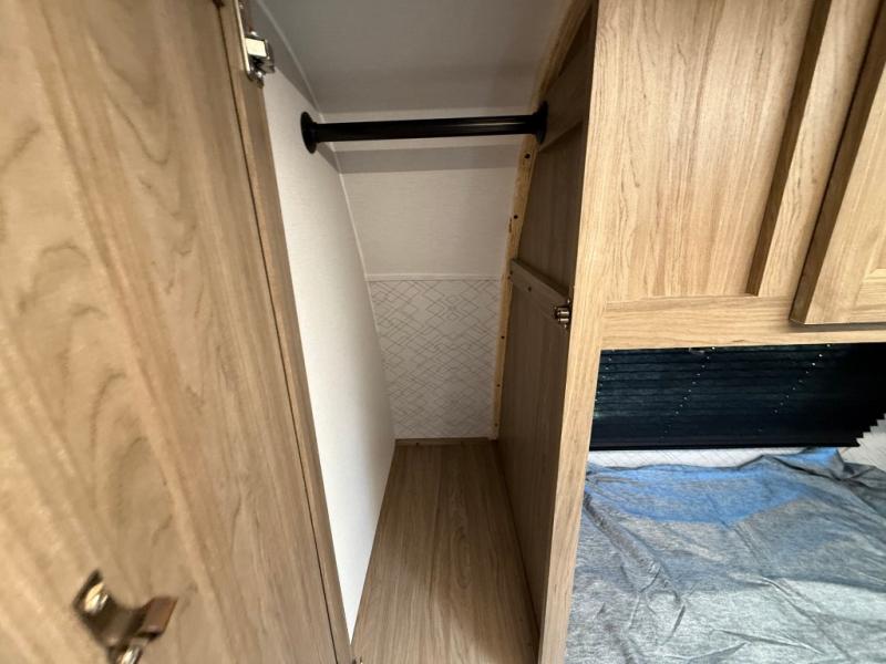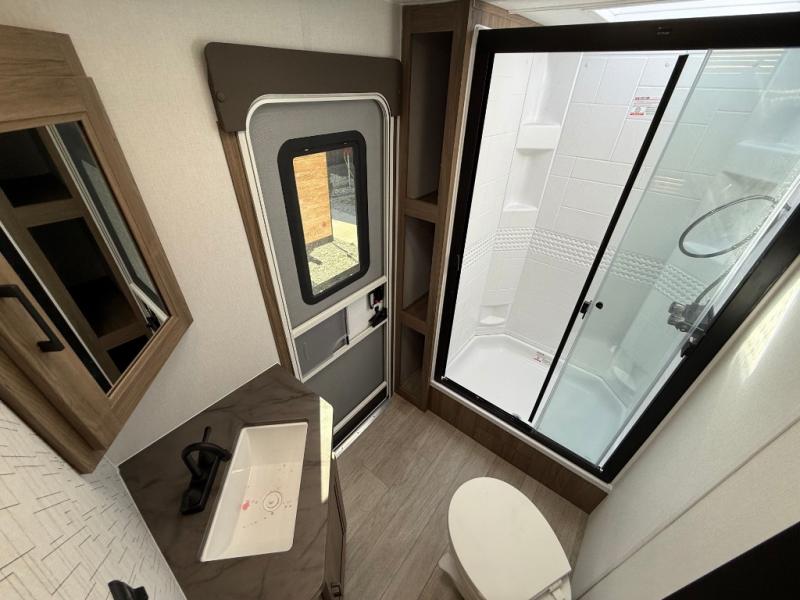 You will love camping in this spacious travel trailer! The rear bunkhouse offers a flexible space with bunks plus a sofa underneath. A rear corner bath will help for an everyday fresh start. At the front you will enjoy privacy in the queen bedroom, which has dual wardrobes and overhead storage for easy organization. Everyone will want to gather in the living area with a theater seat and why not crack a cold one conveniently stored next to you in the 12V refrigerator. The kitchen is well-equipped and will have plenty of room for entertaining and cooking with its bar top and flip-up countertop. There's an outdoor griddle as well if you'd prefer to cook outside.
