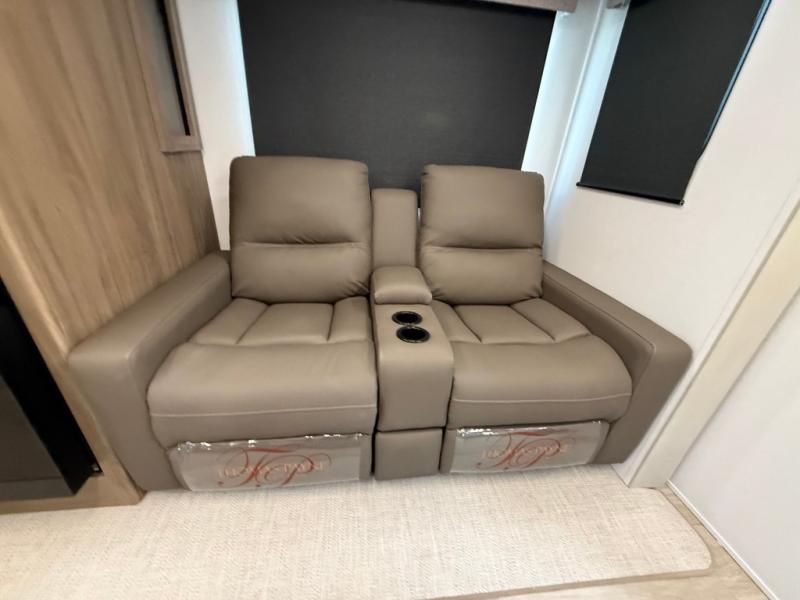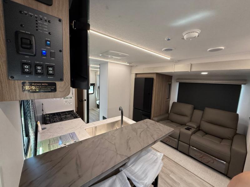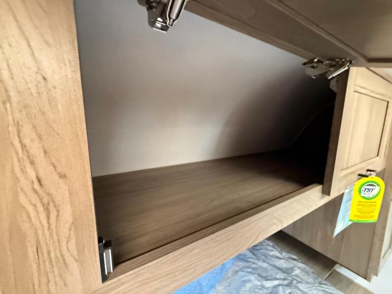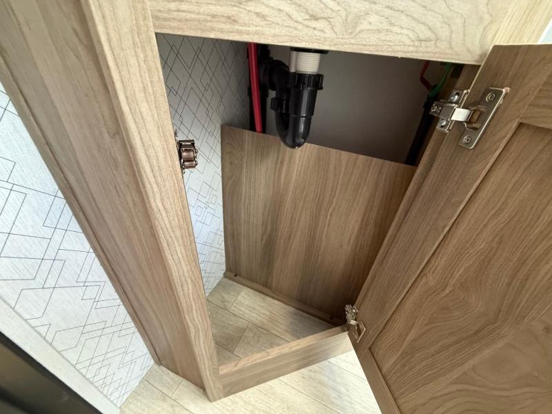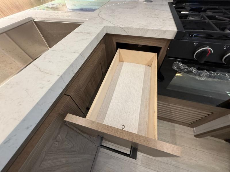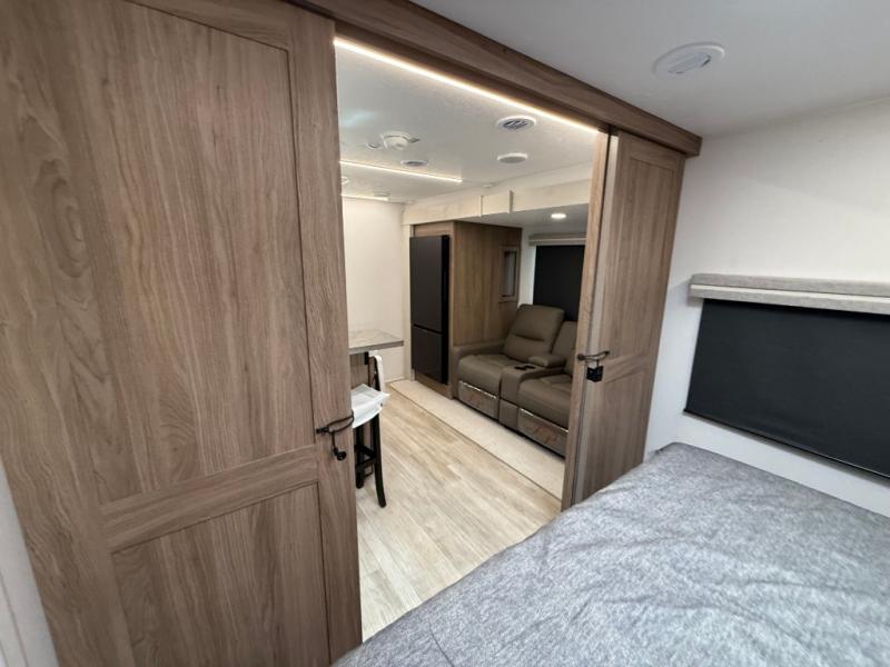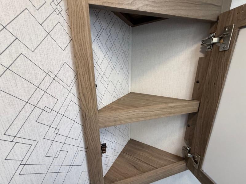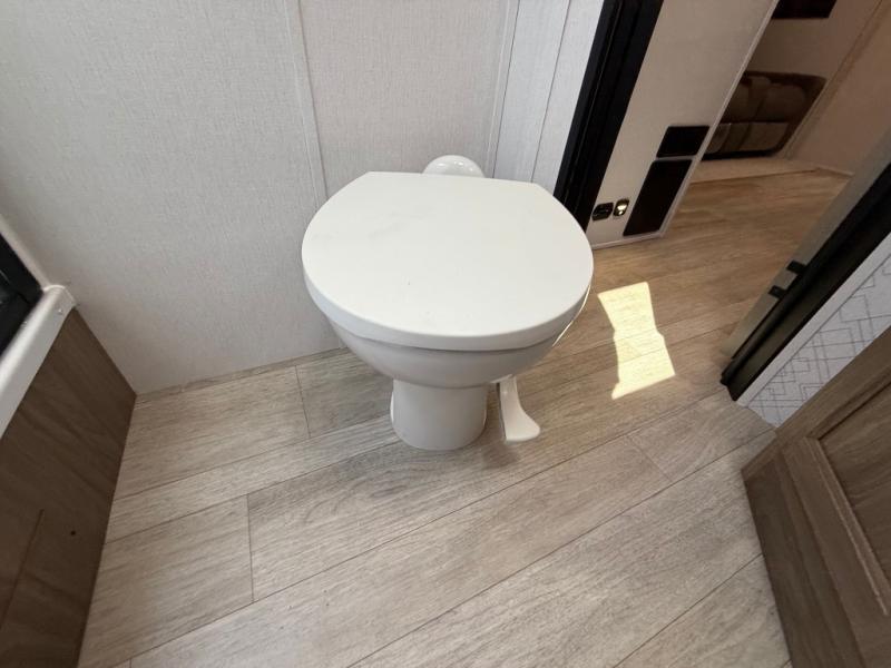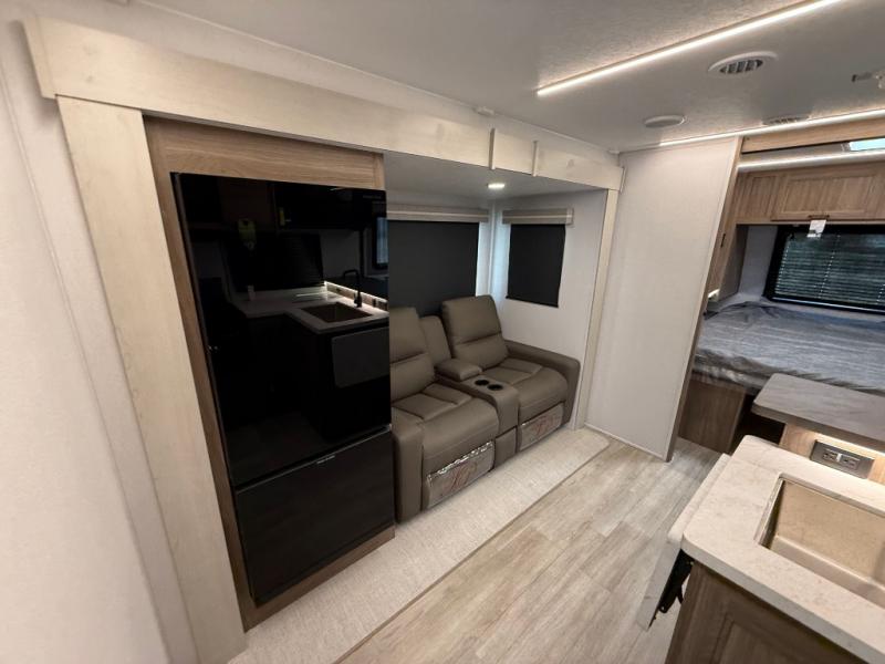 You will love camping in this spacious travel trailer! The rear bunkhouse offers a flexible space with bunks plus a sofa underneath. A rear corner bath will help for an everyday fresh start. At the front you will enjoy privacy in the queen bedroom, which has dual wardrobes and overhead storage for easy organization. Everyone will want to gather in the living area with a theater seat and why not crack a cold one conveniently stored next to you in the 12V refrigerator. The kitchen is well-equipped and will have plenty of room for entertaining and cooking with its bar top and flip-up countertop. There's an outdoor griddle as well if you'd prefer to cook outside.