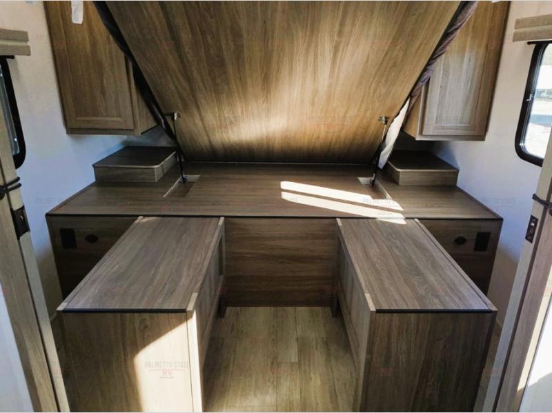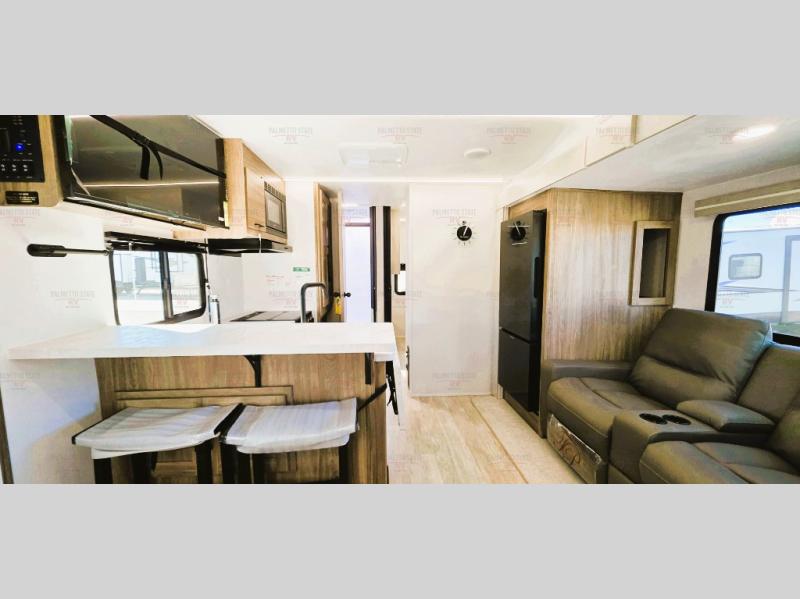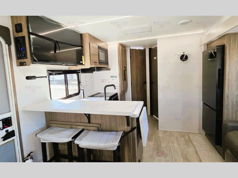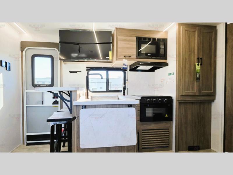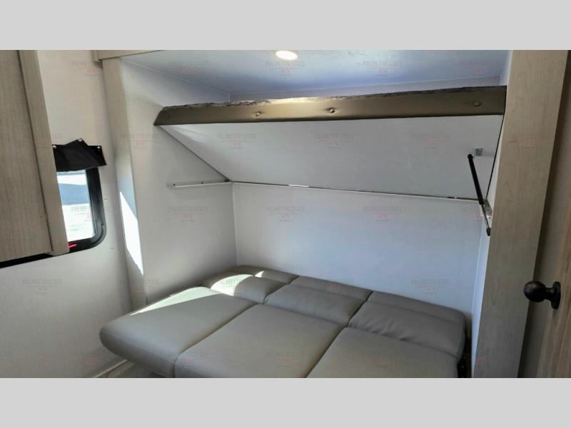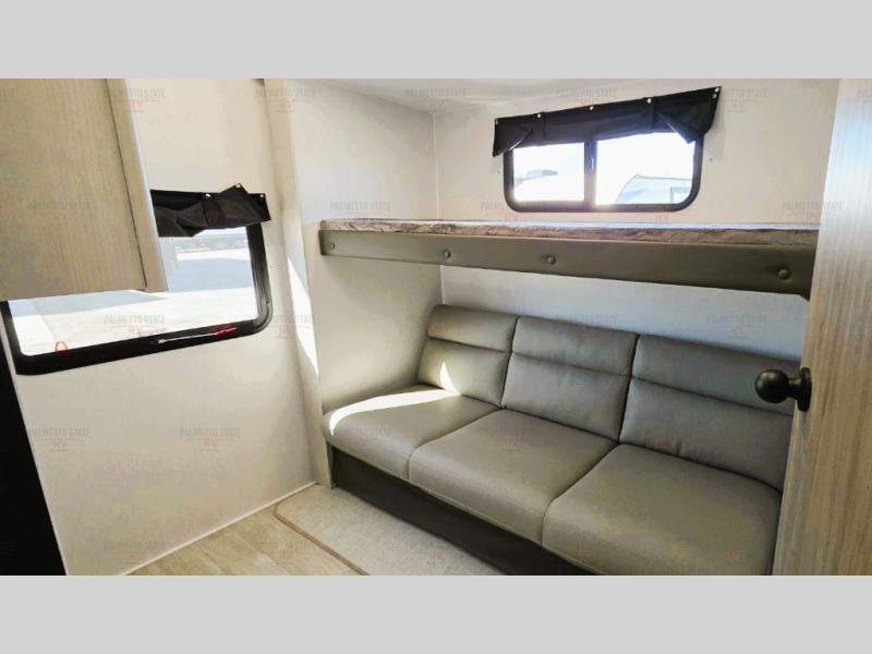 You will love camping in this spacious travel trailer! The rear bunkhouse offers a flexible space with bunks plus a sofa underneath. A rear corner bath will help for an everyday fresh start. At the front you will enjoy privacy in the queen bedroom, which has dual wardrobes and overhead storage for easy organization. Everyone will want to gather in the living area with a theater seat and why not crack a cold one conveniently stored next to you in the 12V refrigerator. The kitchen is well-equipped and will have plenty of room for entertaining and cooking with its bar top and flip-up countertop. There's an outdoor griddle as well if you'd prefer to cook outside.