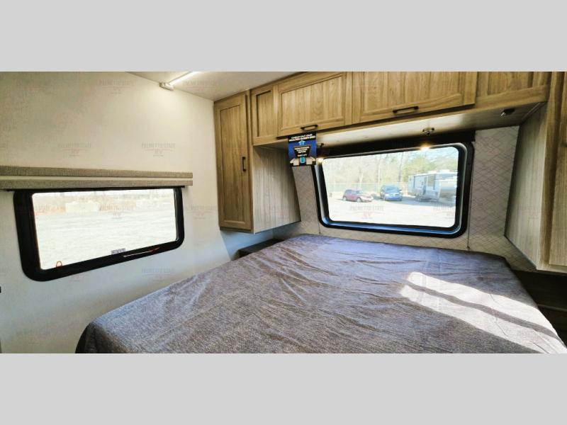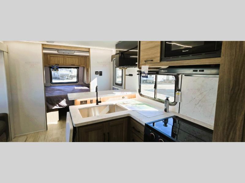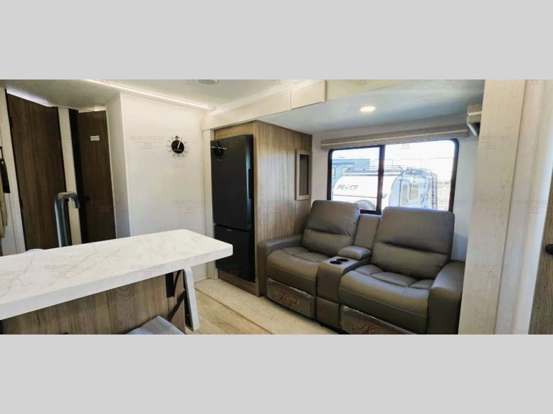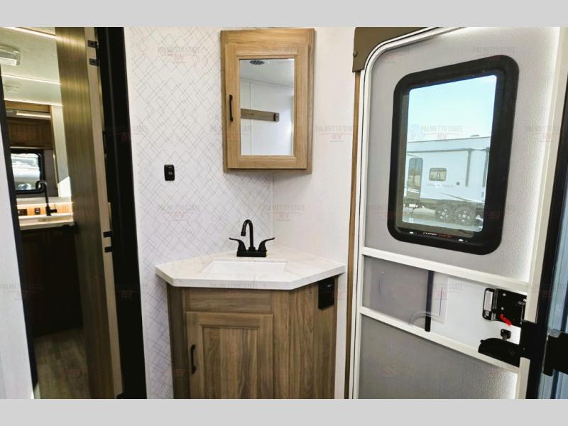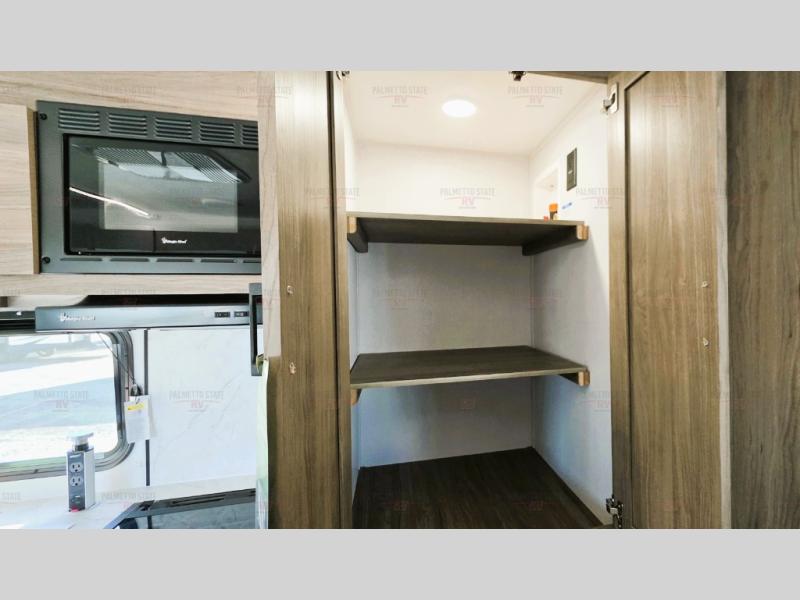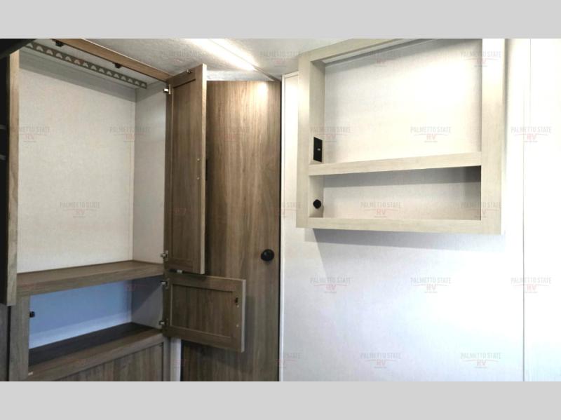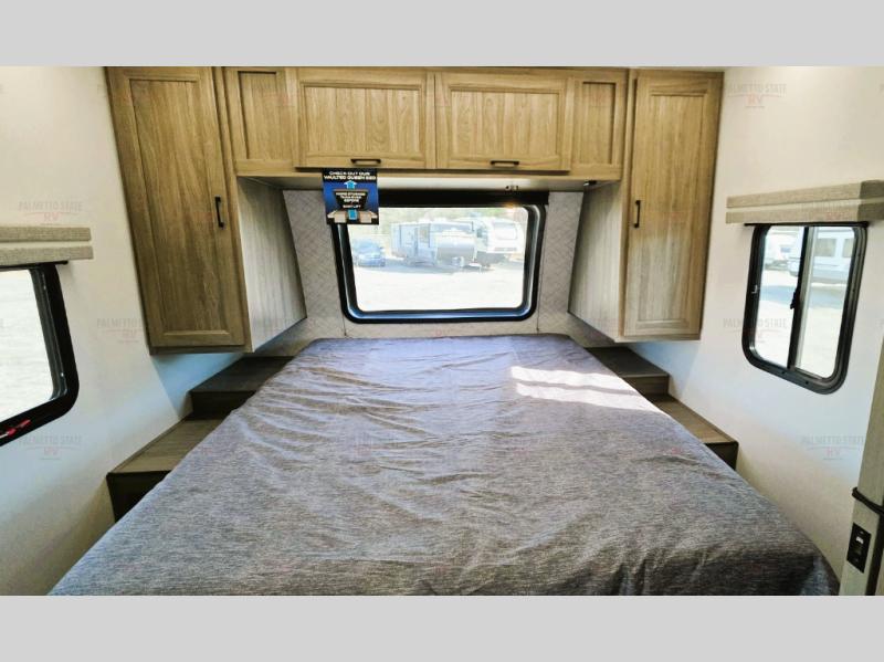 You will love camping in this spacious travel trailer! The rear bunkhouse offers a flexible space with bunks plus a sofa underneath. A rear corner bath will help for an everyday fresh start. At the front you will enjoy privacy in the queen bedroom, which has dual wardrobes and overhead storage for easy organization. Everyone will want to gather in the living area with a theater seat and why not crack a cold one conveniently stored next to you in the 12V refrigerator. The kitchen is well-equipped and will have plenty of room for entertaining and cooking with its bar top and flip-up countertop. There's an outdoor griddle as well if you'd prefer to cook outside.