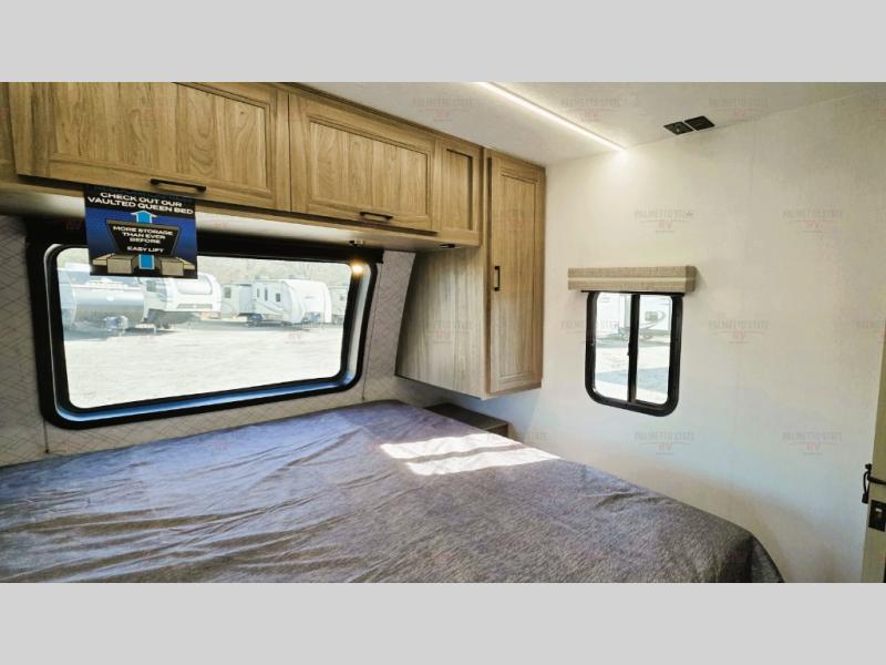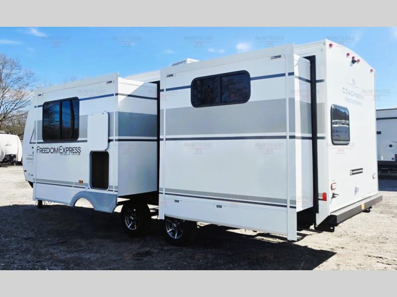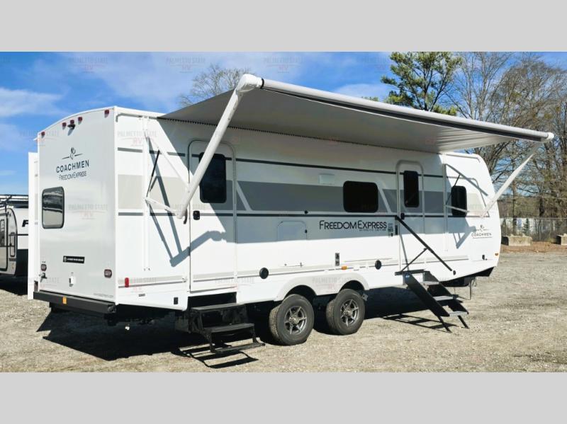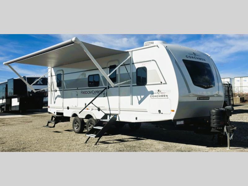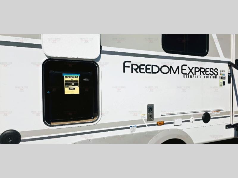 With any Freedom Express Ultra Lite travel trailer by Coachmen you will appreciate quality construction materials, such as vacuum bonded walls with Azdel composite, a 3/4 gel coated fiberglass cap with an automotive glass windshield, and a heated enclosed underbelly. Each model also features Tufflex PVC roofing, front rock guard, and E-Z Lube axles for smooth towing. Inside, you'll find kitchen backsplash, hidden hinge cabinetry, and wear-resistant vinyl flooring throughout. The power tongue jack included with the Ultra Lite Express Package will make set-up a breeze, and each model includes back-up camera prep and they are Freedom solar ready if you plan to go off-grid. Enjoy lightweight camping with a Freedom Express Ultra Lite travel trailer today!