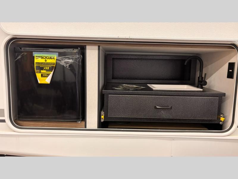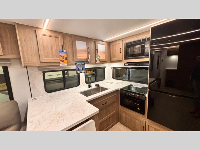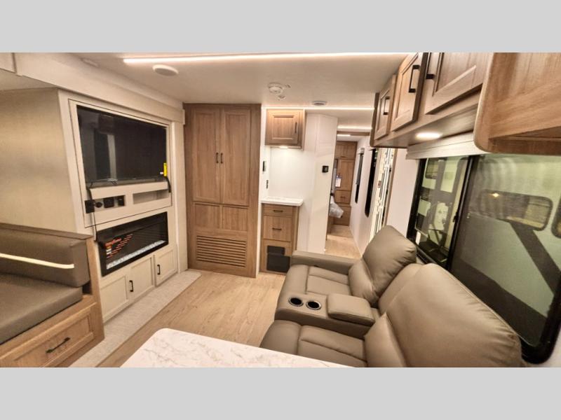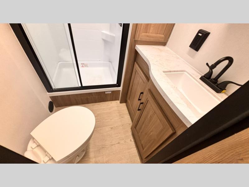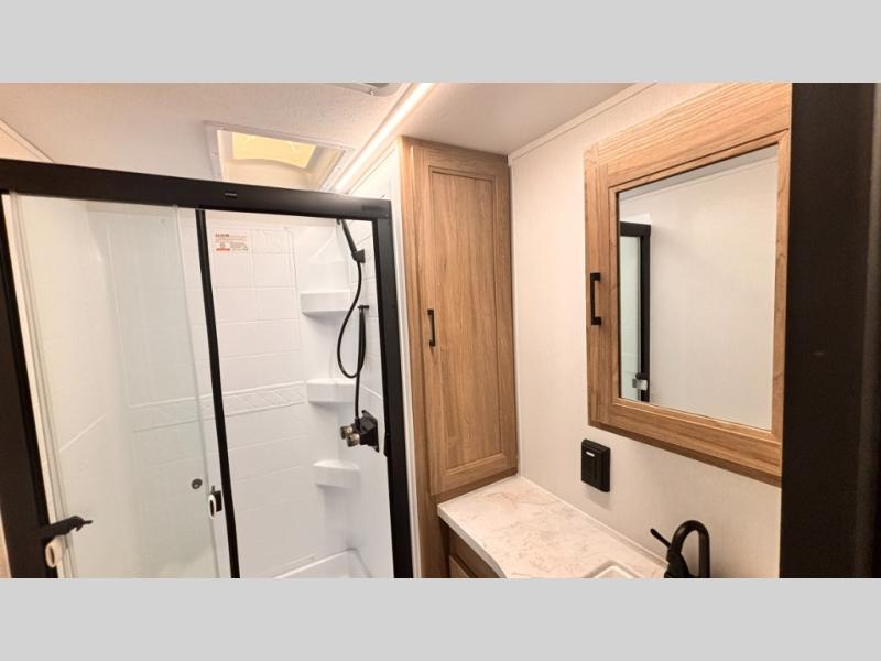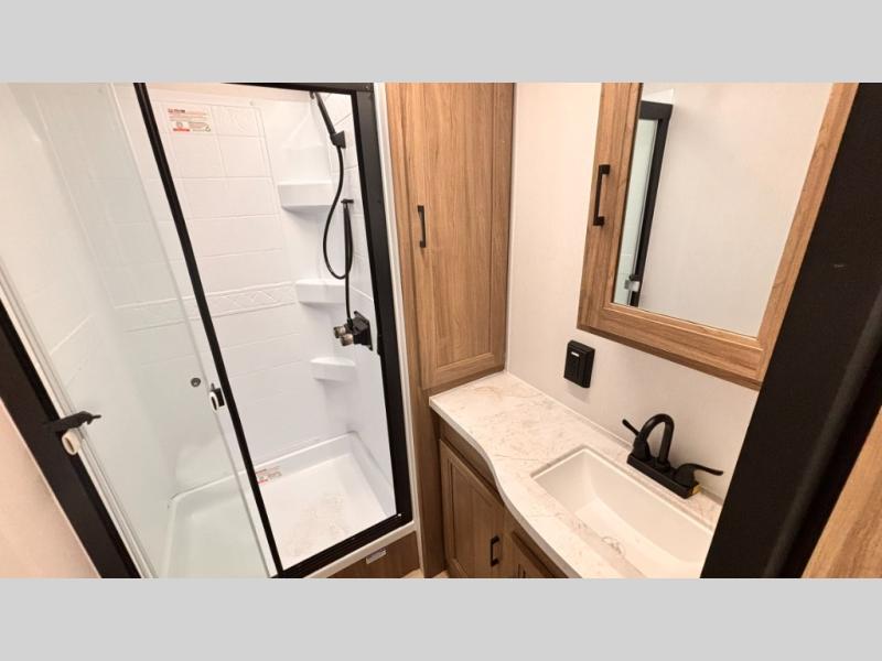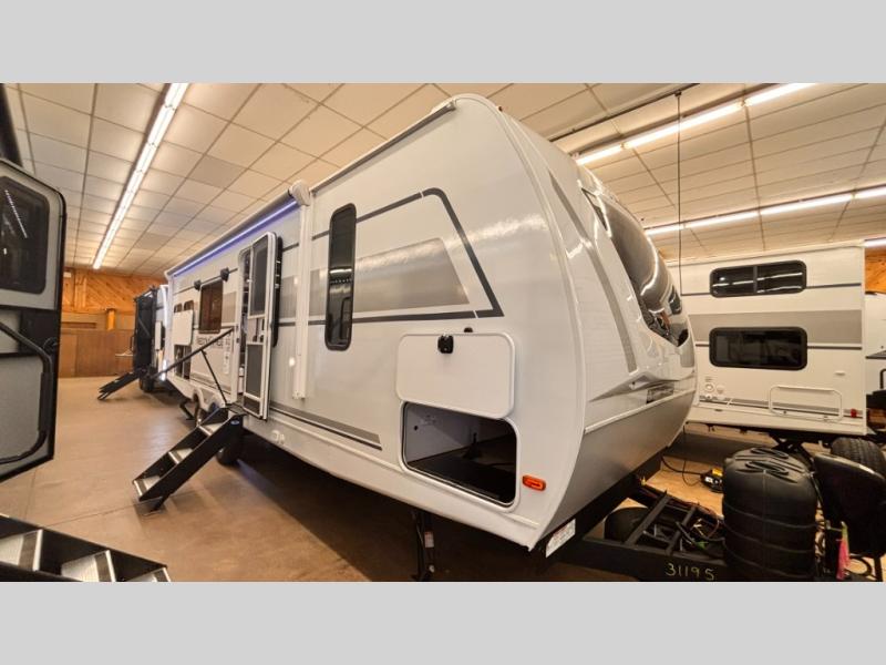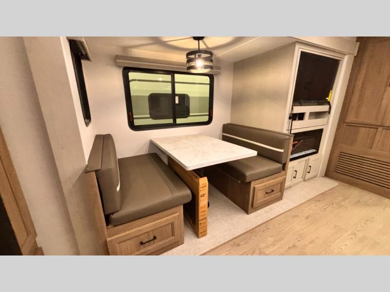Are you looking for a travel trailer that will feel more like home? Look no further than this model that features a private bedroom up front, a full bath, plus a spacious rear kitchen. You will love to relax on the theatre sofa/hide-a-bed sofa across from the Smart TV and fireplace, and there is a booth dinette for dining. This model also includes a hidden pantry behind the TV for smart storage solutions. If the weather is nice you may just want to sit outdoors under the 18' power awning with LED lights. The chef of your group can prepare a meal on the pull-out camp kitchen, and the kids can grab their scooters from the pass-through storage.