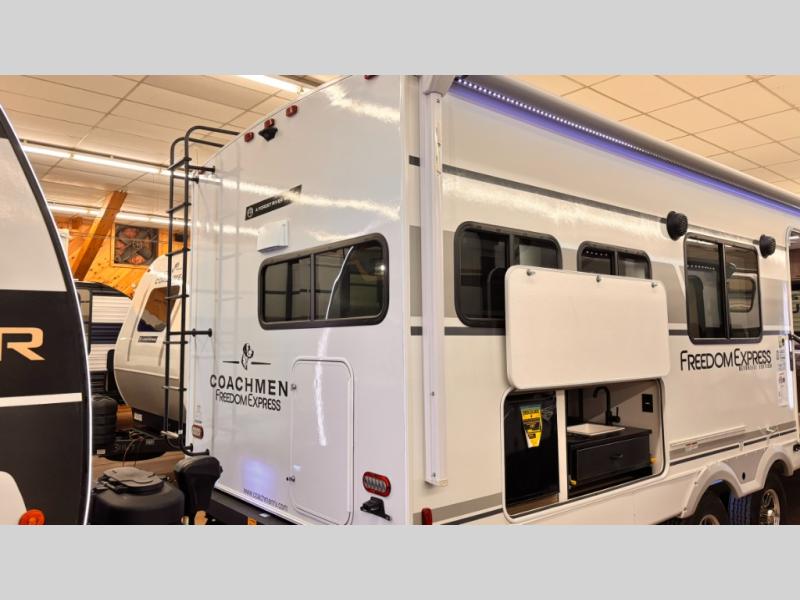 With any Freedom Express Ultra Lite travel trailer by Coachmen you will appreciate quality construction materials, such as vacuum bonded walls with Azdel composite, a 3/4 gel coated fiberglass cap with an automotive glass windshield, and a heated enclosed underbelly. Each model also features Tufflex PVC roofing, front rock guard, and E-Z Lube axles for smooth towing. Inside, you'll find kitchen backsplash, hidden hinge cabinetry, and wear-resistant vinyl flooring throughout. The power tongue jack included with the Ultra Lite Express Package will make set-up a breeze, and each model includes back-up camera prep and they are Freedom solar ready if you plan to go off-grid. Enjoy lightweight camping with a Freedom Express Ultra Lite travel trailer today!