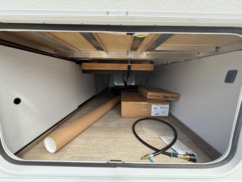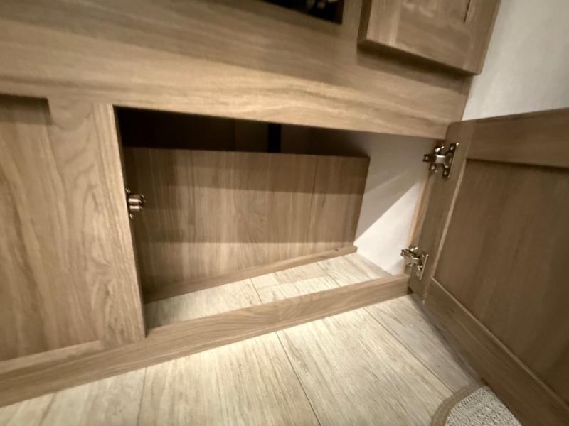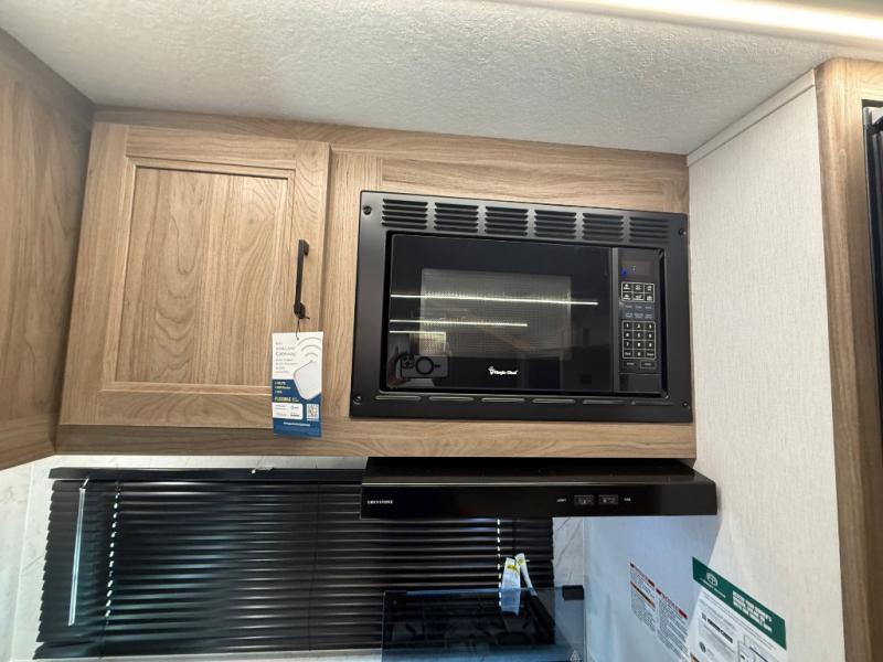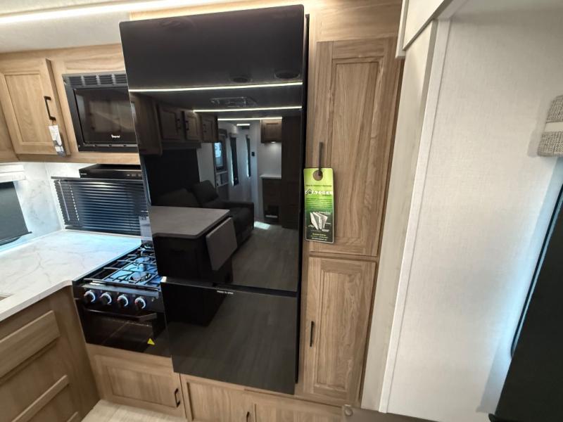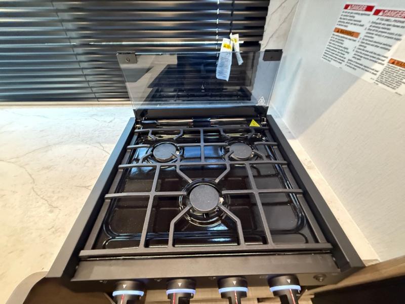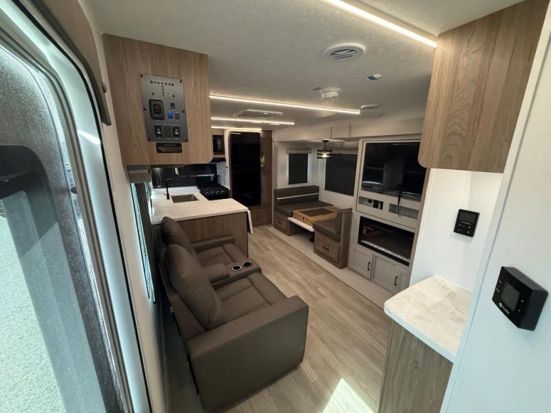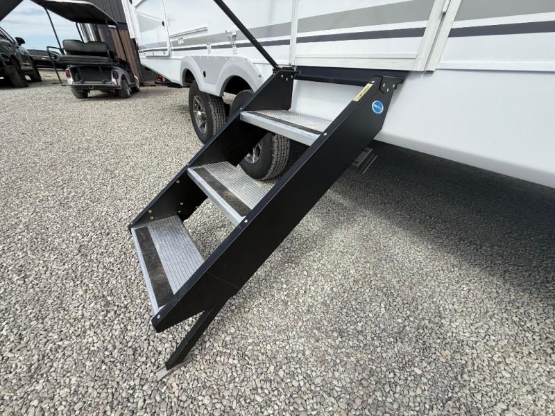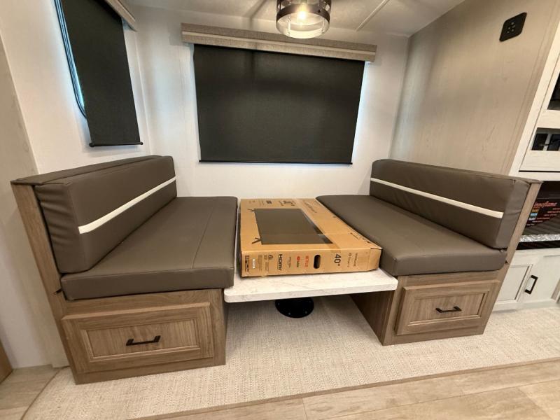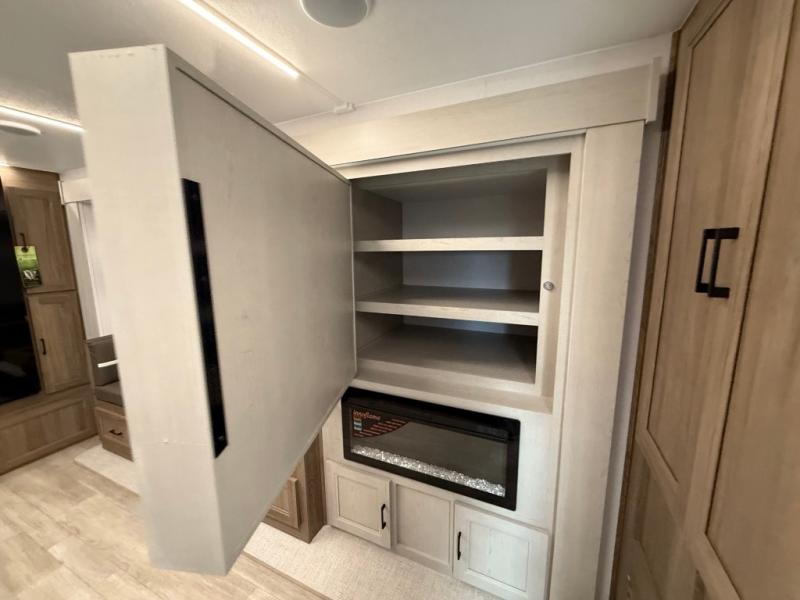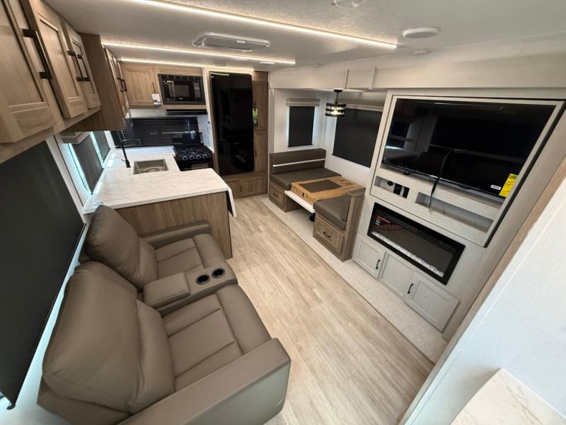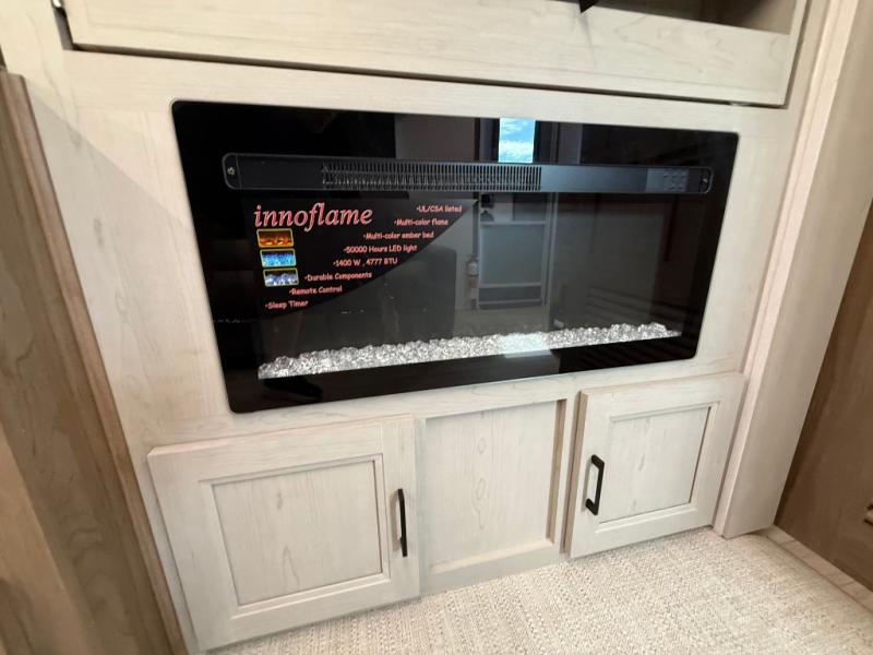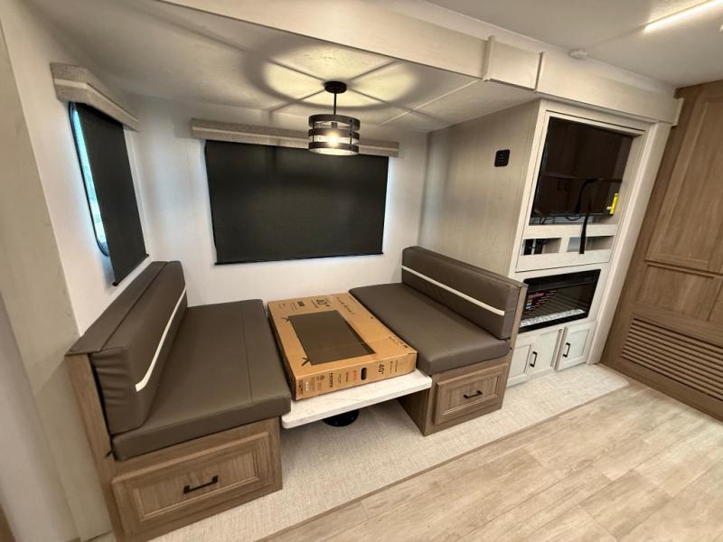 Are you looking for a travel trailer that will feel more like home? Look no further than this model that features a private bedroom up front, a full bath, plus a spacious rear kitchen. You will love to relax on the theatre sofa/hide-a-bed sofa across from the Smart TV and fireplace, and there is a booth dinette for dining. This model also includes a hidden pantry behind the TV for smart storage solutions. If the weather is nice you may just want to sit outdoors under the 18' power awning with LED lights. The chef of your group can prepare a meal on the pull-out camp kitchen, and the kids can grab their scooters from the pass-through storage.