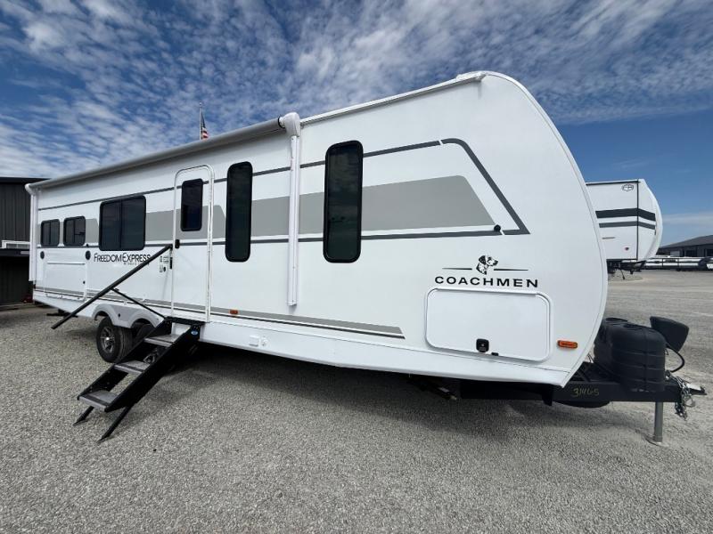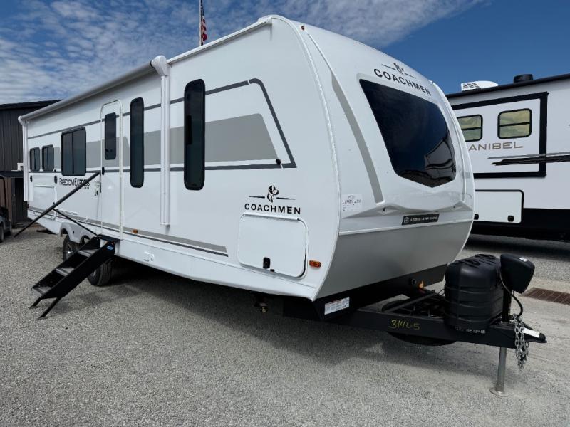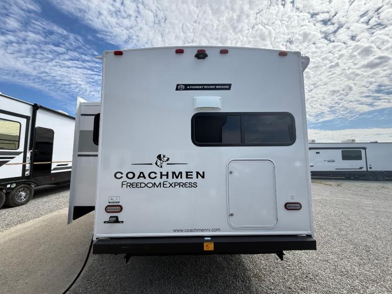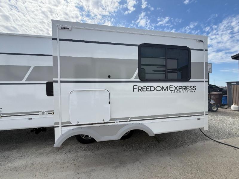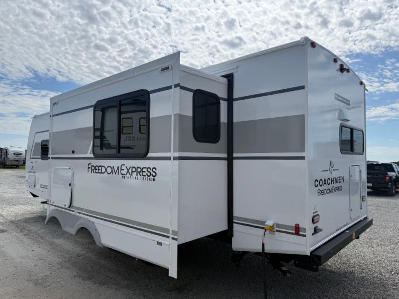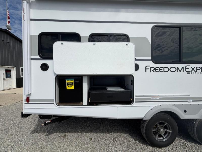 With any Freedom Express Ultra Lite travel trailer by Coachmen you will appreciate quality construction materials, such as vacuum bonded walls with Azdel composite, a 3/4 gel coated fiberglass cap with an automotive glass windshield, and a heated enclosed underbelly. Each model also features Tufflex PVC roofing, front rock guard, and E-Z Lube axles for smooth towing. Inside, you'll find kitchen backsplash, hidden hinge cabinetry, and wear-resistant vinyl flooring throughout. The power tongue jack included with the Ultra Lite Express Package will make set-up a breeze, and each model includes back-up camera prep and they are Freedom solar ready if you plan to go off-grid. Enjoy lightweight camping with a Freedom Express Ultra Lite travel trailer today!