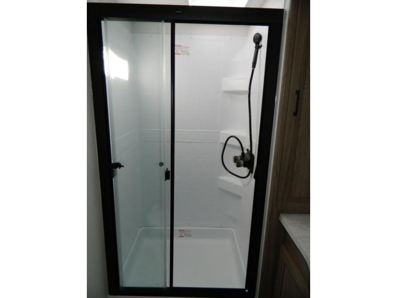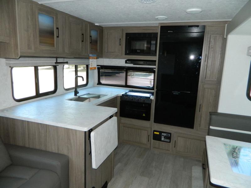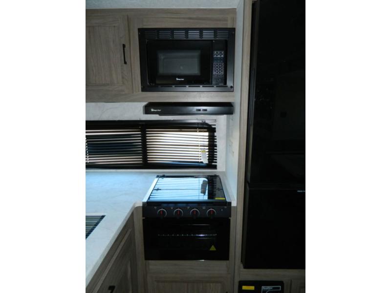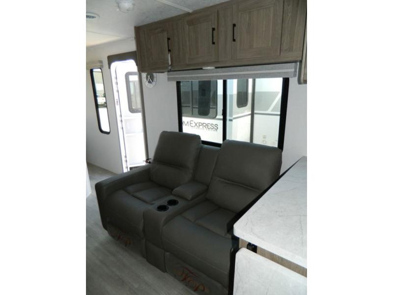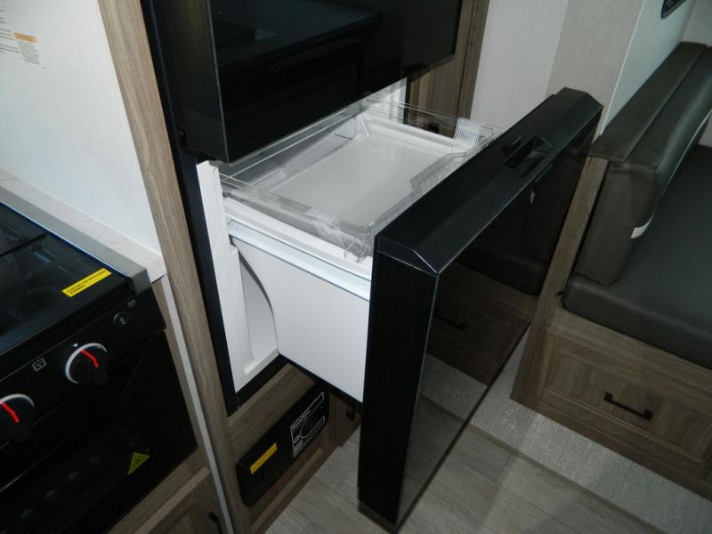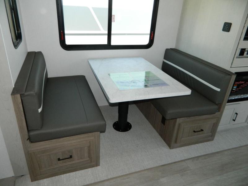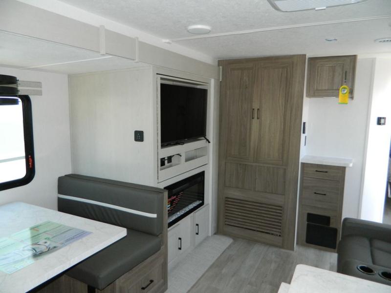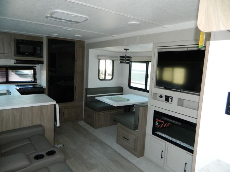 Are you looking for a travel trailer that will feel more like home? Look no further than this model that features a private bedroom up front, a full bath, plus a spacious rear kitchen. You will love to relax on the sofa or opt for the theatre sofa/hide-a-bed sofa across from the Smart TV and fireplace, and there is a booth dinette for dining. This model also includes a hidden pantry behind the TV for smart storage solutions. If the weather is nice you may just want to sit outdoors under the 18' power awning with LED lights. The chef of your group can prepare a meal on the pull-out camp kitchen, and the kids can grab their scooters from the pass-through storage.