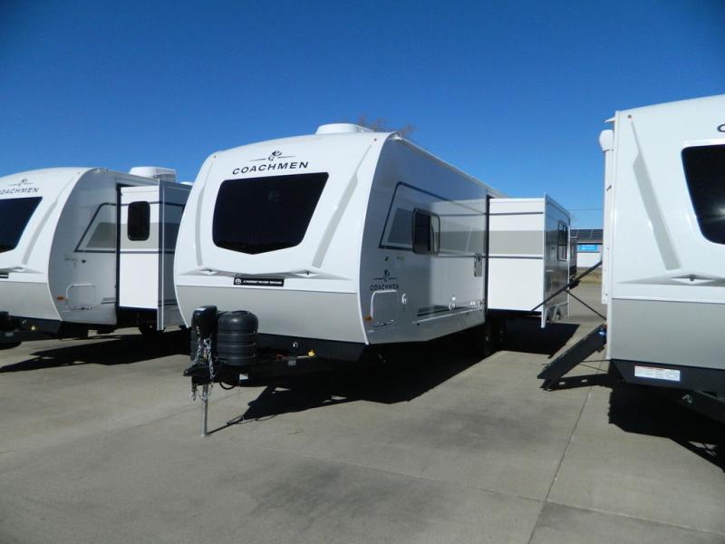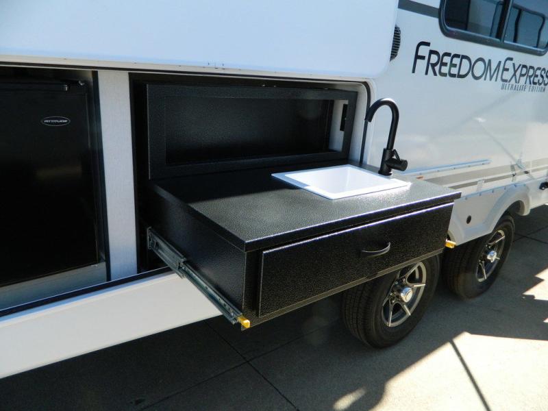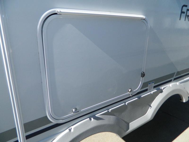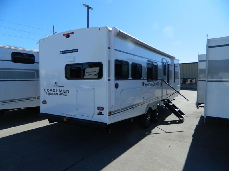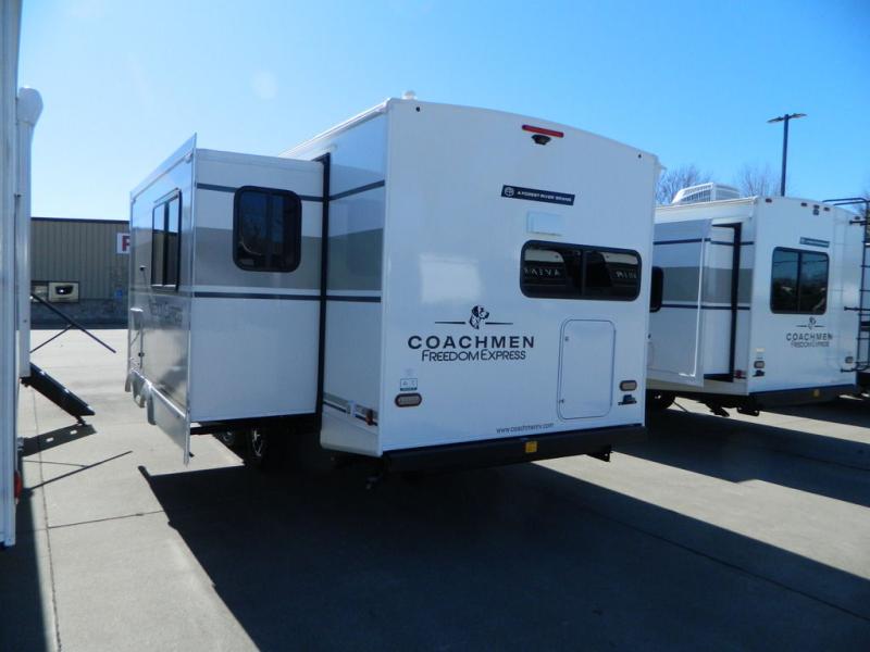 With any Freedom Express Ultra Lite travel trailer by Coachmen you will appreciate quality construction materials, such as vacuum bonded walls with Azdel composite, a 3/4 gel coated fiberglass cap with an automotive glass windshield, and a heated enclosed underbelly. Each model also features Tufflex PVC roofing, front rock guard, and E-Z Lube axles for smooth towing. Inside, you'll find kitchen backsplash, hidden hinge cabinetry, and wear-resistant vinyl flooring throughout. The power tongue jack included with the Ultra Lite Express Package will make set-up a breeze, and each model includes back-up camera prep and they are Freedom solar ready if you plan to go off-grid. Enjoy lightweight camping with a Freedom Express Ultra Lite travel trailer today!