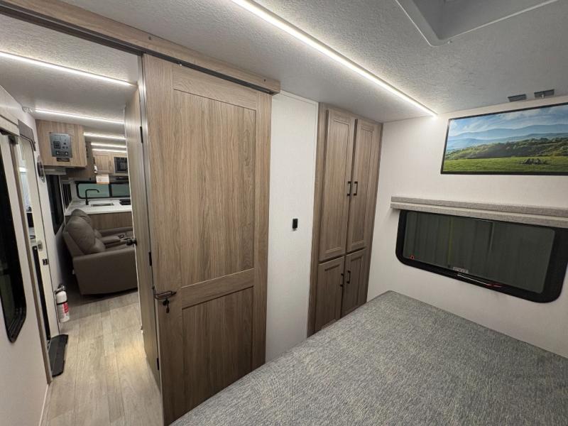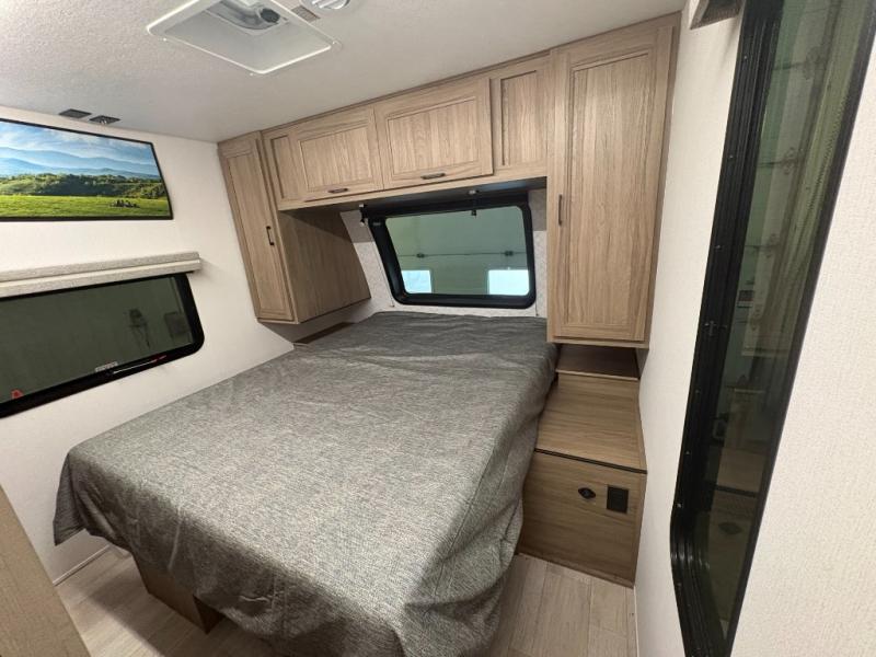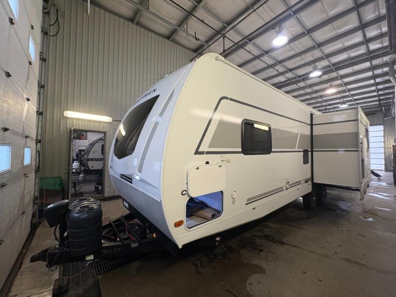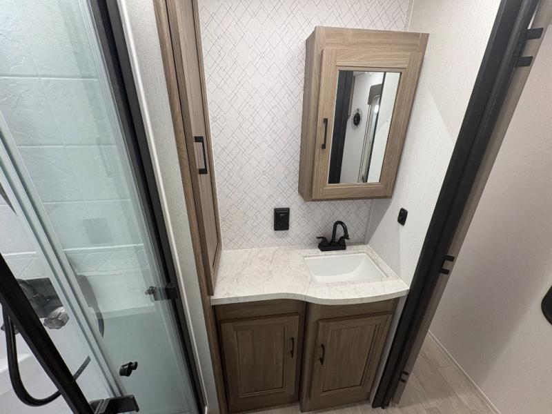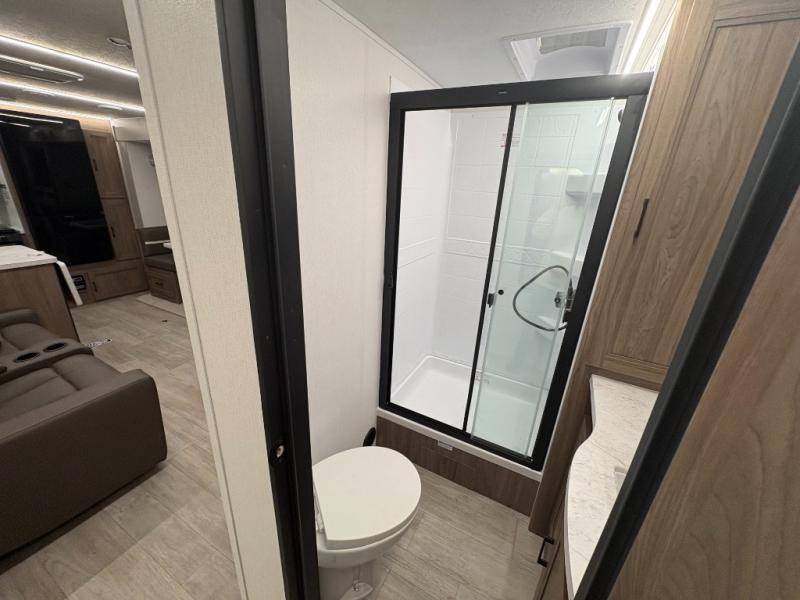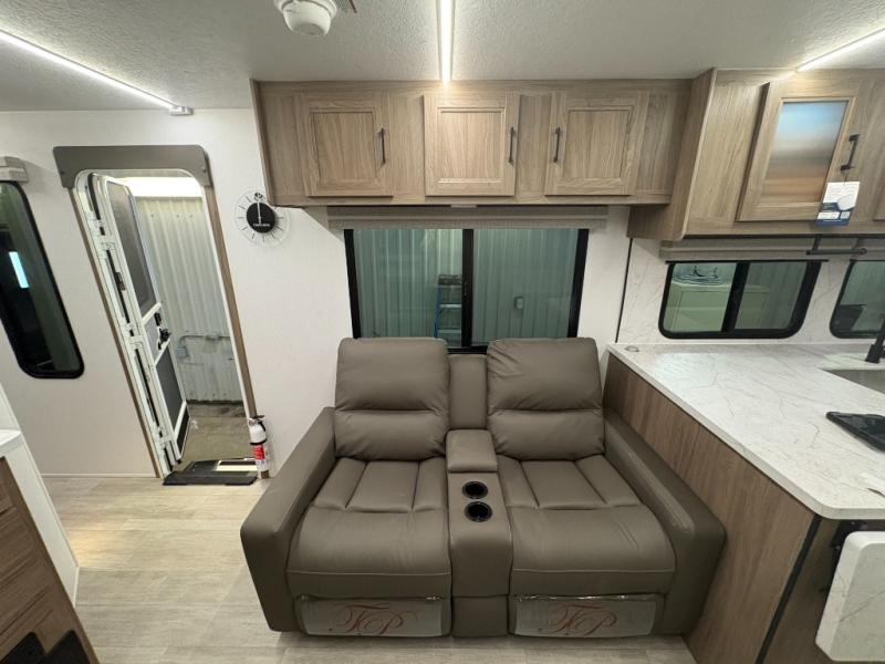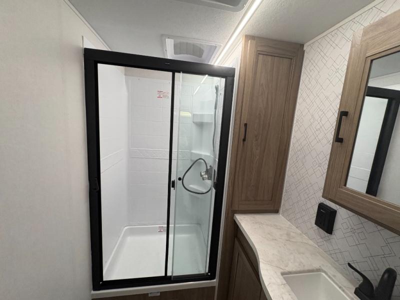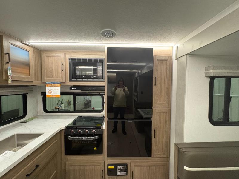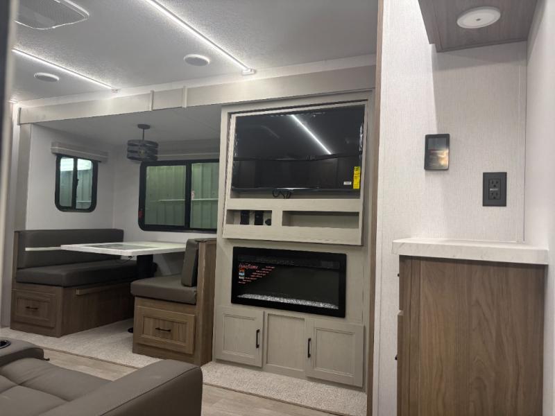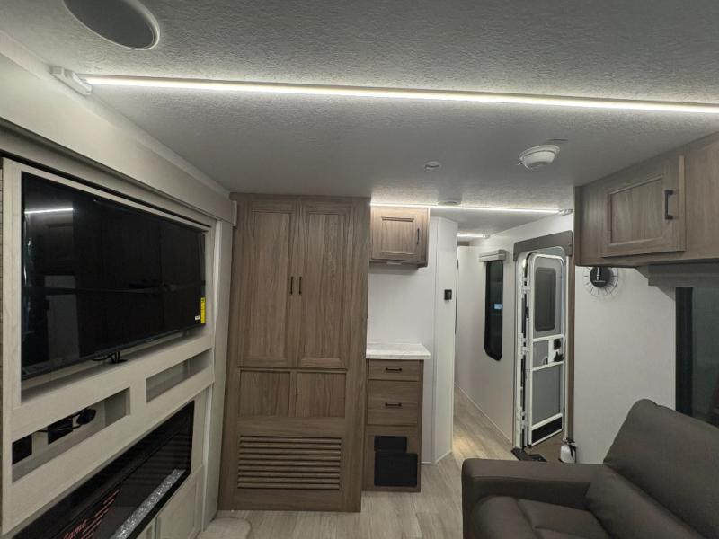 Are you looking for a travel trailer that will feel more like home? Look no further than this model that features a private bedroom up front, a full bath, plus a spacious rear kitchen. You will love to relax on the sofa or opt for the theatre sofa/hide-a-bed sofa across from the Smart TV and fireplace, and there is a booth dinette for dining. This model also includes a hidden pantry behind the TV for smart storage solutions. If the weather is nice you may just want to sit outdoors under the 18' power awning with LED lights. The chef of your group can prepare a meal on the pull-out camp kitchen, and the kids can grab their scooters from the pass-through storage.