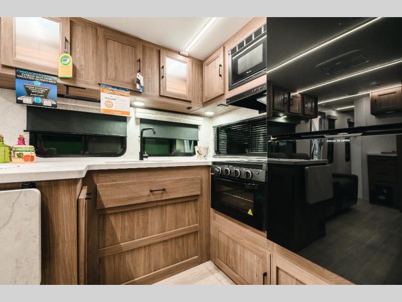 Are you looking for a travel trailer that will feel more like home? Look no further than this model that features a private bedroom up front, a full bath, plus a spacious rear kitchen. You will love to relax on the sofa or opt for the theatre sofa/hide-a-bed sofa across from the Smart TV and fireplace, and there is a booth dinette for dining. This model also includes a hidden pantry behind the TV for smart storage solutions. If the weather is nice you may just want to sit outdoors under the 18' power awning with LED lights. The chef of your group can prepare a meal on the pull-out camp kitchen, and the kids can grab their scooters from the pass-through storage.