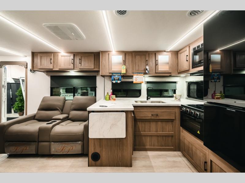 Are you looking for a travel trailer that will feel more like home? Look no further than this model that features a private bedroom up front, a full bath, plus a spacious rear kitchen. You will love to relax on the sofa or opt for the theatre sofa/hide-a-bed sofa across from the Smart TV and fireplace, and there is a booth dinette for dining. This model also includes a hidden pantry behind the TV for smart storage solutions. If the weather is nice you may just want to sit outdoors under the 18' power awning with LED lights. The chef of your group can prepare a meal on the pull-out camp kitchen, and the kids can grab their scooters from the pass-through storage.