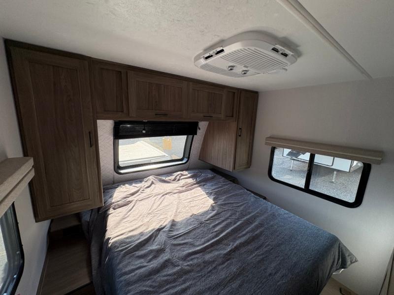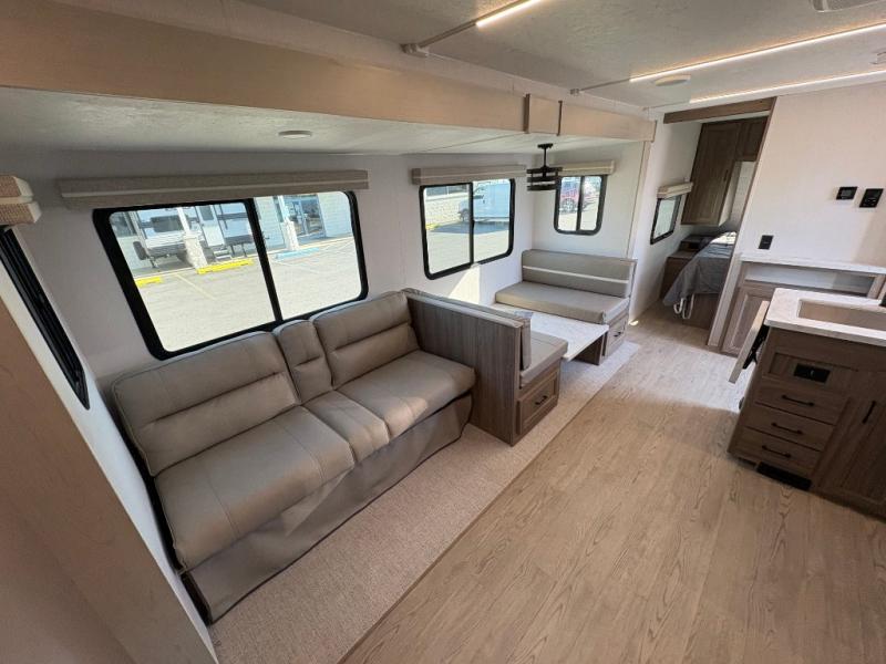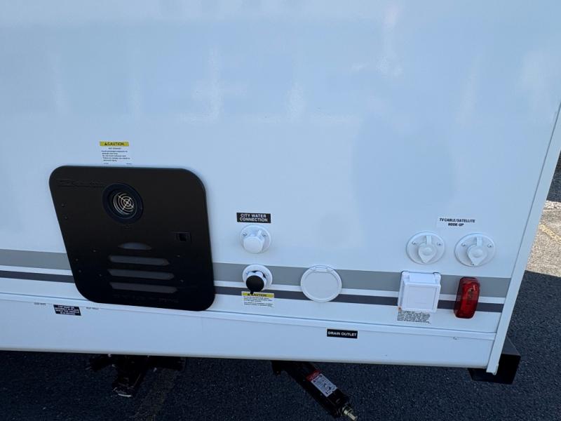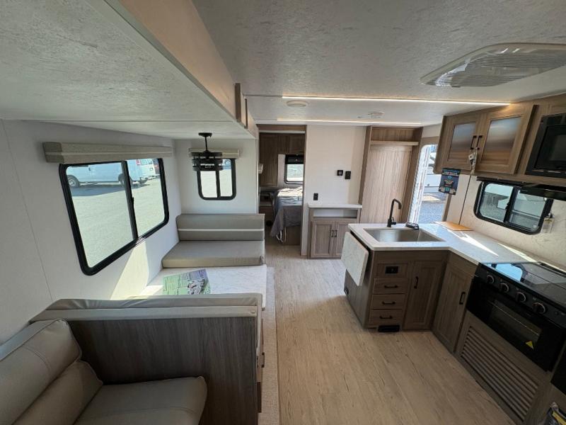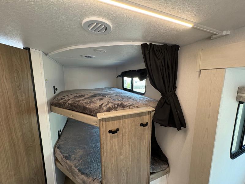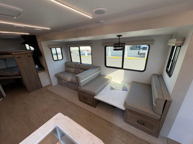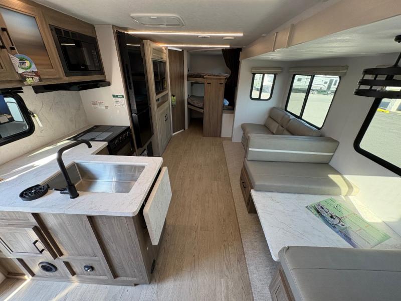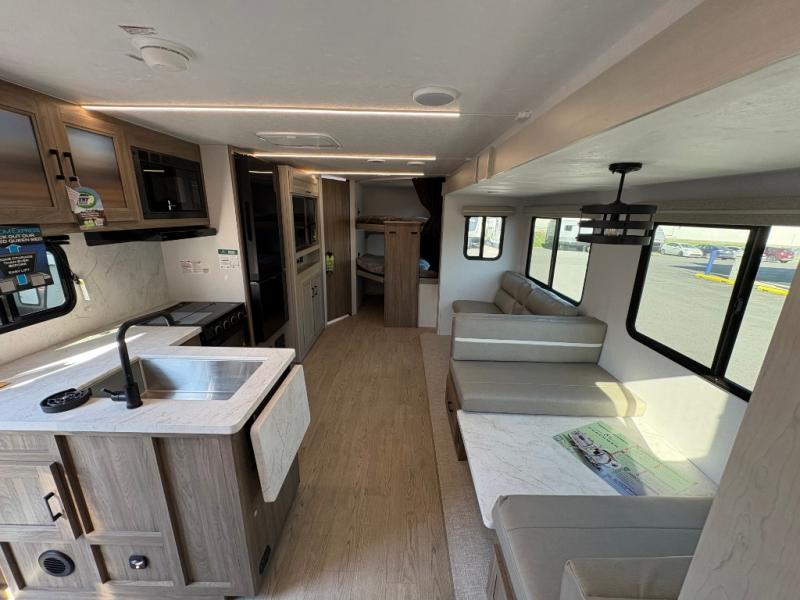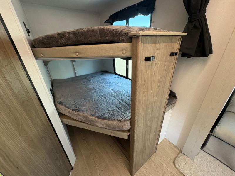 If you're looking for a family-friendly travel trailer, this is the one! The double-size bunks will be perfect for little ones, while you take the front private bedroom with a queen bed. There is also vaulted underbed storage so everything has a place. Within the full bath you'll find one of the dual entry doors for convenience, and the other entry door leads into the combined kitchen and living room. Your crew can dine at the booth dinette or relax on the sofa across from the entertainment center. There is also a hidden pantry behind the TV swivel and plenty of other storage spaces found throughout. The chef of your group will be happy to find a full interior kitchen with a flip-up countertop for more space plus an exterior pull-out camp kitchen with a refrigerator.