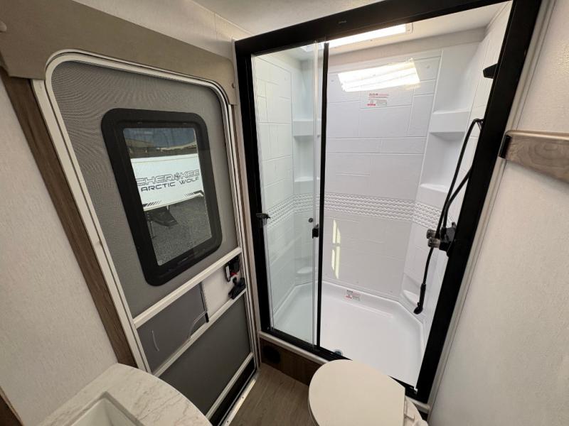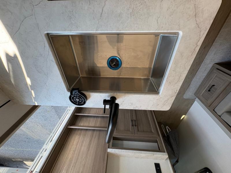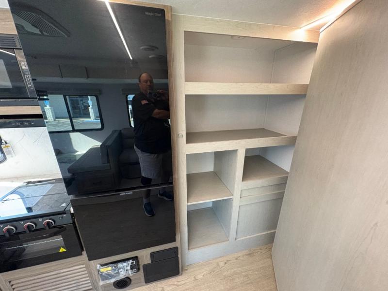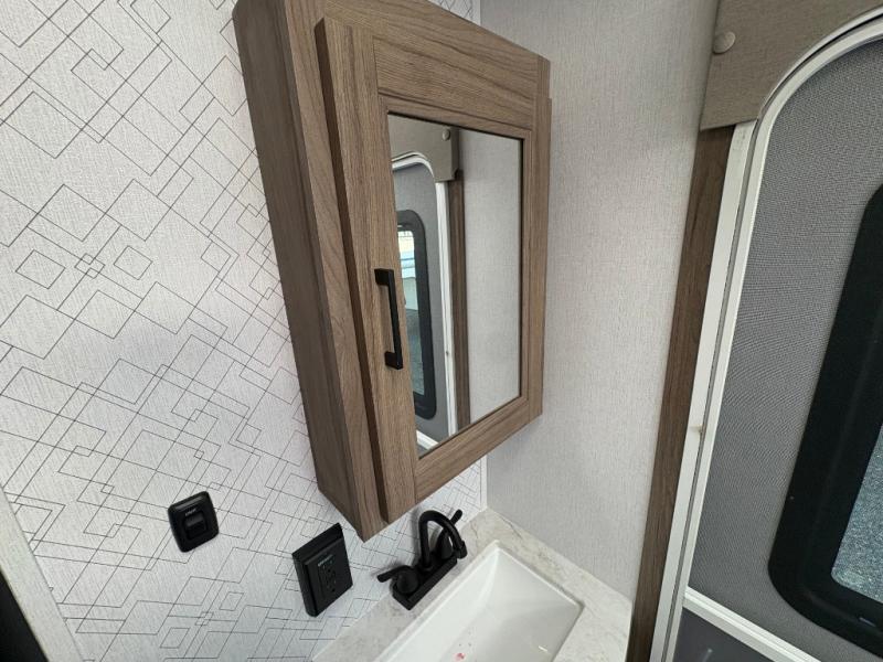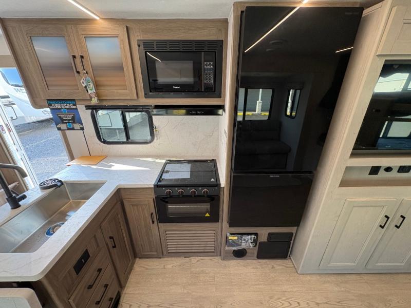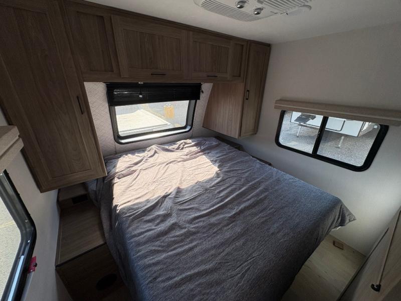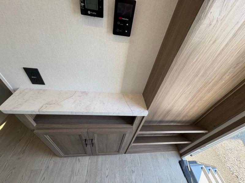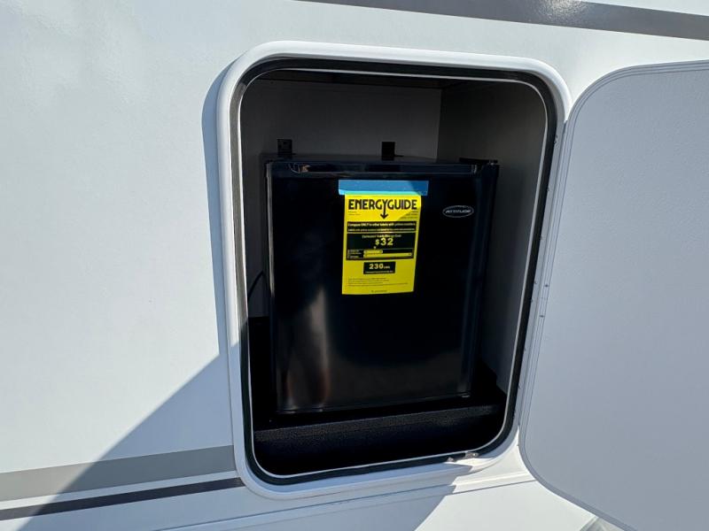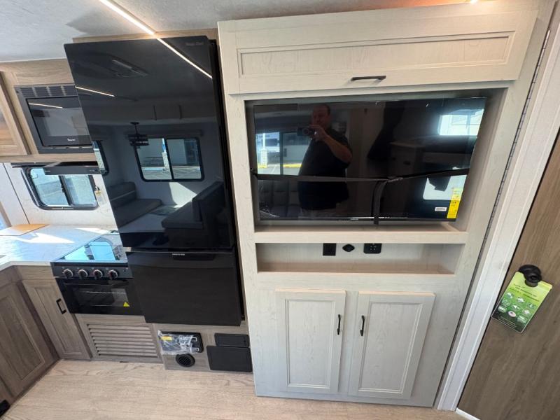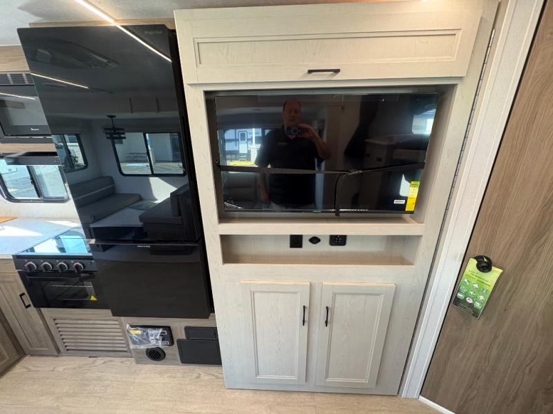 If you're looking for a family-friendly travel trailer, this is the one! The double-size bunks will be perfect for little ones, while you take the front private bedroom with a queen bed. There is also vaulted underbed storage so everything has a place. Within the full bath you'll find one of the dual entry doors for convenience, and the other entry door leads into the combined kitchen and living room. Your crew can dine at the booth dinette or relax on the sofa across from the entertainment center. There is also a hidden pantry behind the TV swivel and plenty of other storage spaces found throughout. The chef of your group will be happy to find a full interior kitchen with a flip-up countertop for more space plus an exterior pull-out camp kitchen with a refrigerator.