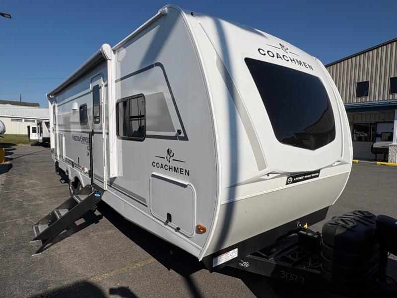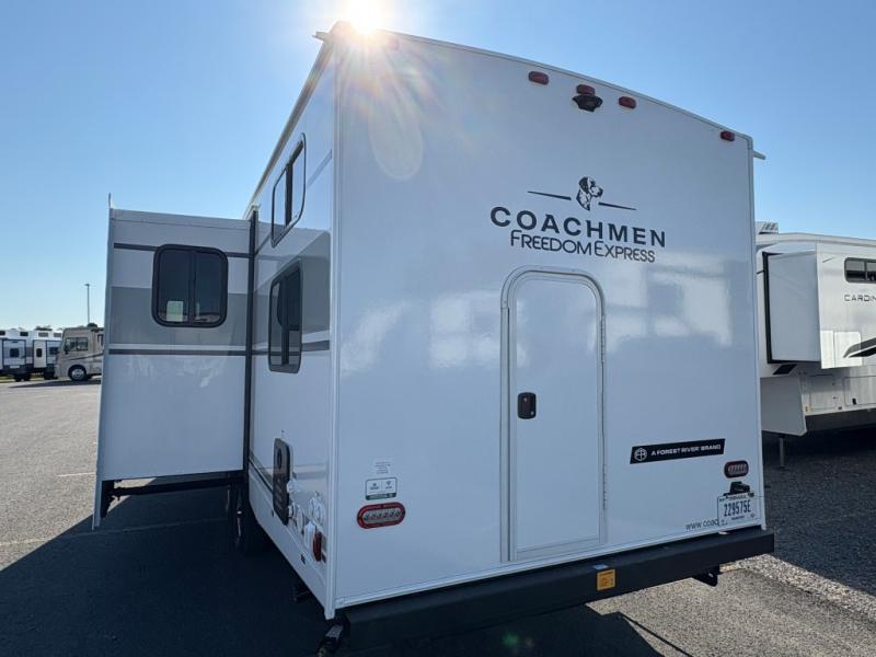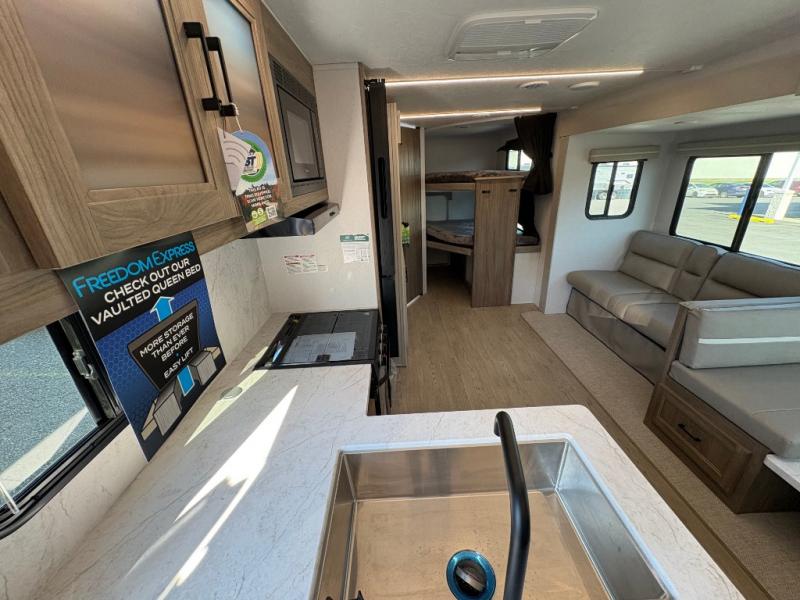 With any Freedom Express Ultra Lite travel trailer by Coachmen you will appreciate quality construction materials, such as vacuum bonded walls with Azdel composite, a 3/4 gel coated fiberglass cap with an automotive glass windshield, and a heated enclosed underbelly. Each model also features Tufflex PVC roofing, front rock guard, and E-Z Lube axles for smooth towing. Inside, you'll find kitchen backsplash, hidden hinge cabinetry, and wear-resistant vinyl flooring throughout. The power tongue jack included with the Ultra Lite Express Package will make set-up a breeze, and each model includes back-up camera prep and they are Freedom solar ready if you plan to go off-grid. Enjoy lightweight camping with a Freedom Express Ultra Lite travel trailer today!