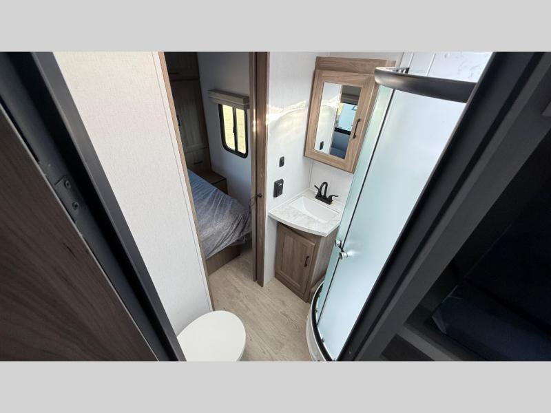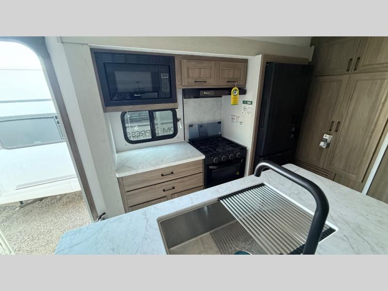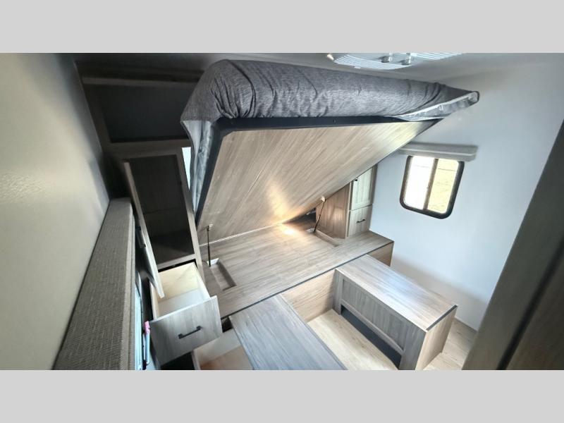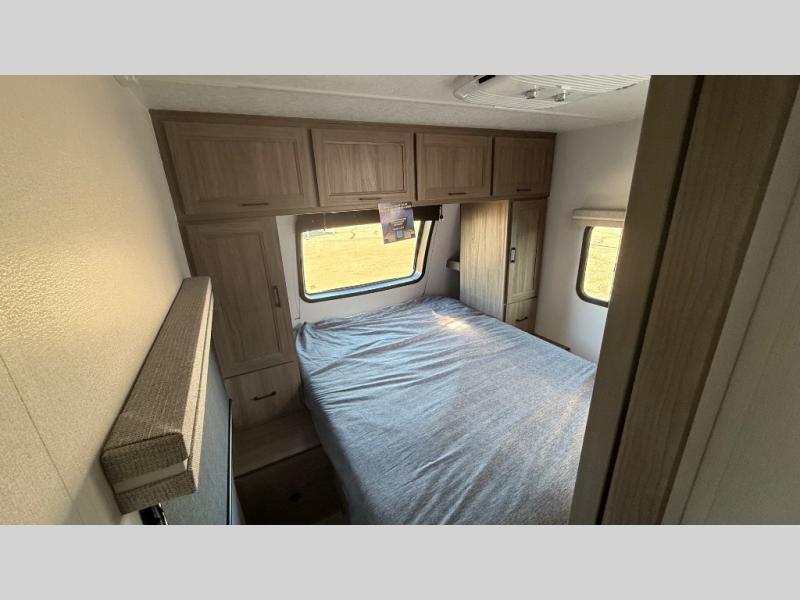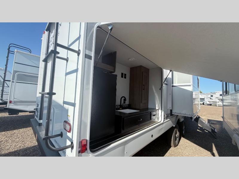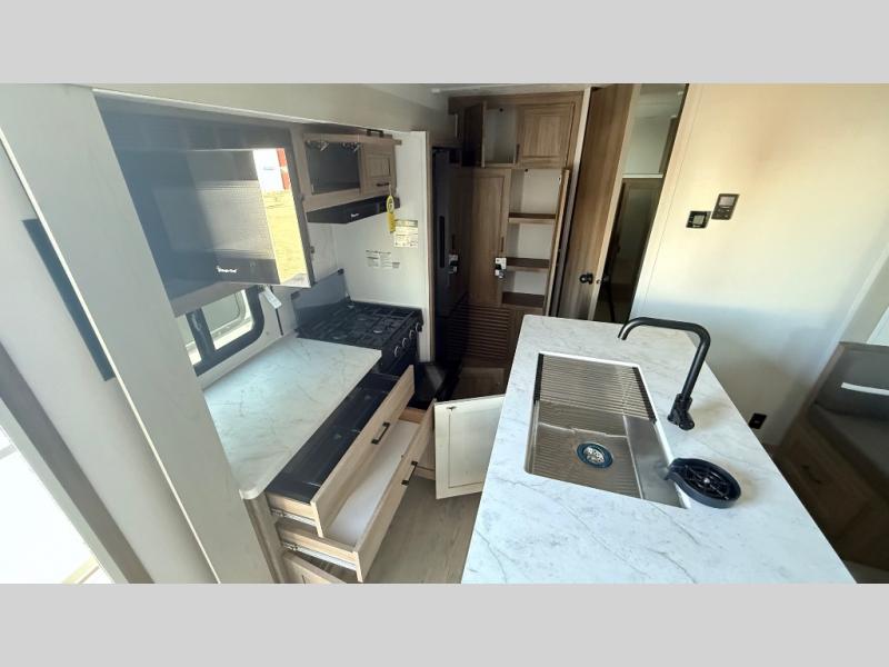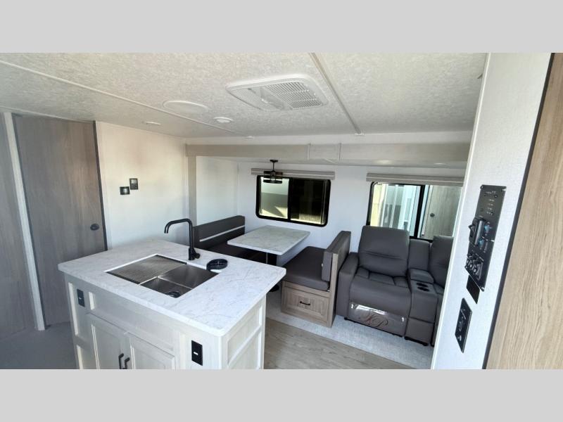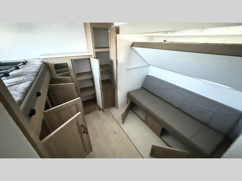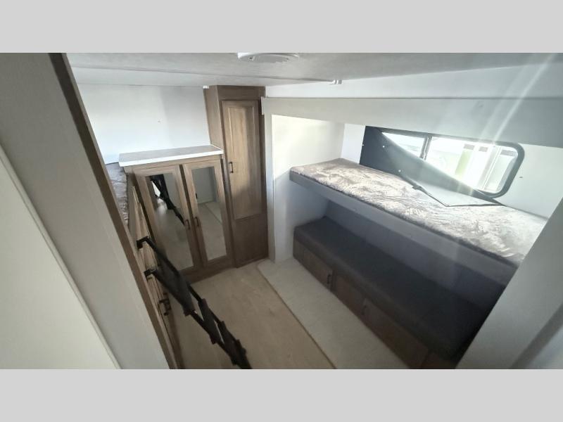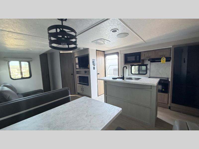 It won't be hard to find comfort and convenience in this travel trailer for eight. Once you've checked in at your campsite, grab your gear from the pass-through storage, put out the 20' awning, then start lunch on the full camp kitchen! If you'd rather cook inside, you'll find a three burner range and a microwave oven to cook meals, along with an 8 cu. ft. double door refrigerator and pantry for food storage, plus a kitchen island for more prep space! The booth dinette provides a place to dine or play games, and the hide-a-bed sofa can be switched out for an optional theater seat if you don't need the additional sleeping space. A stand-out feature on this model is the rear private bunkhouse with a flip-up bunk and roll-over sofa within a slide out, a second bunk across the room, a wardrobe with space for a TV, plus a second wardrobe for storage. And don't overlook the dual entry bath that leads to the front master bedroom, complete with a queen bed with underbed storage and dual wardrobes!