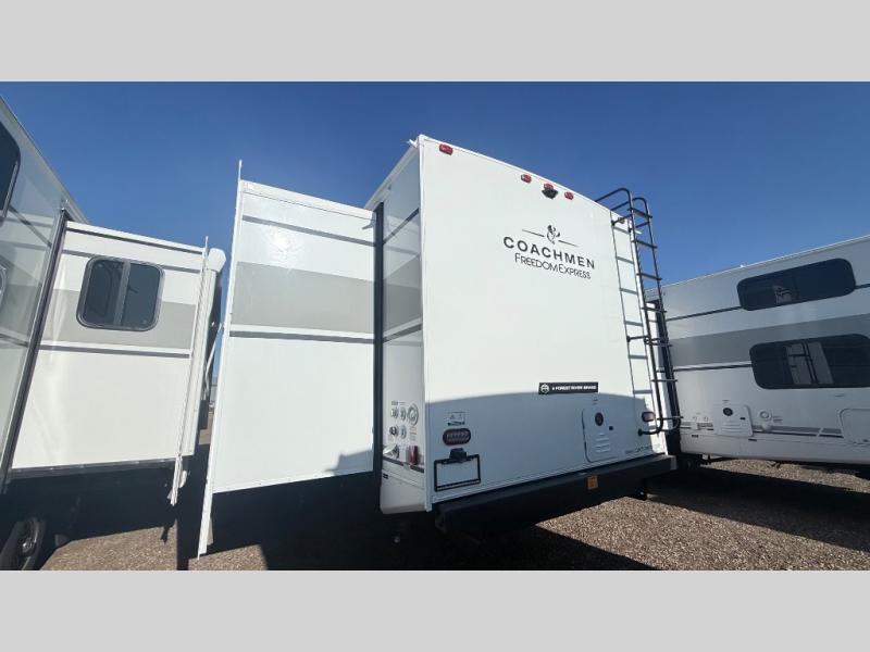 With any Freedom Express Ultra Lite travel trailer by Coachmen you will appreciate quality construction materials, such as vacuum bonded walls with Azdel composite, a 3/4 gel coated fiberglass cap with an automotive glass windshield, and a heated enclosed underbelly. Each model also features Tufflex PVC roofing, front rock guard, and E-Z Lube axles for smooth towing. Inside, you'll find kitchen backsplash, hidden hinge cabinetry, and wear-resistant vinyl flooring throughout. The power tongue jack included with the Ultra Lite Express Package will make set-up a breeze, and each model includes back-up camera prep and they are Freedom solar ready if you plan to go off-grid. Enjoy lightweight camping with a Freedom Express Ultra Lite travel trailer today!