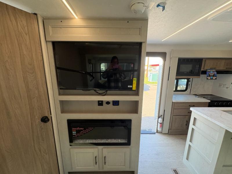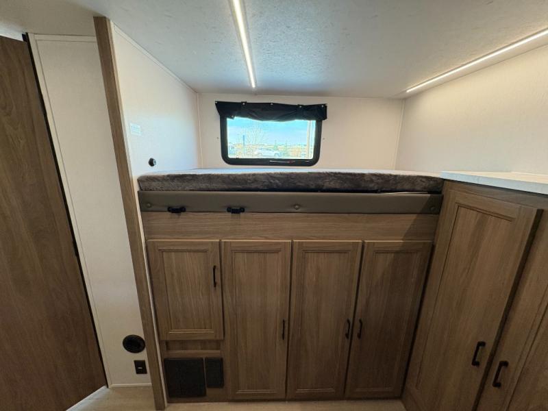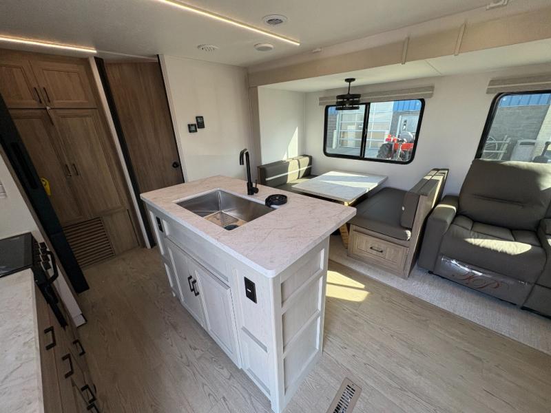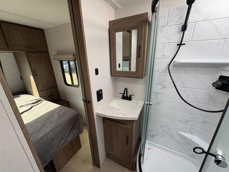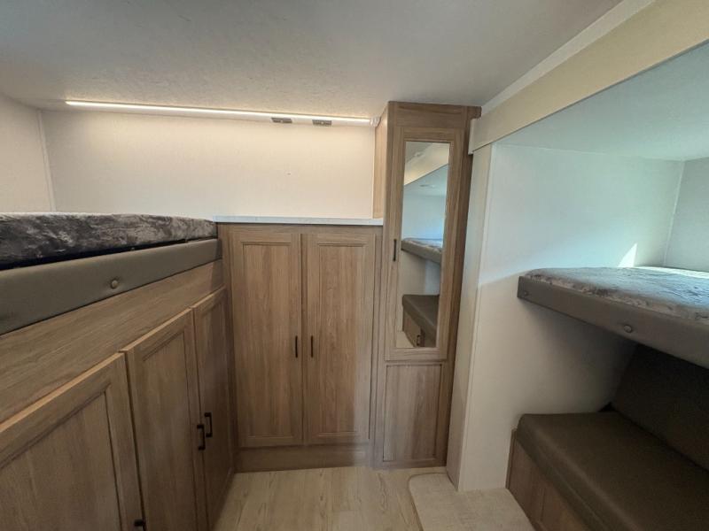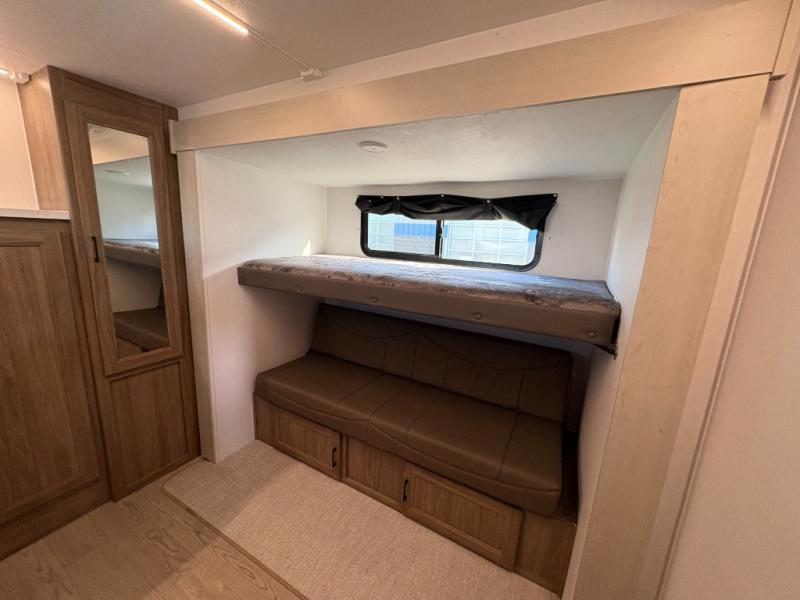 It won't be hard to find comfort and convenience in this travel trailer for eight. Once you've checked in at your campsite, grab your gear from the pass-through storage, put out the 20' awning, then start lunch on the full camp kitchen! If you'd rather cook inside, you'll find a three burner range and a microwave oven to cook meals, along with an 8 cu. ft. double door refrigerator and pantry for food storage, plus a kitchen island for more prep space! The booth dinette provides a place to dine or play games, and the hide-a-bed sofa can be switched out for an optional theater seat if you don't need the additional sleeping space. A stand-out feature on this model is the rear private bunkhouse with a flip-up bunk and roll-over sofa within a slide out, a second bunk across the room, a wardrobe with space for a TV, plus a second wardrobe for storage. And don't overlook the dual entry bath that leads to the front master bedroom, complete with a queen bed with underbed storage and dual wardrobes!