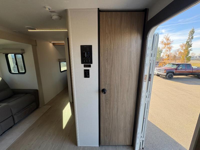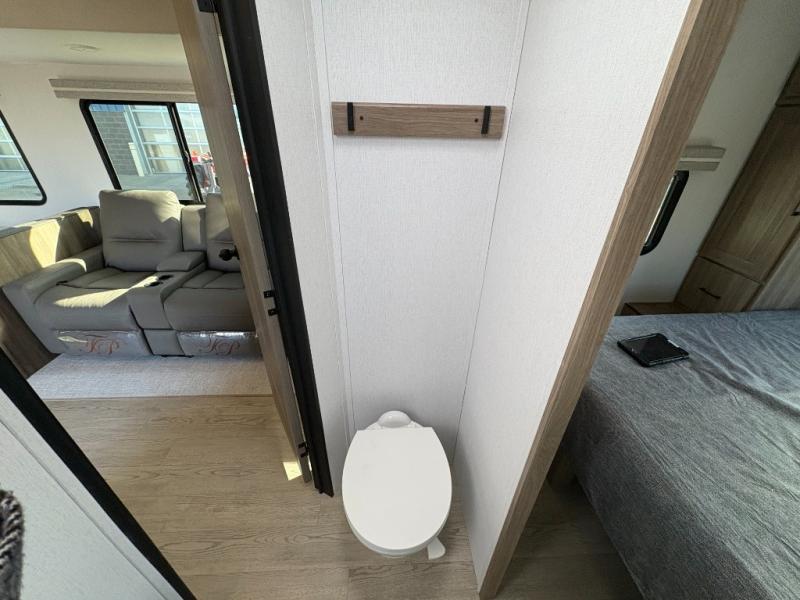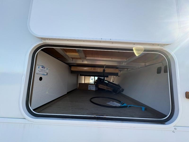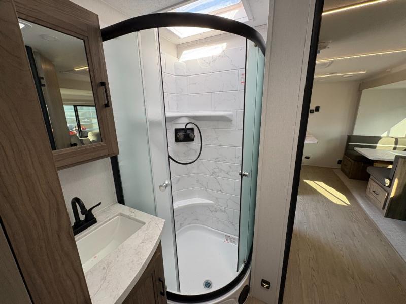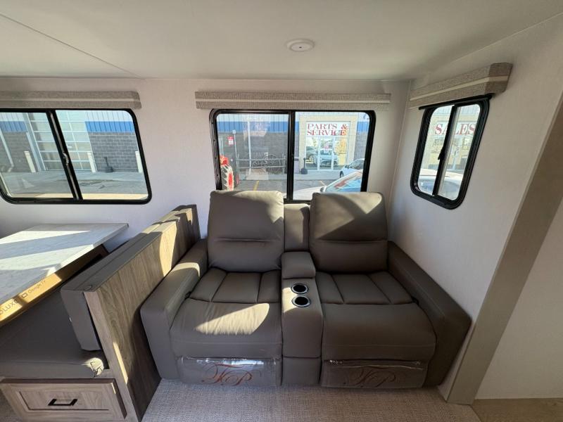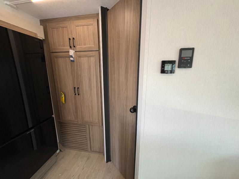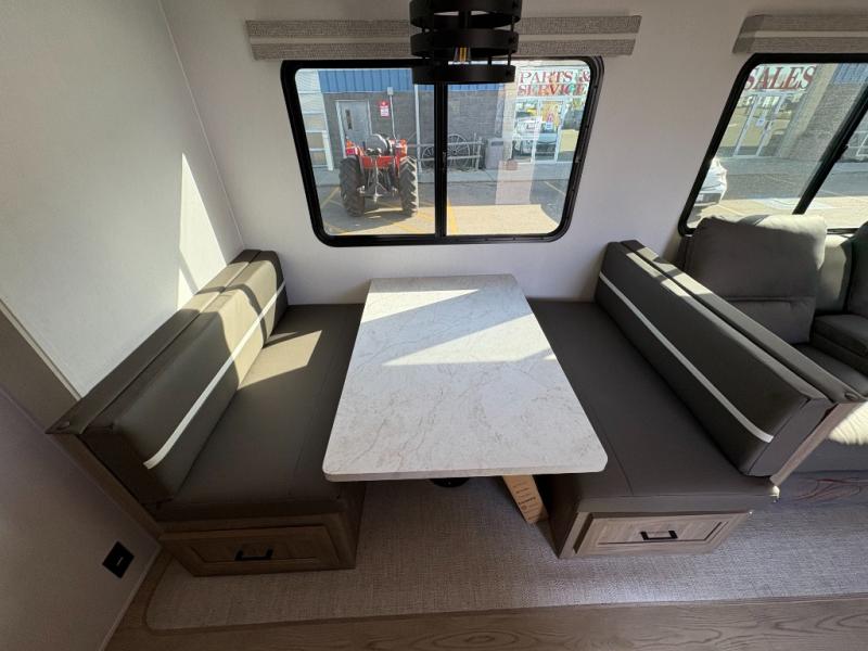 It won't be hard to find comfort and convenience in this travel trailer for eight. Once you've checked in at your campsite, grab your gear from the pass-through storage, put out the 20' awning, then start lunch on the full camp kitchen! If you'd rather cook inside, you'll find a three burner range and a microwave oven to cook meals, along with an 8 cu. ft. double door refrigerator and pantry for food storage, plus a kitchen island for more prep space! The booth dinette provides a place to dine or play games, and the hide-a-bed sofa can be switched out for an optional theater seat if you don't need the additional sleeping space. A stand-out feature on this model is the rear private bunkhouse with a flip-up bunk and roll-over sofa within a slide out, a second bunk across the room, a wardrobe with space for a TV, plus a second wardrobe for storage. And don't overlook the dual entry bath that leads to the front master bedroom, complete with a queen bed with underbed storage and dual wardrobes!