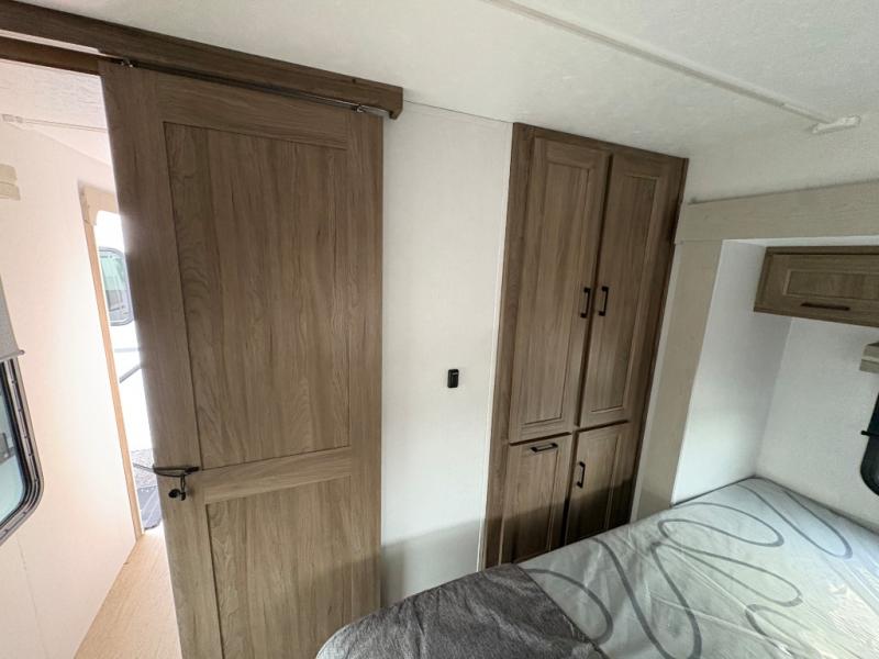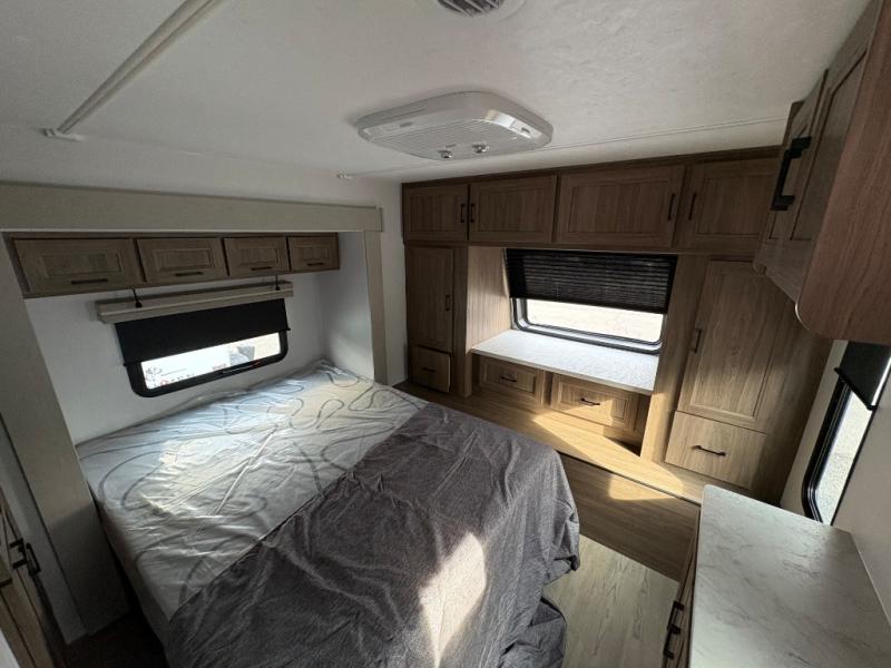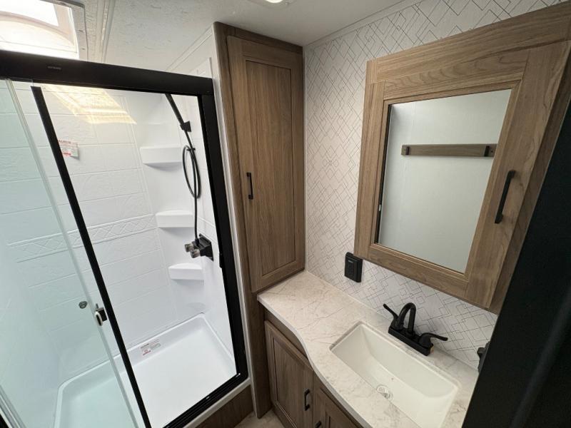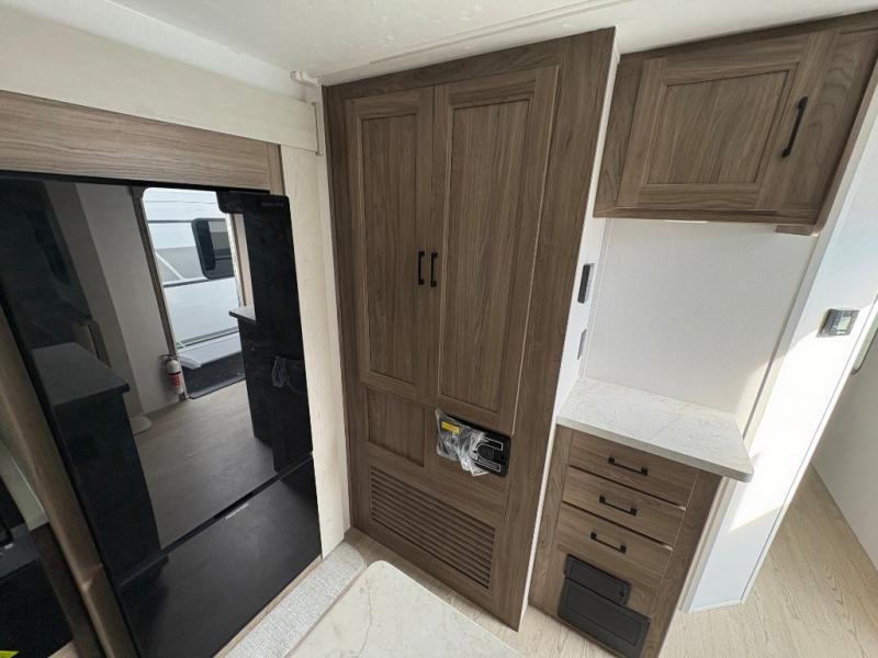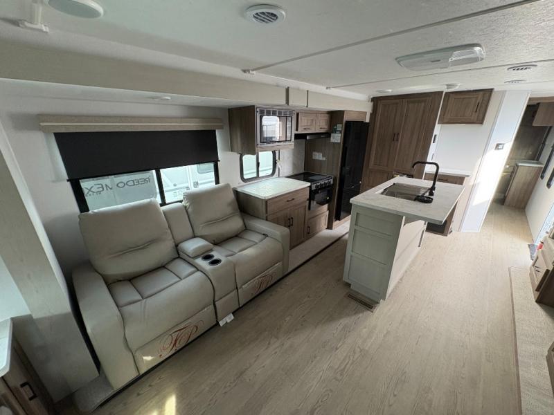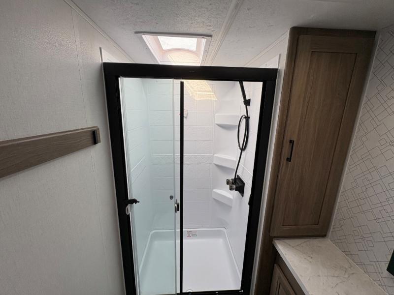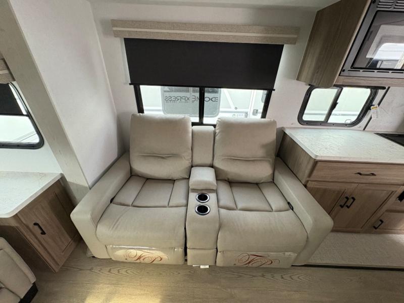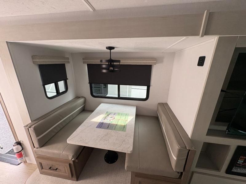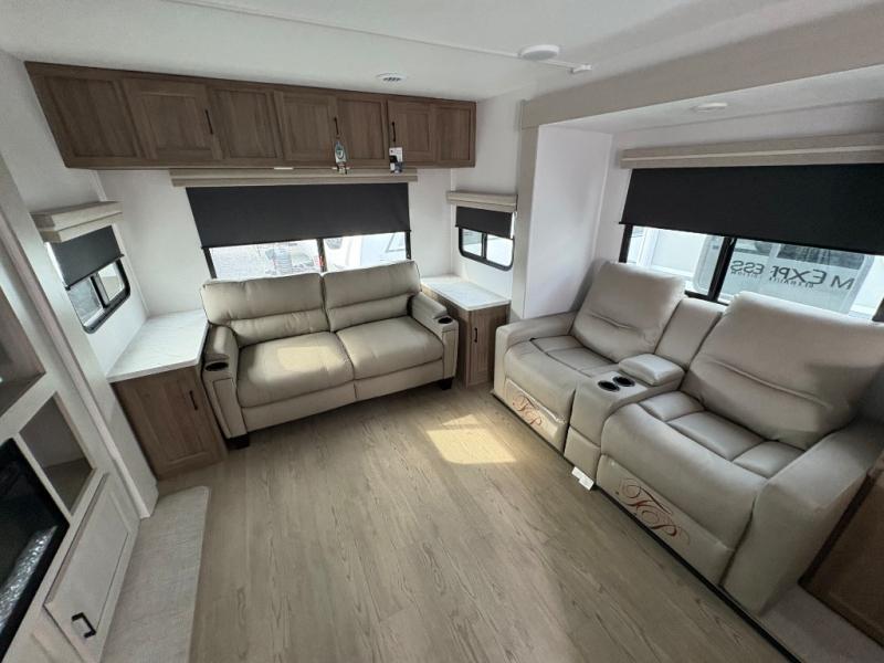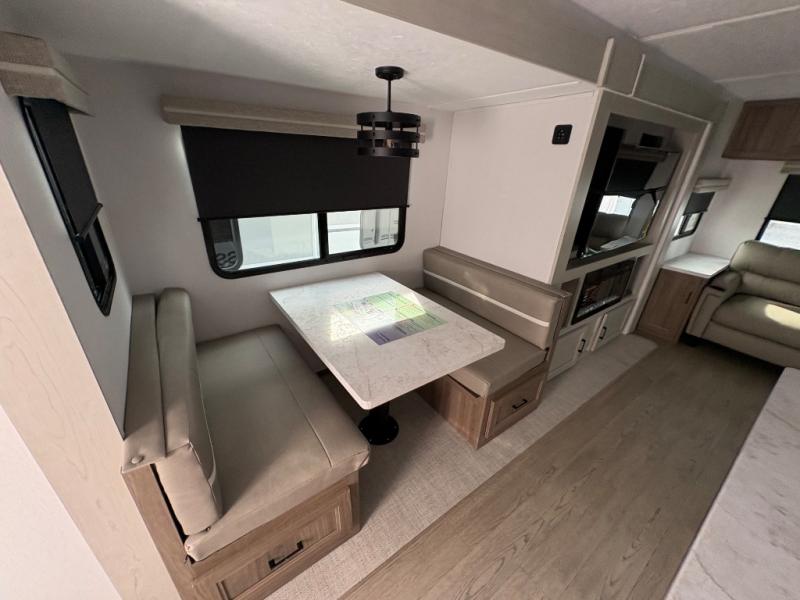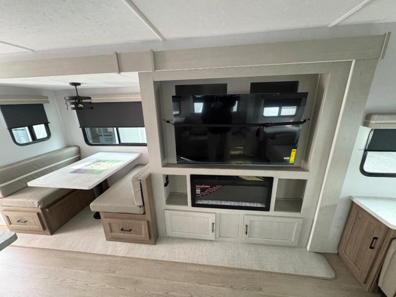 This travel trailer has fantastic spaces both inside and out! The rear living area is ready for your group with a pair of theater seats and a hide-a-bed sofa. Everyone will enjoy gathering by the entertainment center which features a cozy fireplace for those chilly nights. The kitchen has a convenient island with sink for easy meal prep. A roomy booth dinette is great for meals or snacks. The queen bedroom offers privacy plus a ton of storage like dual wardrobes and dressers, and even a linen closet equipped with a convenient laundry bag. The full bath has a 30" x 36" shower. Outside you'll find even more room to gather with two power awnings and a camp kitchen with refrigerator so you can grab drinks or snacks on the go.