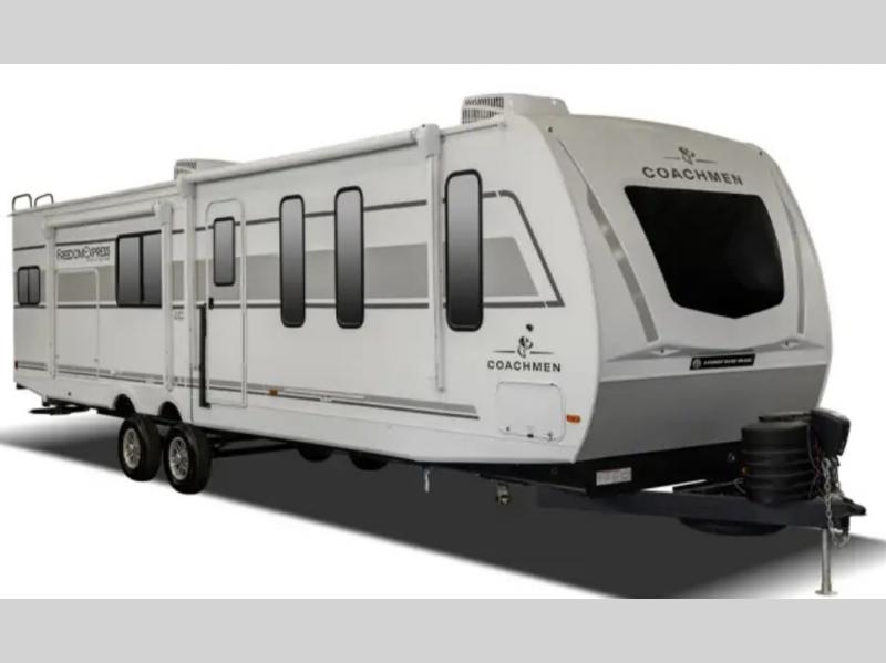 With any Freedom Express Ultra Lite travel trailer by Coachmen you will appreciate quality construction materials, such as vacuum bonded walls with Azdel composite, a 3/4 gel coated fiberglass cap with an automotive glass windshield, and a heated enclosed underbelly. Each model also features Tufflex PVC roofing, front rock guard, and E-Z Lube axles for smooth towing. Inside, you'll find kitchen backsplash, hidden hinge cabinetry, and wear-resistant vinyl flooring throughout. The power tongue jack included with the Ultra Lite Express Package will make set-up a breeze, and each model includes back-up camera prep and they are Freedom solar ready if you plan to go off-grid. Enjoy lightweight camping with a Freedom Express Ultra Lite travel trailer today!