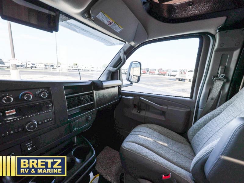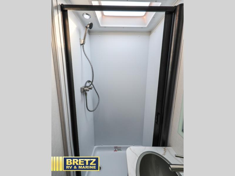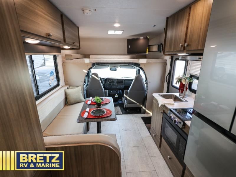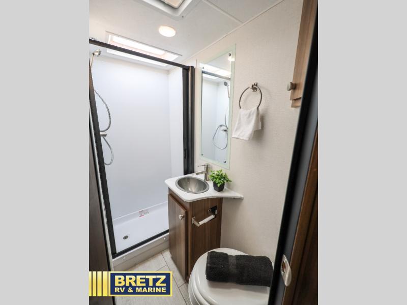 You will be met with comfort at every turn in this coach for six! Once you have stopped for the day, you can make lunch on the three burner cooktop and grab a cold drink from the 10 cu. ft. 12V refrigerator. There is a J-lounge with a pedestal table and extension where you can dine together, and the swing-arm TV in the cab will let you check the weather before heading outdoors. The rear corner full bath will let everyone freshen up when you return from hiking, and you'll enjoy a queen bed to sleep on each night, while your guest take the J-lounge and cab-over bunk!