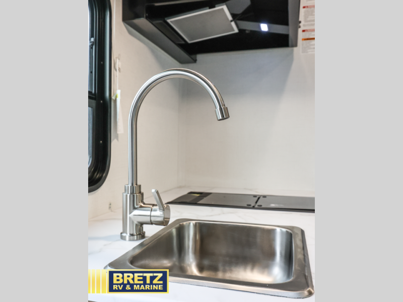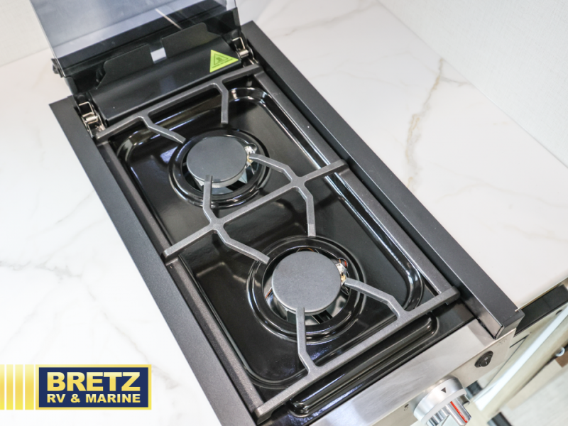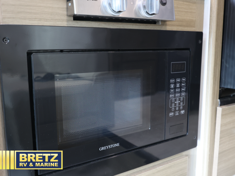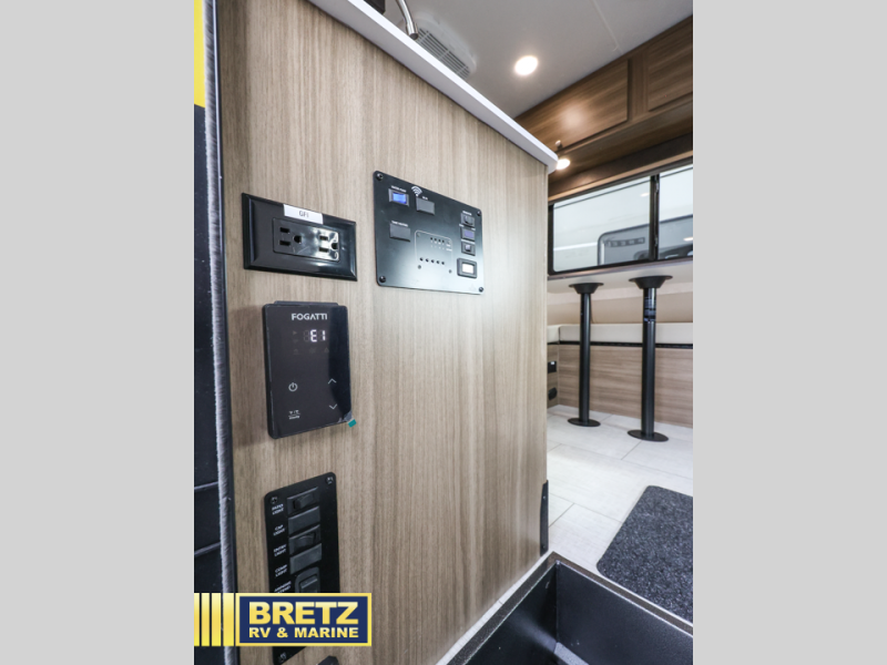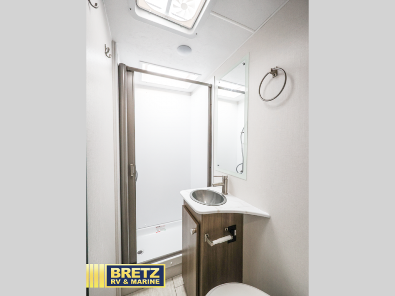 You will be met with comfort at every turn in this coach for six! Once you have stopped for the day, you can make lunch on the three burner cooktop and grab a cold drink from the 10 cu. ft. 12V refrigerator. There is a J-lounge with a pedestal table and extension where you can dine together, and the swing-arm TV in the cab will let you check the weather before heading outdoors. The rear corner full bath will let everyone freshen up when you return from hiking, and you'll enjoy a queen bed to sleep on each night, while your guest take the J-lounge and cab-over bunk!