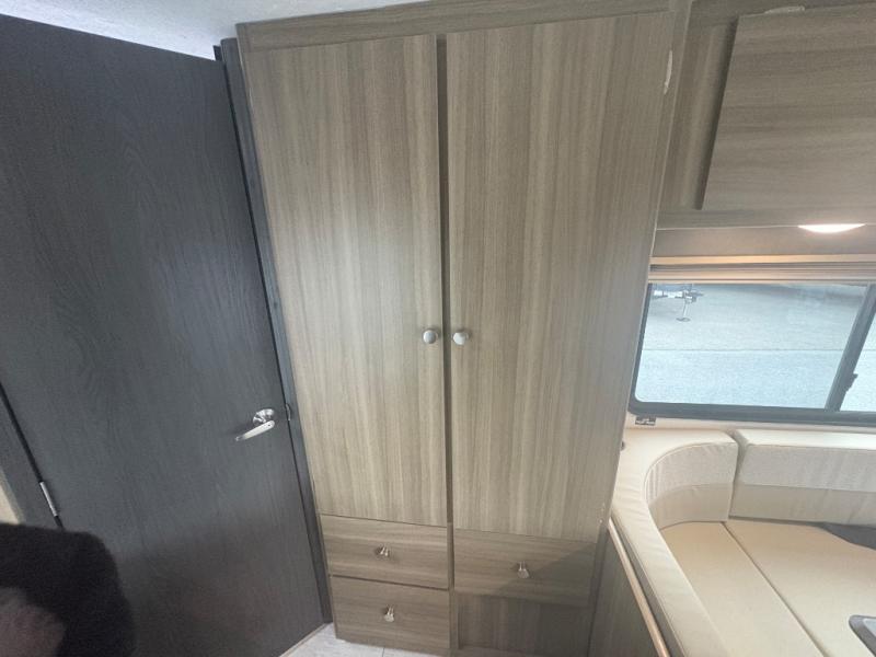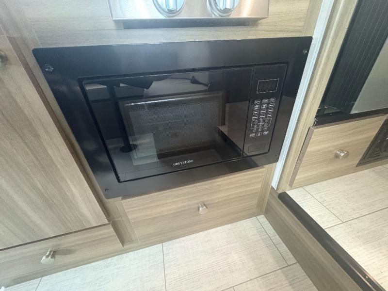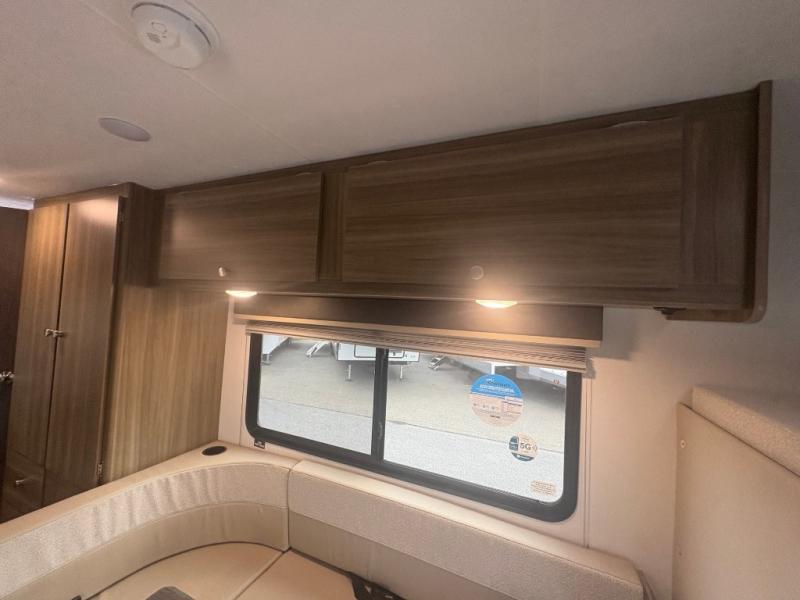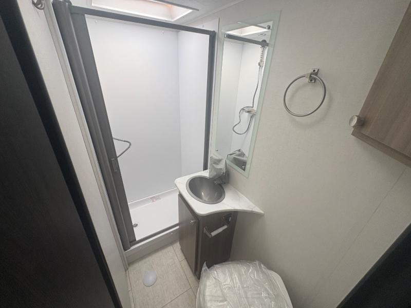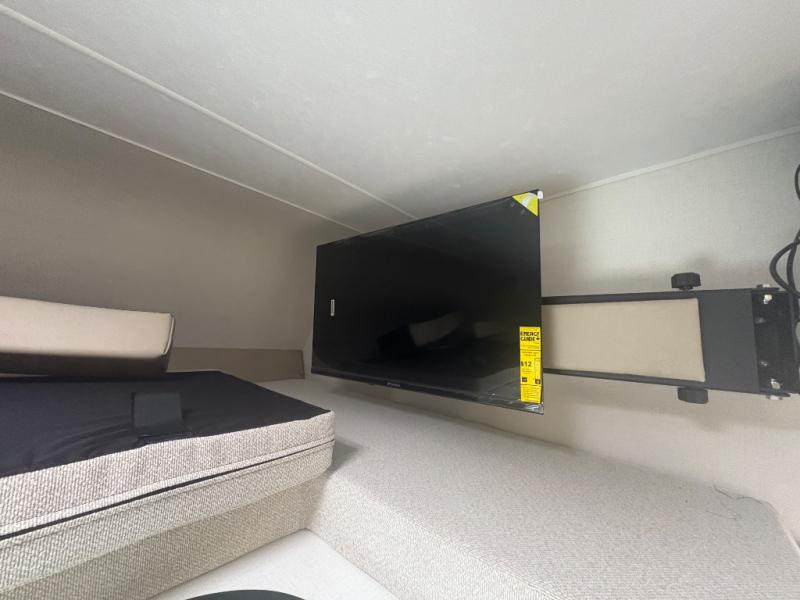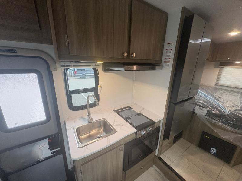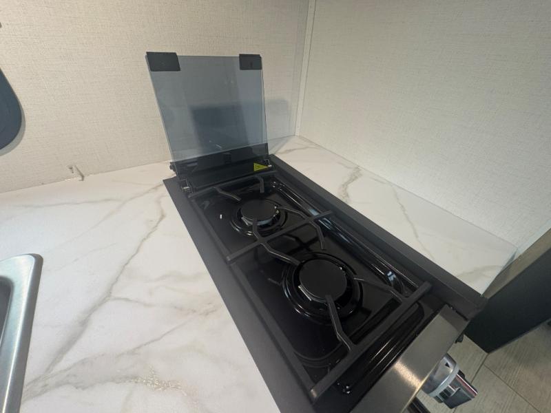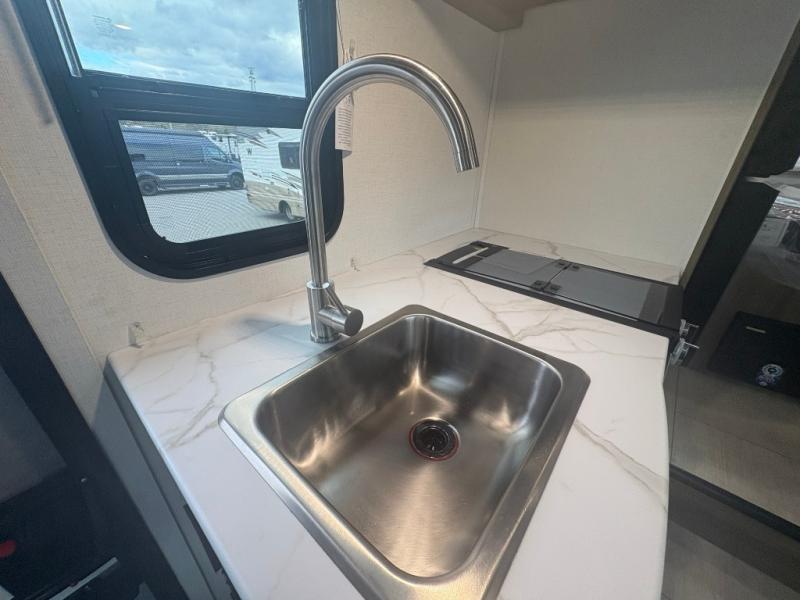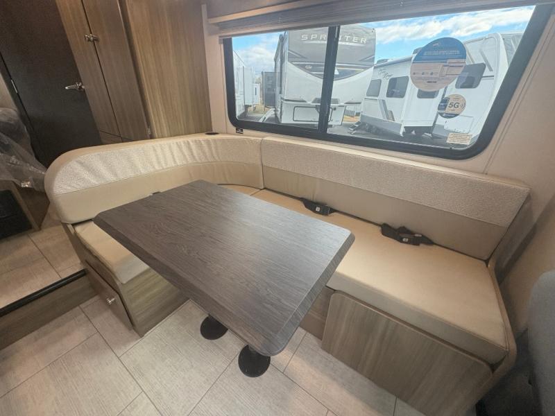 You will be met with comfort at every turn in this coach for six! Once you have stopped for the day, you can make lunch on the three burner cooktop and grab a cold drink from the 10 cu. ft. 12V refrigerator. There is a J-lounge with a pedestal table and extension where you can dine together, and the swing-arm TV in the cab will let you check the weather before heading outdoors. The rear corner full bath will let everyone freshen up when you return from hiking, and you'll enjoy a queen bed to sleep on each night, while your guest take the J-lounge and cab-over bunk!