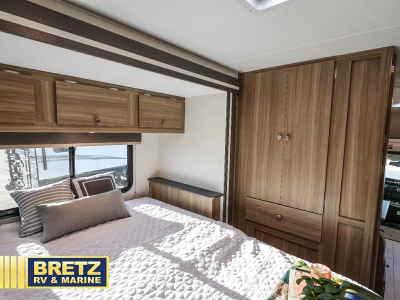 With any Freelander SS Class C gas motorhome by Coachmen, you will find a quality constructed coach for all your journeys. There is AlphaPly TPO seamless one-piece roof material and a max-length power awning with an LED light strip so you can enjoy evenings outdoors. You will also find a molded fiberglass front cap, a rotocast rear warehouse storage compartment, and an upgraded exterior safety grab handle. The mandatory SS Package includes a tankless water heater, running boards, and a towing hitch for your hauling needs. Head inside to enjoy the premium one-piece Thermofoil countertops and vinyl flooring, brushed nickle hardware, pleated night shades, and many more comforts.