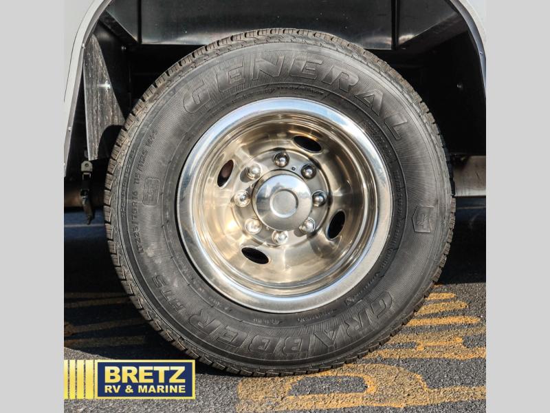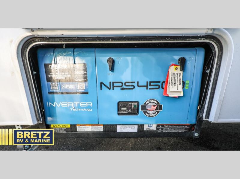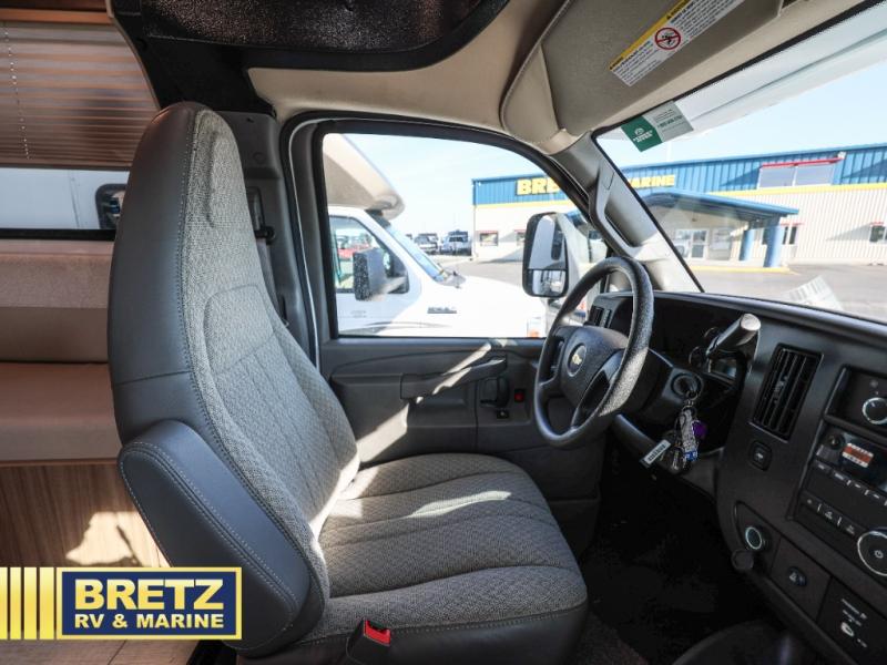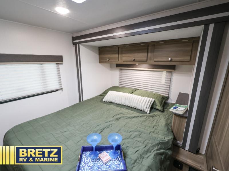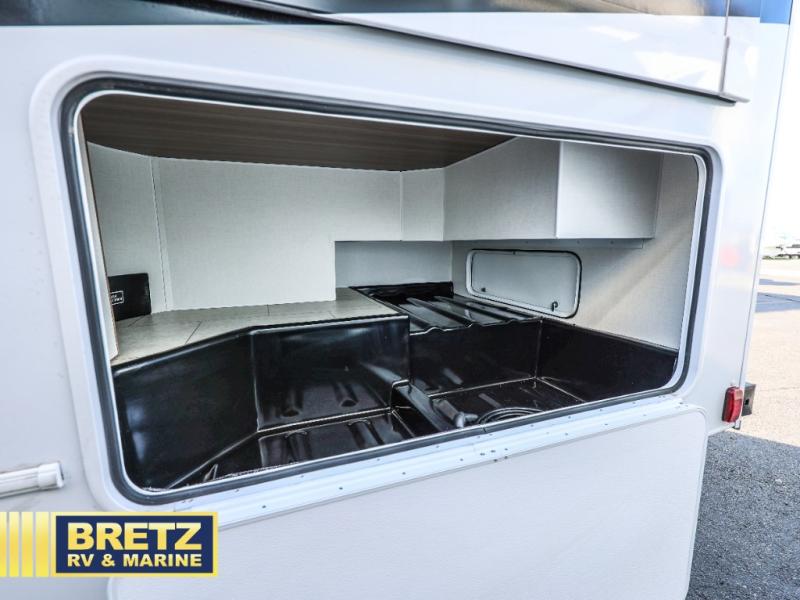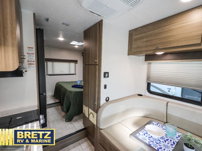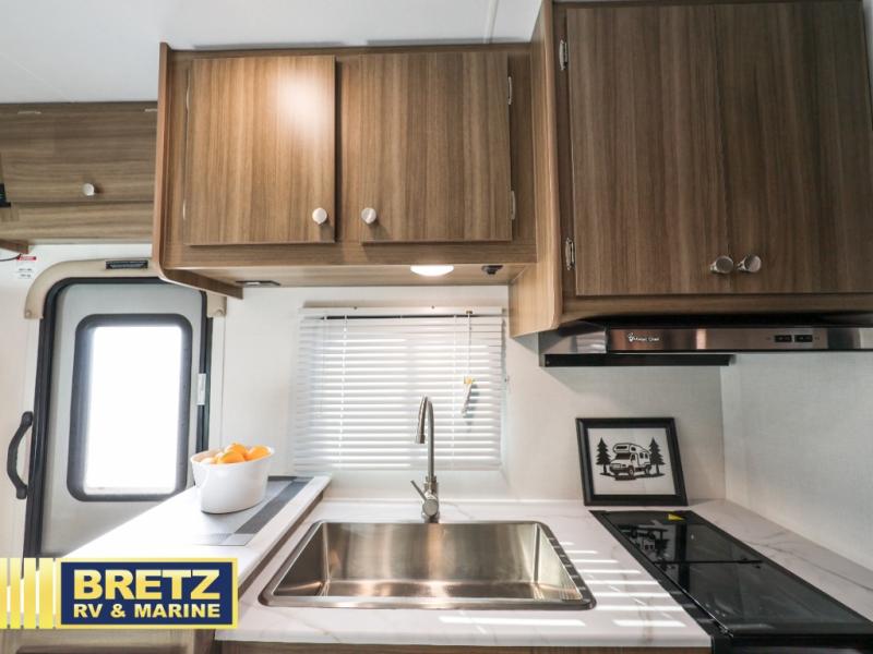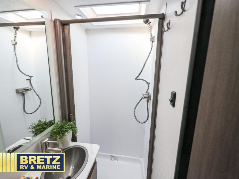 You will be met with comfort at every turn in this coach for six! Once you have stopped for the day, you can make lunch on the three burner cooktop and grab a cold drink from the 10 cu. ft. 12V refrigerator. There is a J-lounge with a pedestal table and extension where you can dine together, and the swing-arm TV in the cab will let you check the weather before heading outdoors. The rear corner full bath will let everyone freshen up when you return from hiking, and you'll enjoy a queen bed slide out to sleep on each night, while your guest take the J-lounge and cab-over bunk!