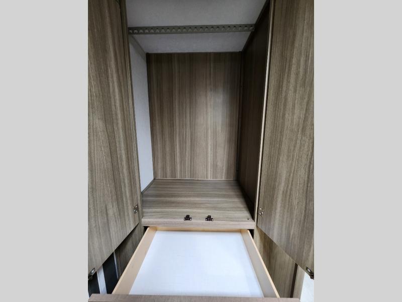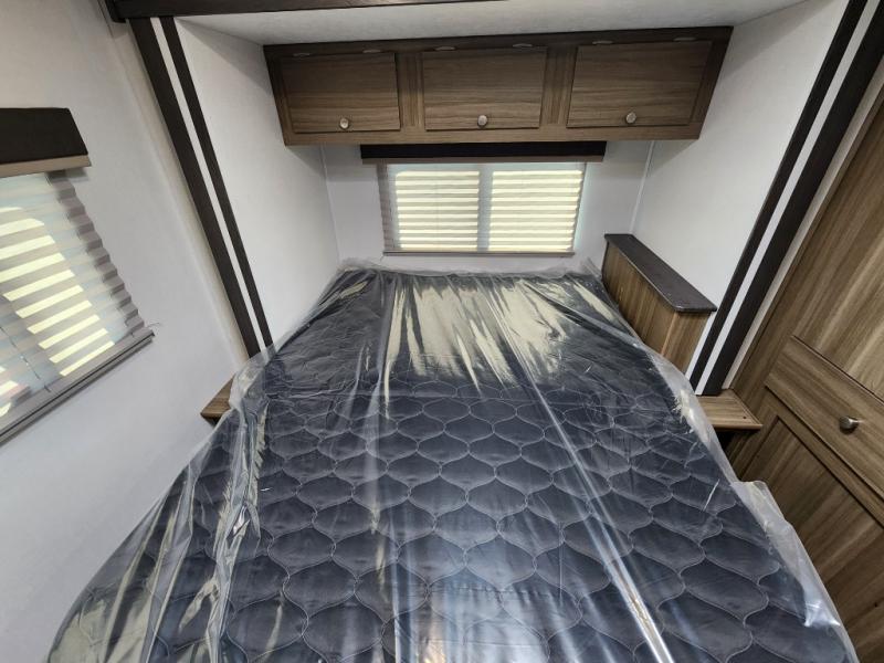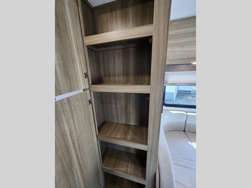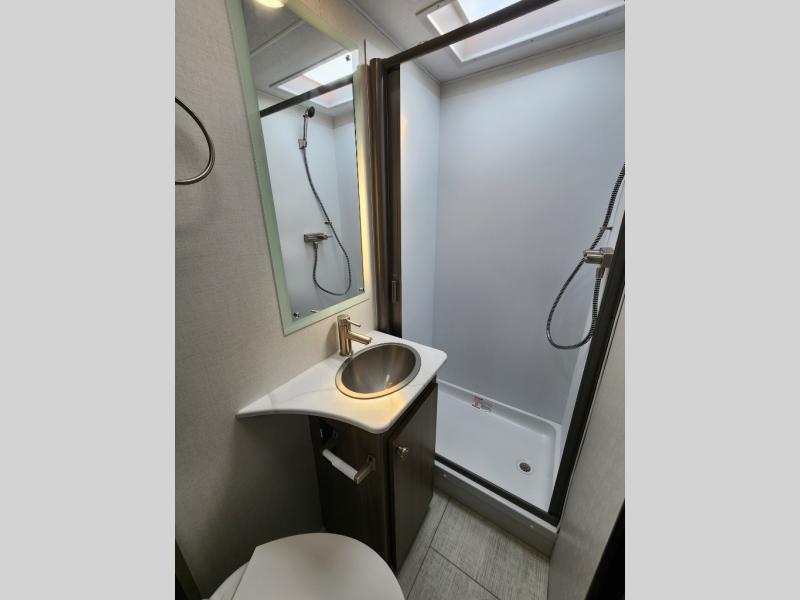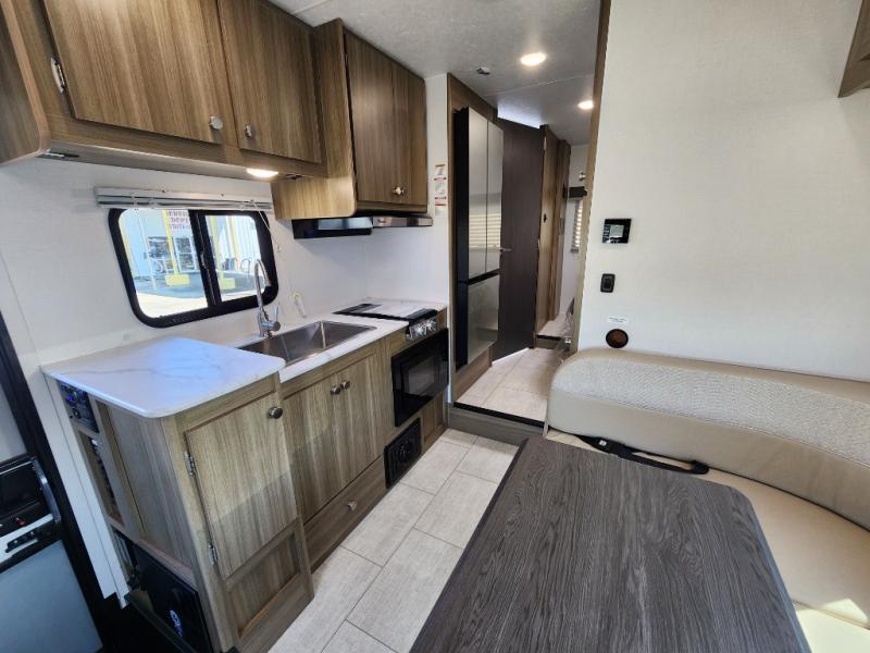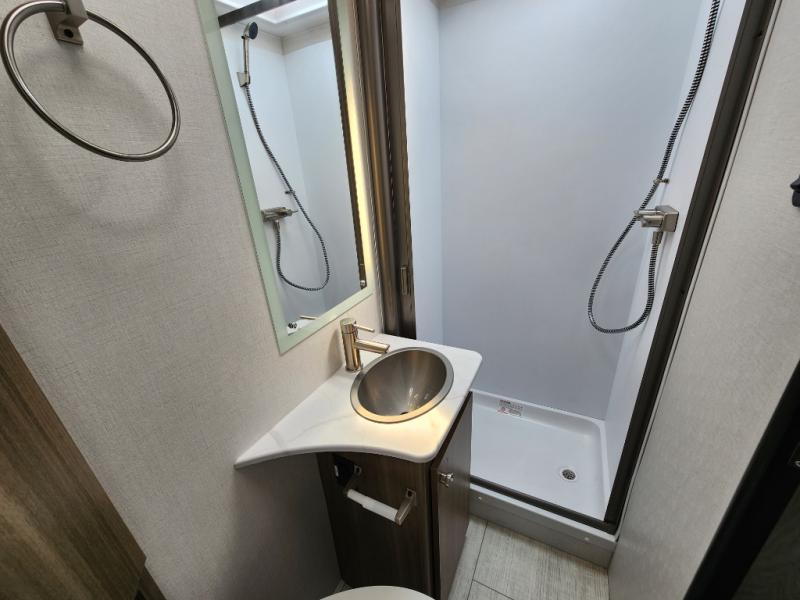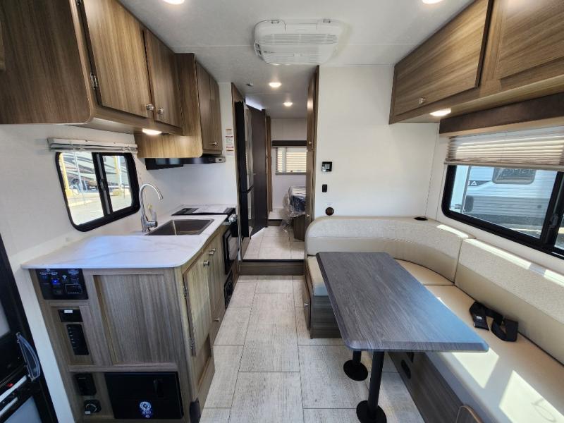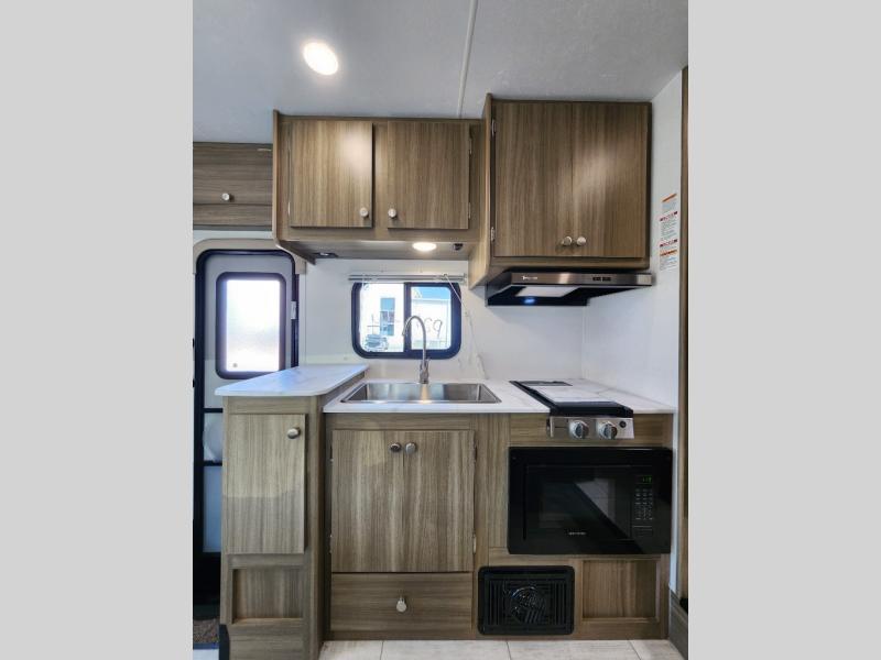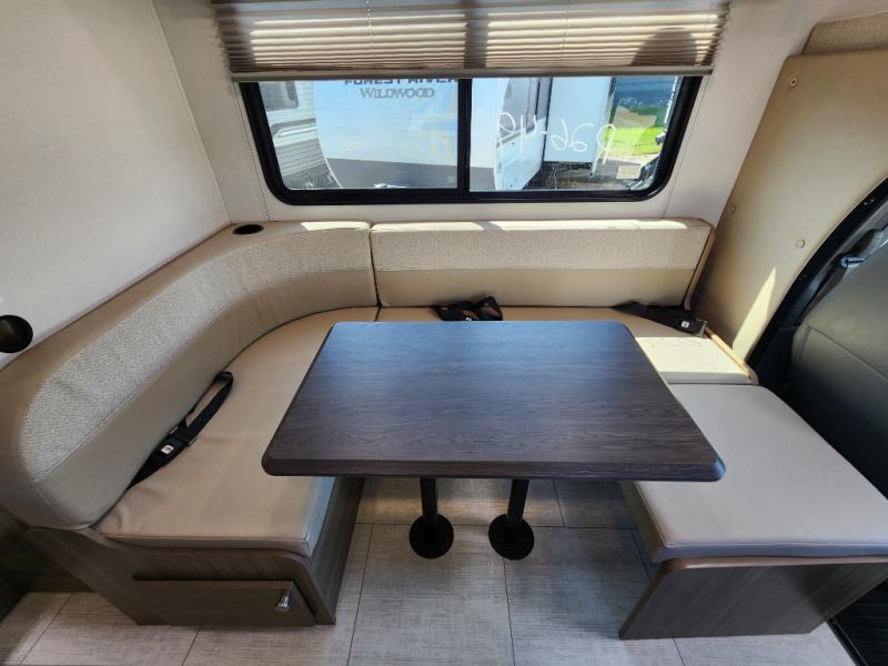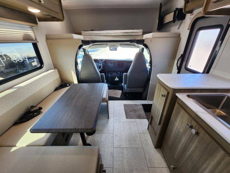 You will be met with comfort at every turn in this coach for six! Once you have stopped for the day, you can make lunch on the three burner cooktop and grab a cold drink from the 10 cu. ft. 12V refrigerator. There is a J-lounge with a pedestal table and extension where you can dine together, and the swing-arm TV in the cab will let you check the weather before heading outdoors. The rear corner full bath will let everyone freshen up when you return from hiking, and you'll enjoy a queen bed slide out to sleep on each night, while your guest take the J-lounge and cab-over bunk!
