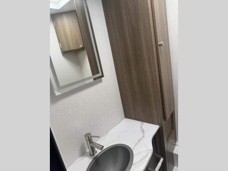 Sneak off for a getaway in this motorhome that has everything you might need! The private rear bedroom has a 60” x 80” queen bed with storage on either side and plenty of room to walk around. The bathroom is split with the shower on one side and the sink and toilet behind a separate door so sharing is a breeze. Relax up front on either the sofa or the roomy 42” x 71” dinette with cabinets above for all your supplies. A bunk over the cab provides yet another sleeping area that will be popular with little ones. Time to get out there in the Freelander!
