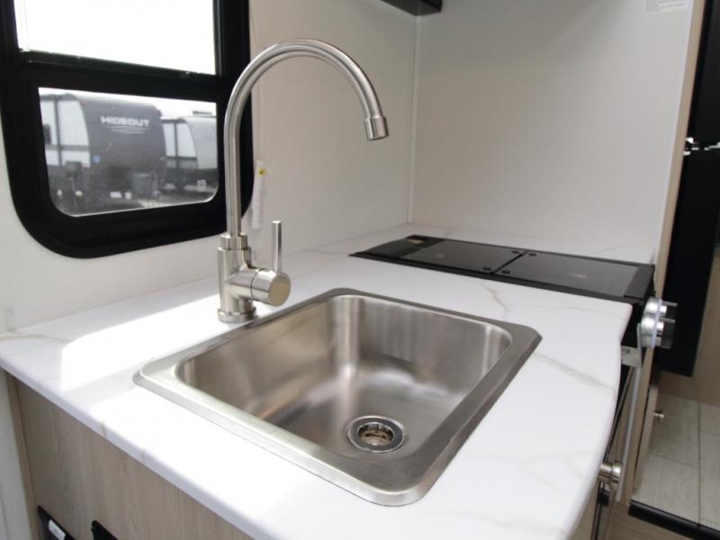 You’ll also appreciate the on-demand tankless water heater, 15,000 BTU air conditioner, and dash radio with backup monitor for easy travel days and cozy nights.