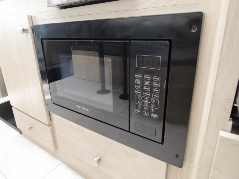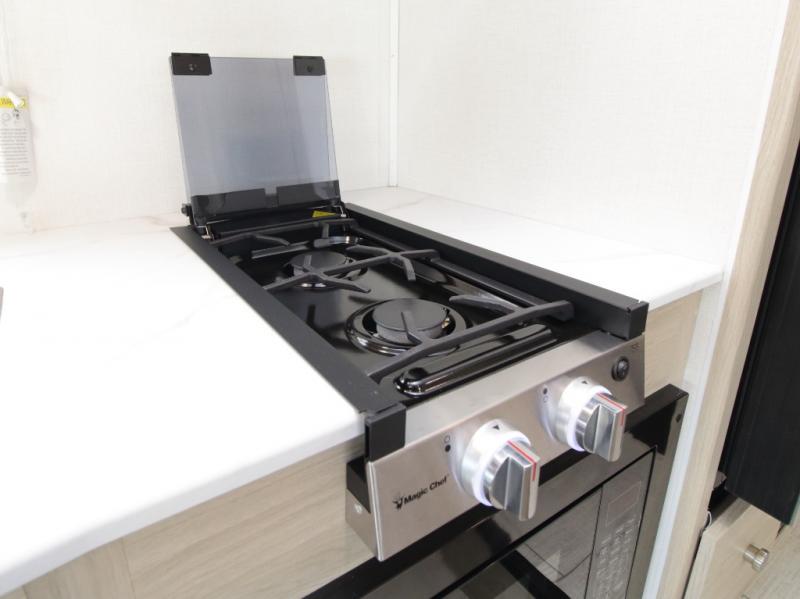 Fully Equipped Kitchen – A 12V refrigerator, three-burner cooktop, and microwave make meal prep a breeze.