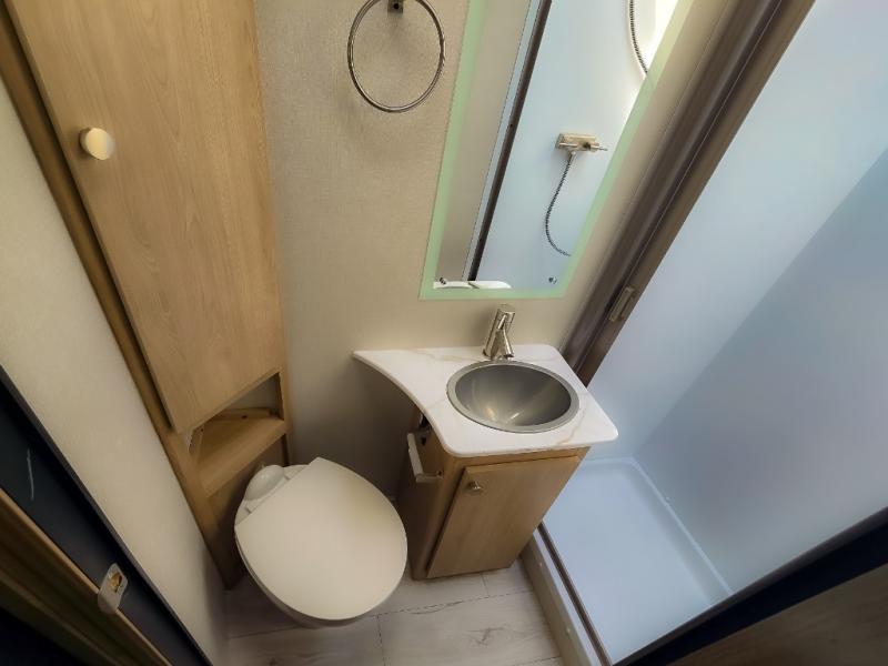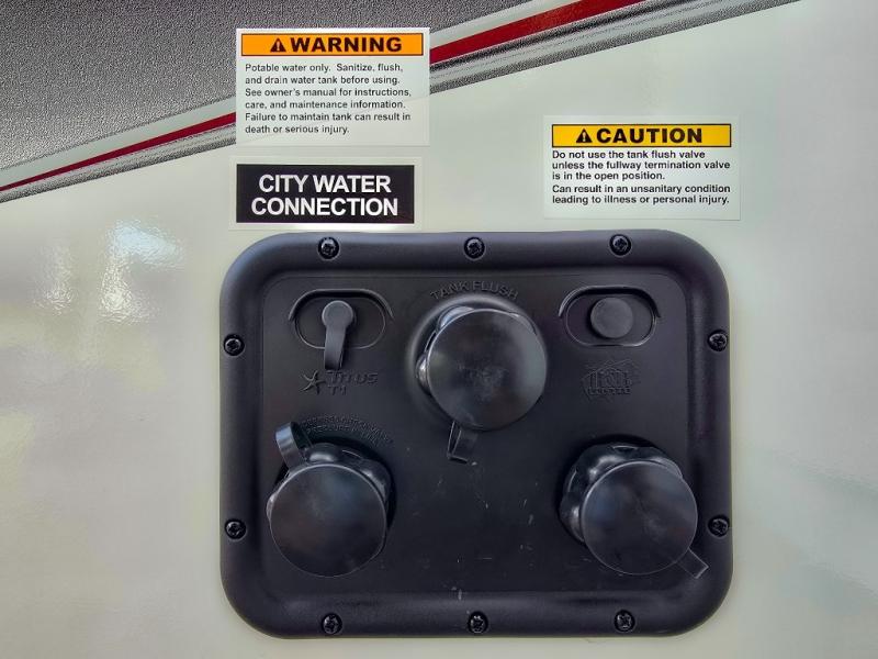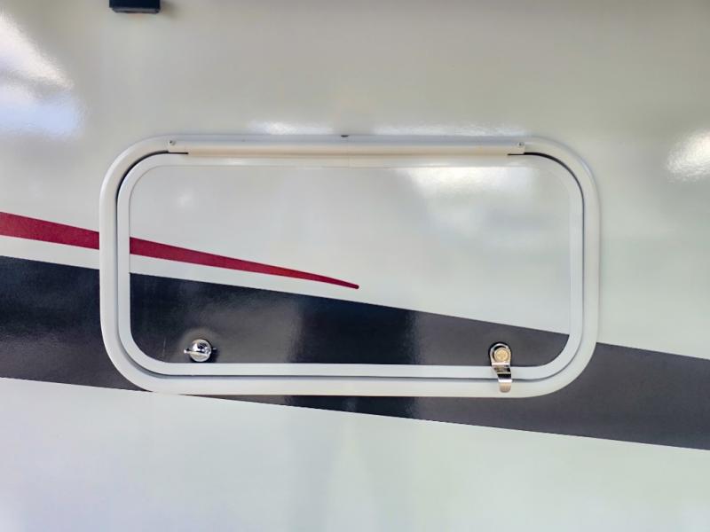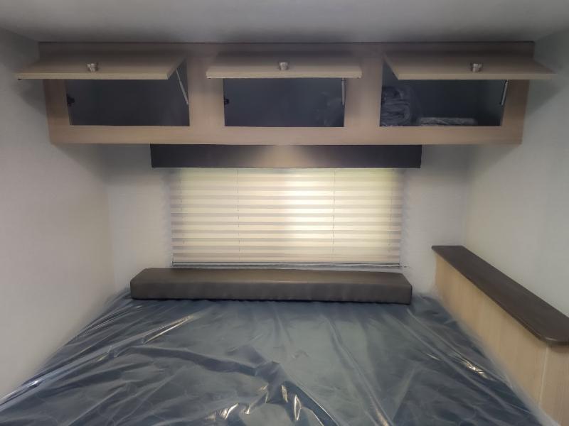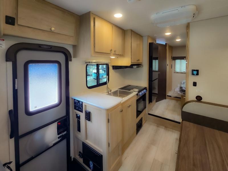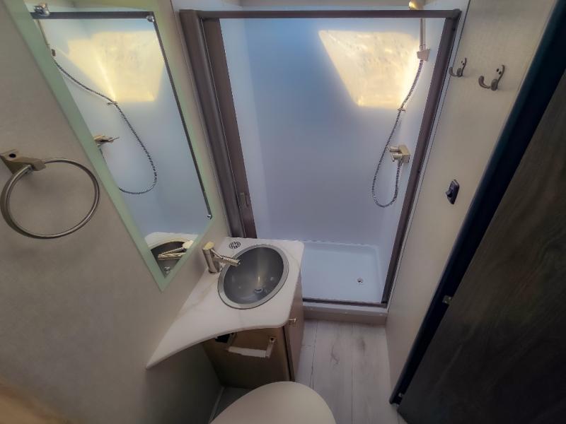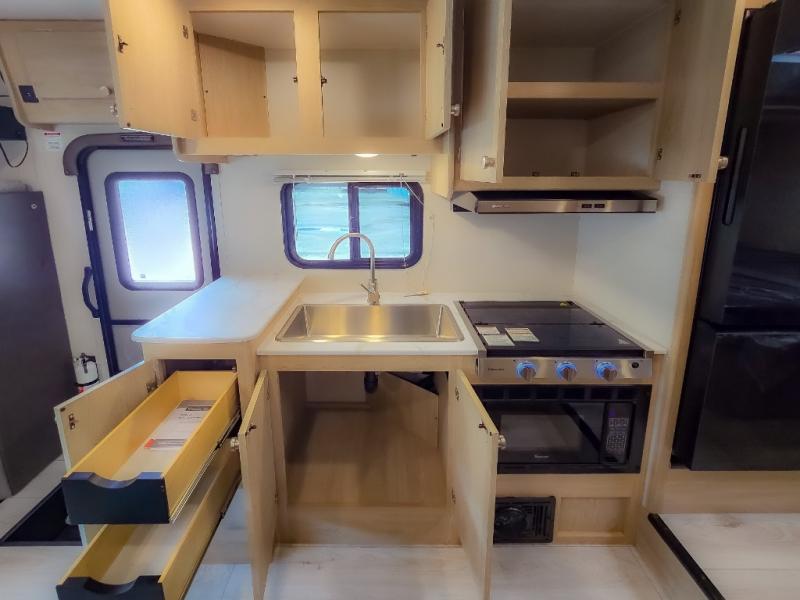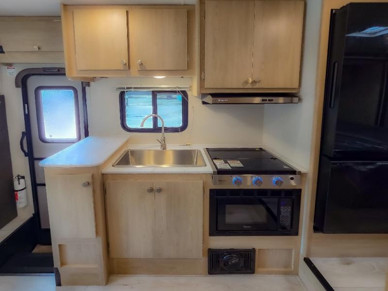You will be met with comfort at every turn in this coach for six! Once you have stopped for the day, you can make lunch on the three burner cooktop and grab a cold drink from the 10 cu. ft. 12V refrigerator. There is a J-lounge with a pedestal table and extension where you can dine together, and the swing-arm TV in the cab will let you check the weather before heading outdoors. The rear corner full bath will let everyone freshen up when you return from hiking, and you'll enjoy a queen bed slide out to sleep on each night, while your guest take the J-lounge and cab-over bunk!