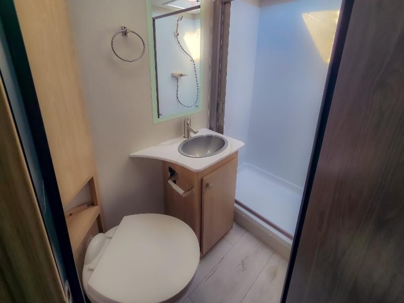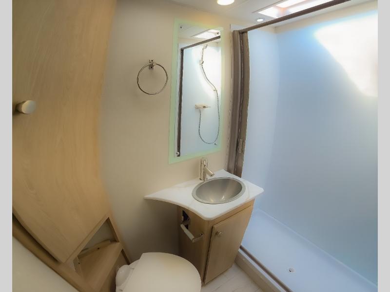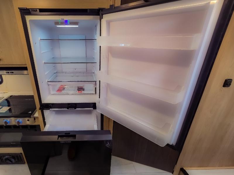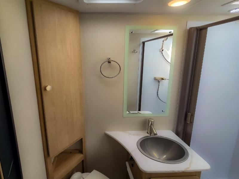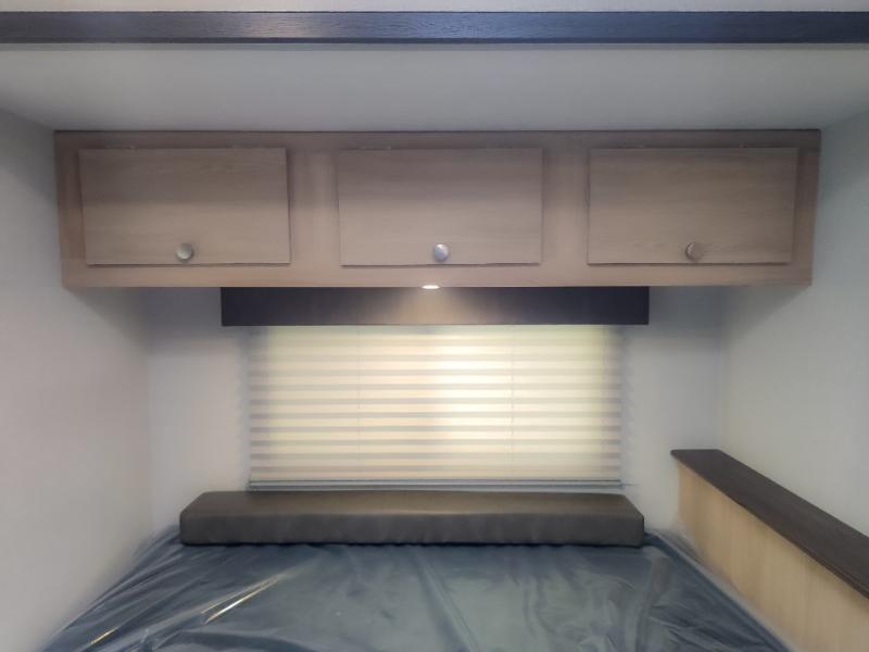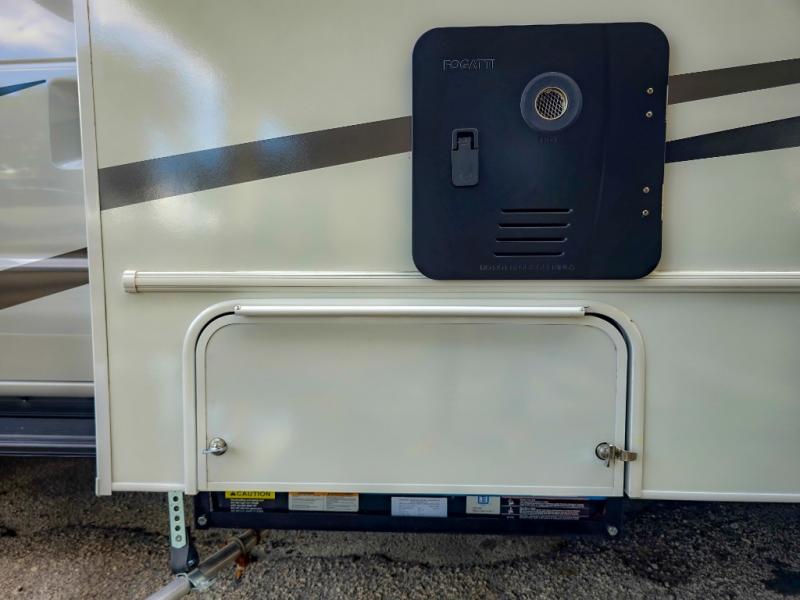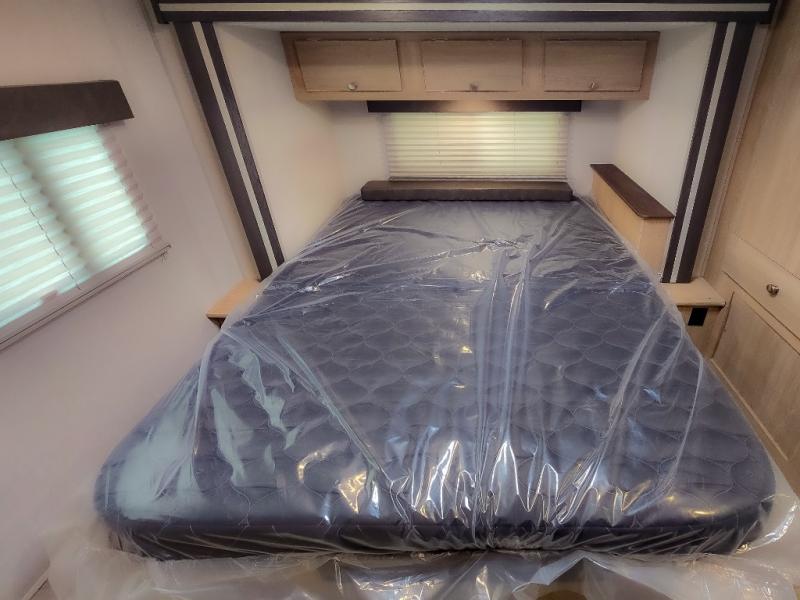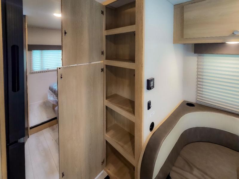 You will be met with comfort at every turn in this coach for six! Once you have stopped for the day, you can make lunch on the three burner cooktop and grab a cold drink from the 10 cu. ft. 12V refrigerator. There is a J-lounge with a pedestal table and extension where you can dine together, and the swing-arm TV in the cab will let you check the weather before heading outdoors. The rear corner full bath will let everyone freshen up when you return from hiking, and you'll enjoy a queen bed slide out to sleep on each night, while your guest take the J-lounge and cab-over bunk!