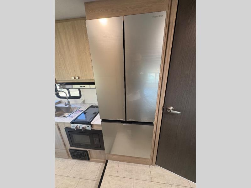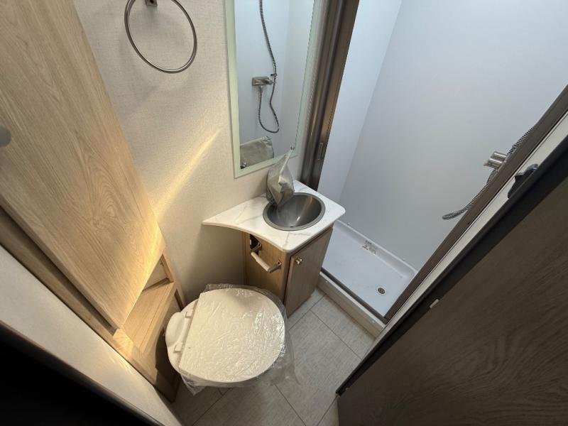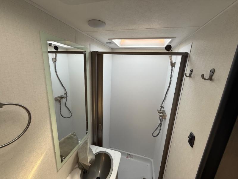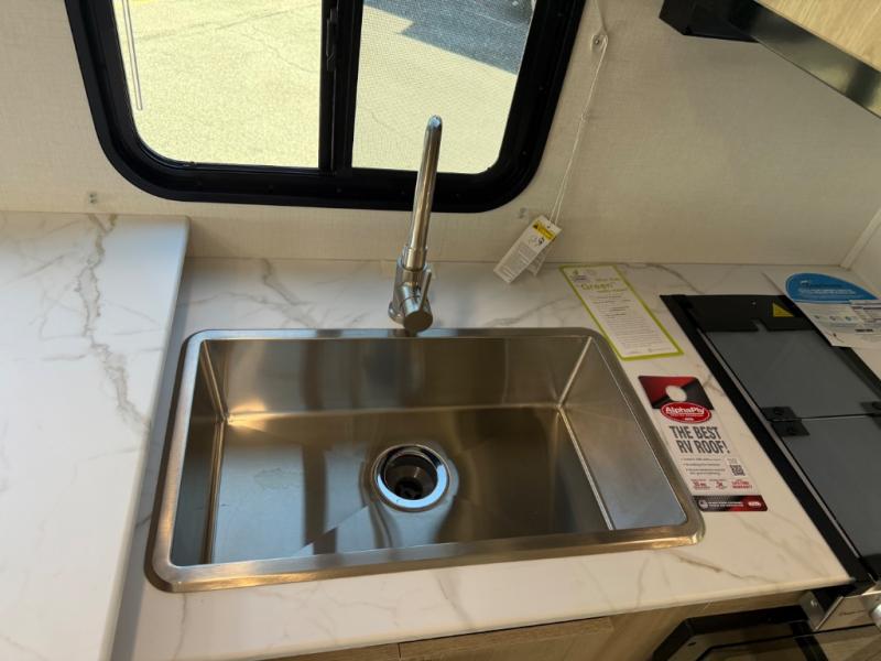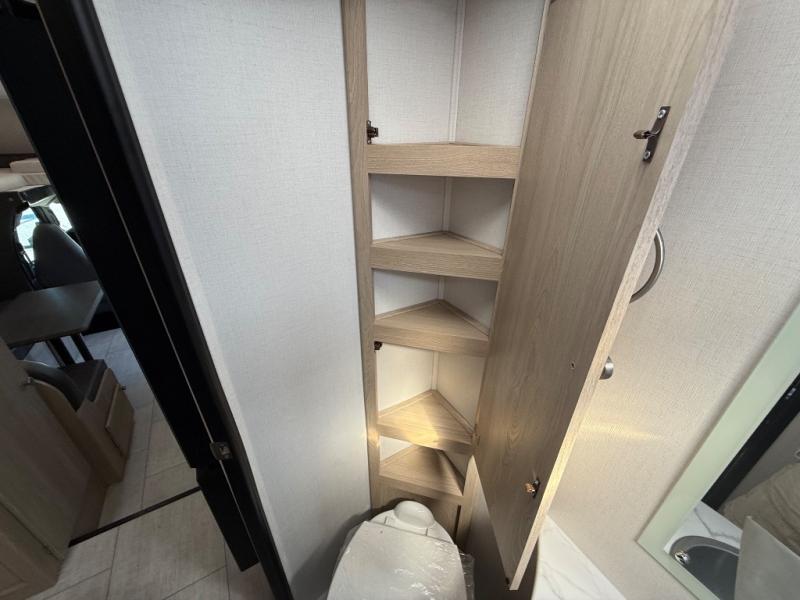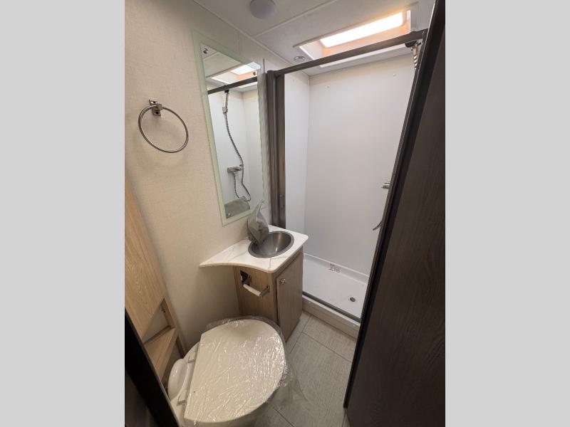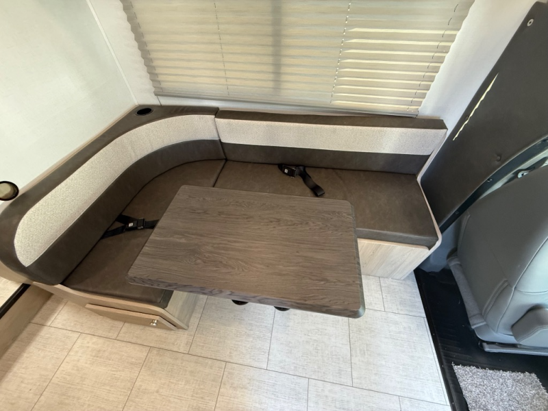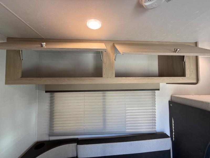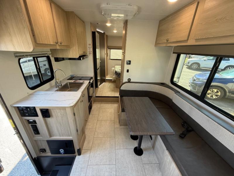 You will be met with comfort at every turn in this coach for six! Once you have stopped for the day, you can make lunch on the three burner cooktop and grab a cold drink from the 10 cu. ft. 12V refrigerator. There is a J-lounge with a pedestal table and extension where you can dine together, and the swing-arm TV in the cab will let you check the weather before heading outdoors. The rear corner full bath will let everyone freshen up when you return from hiking, and you'll enjoy a queen bed slide out to sleep on each night, while your guest take the J-lounge and cab-over bunk!
