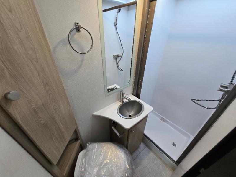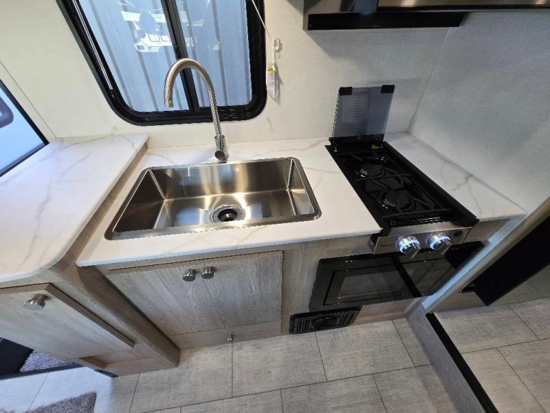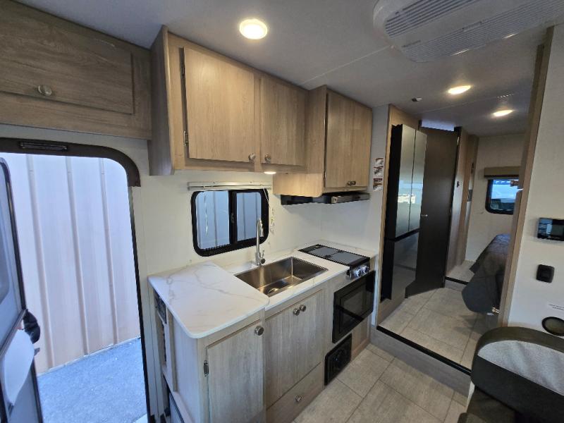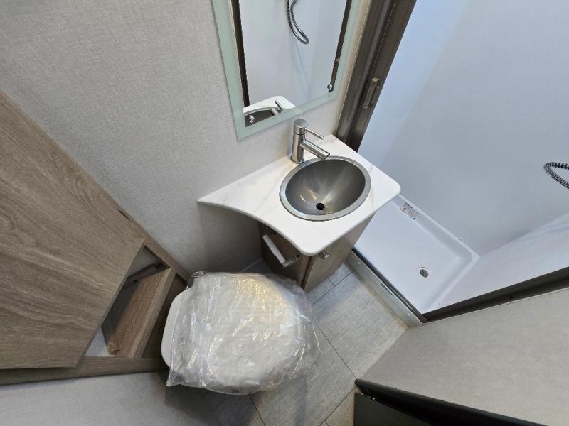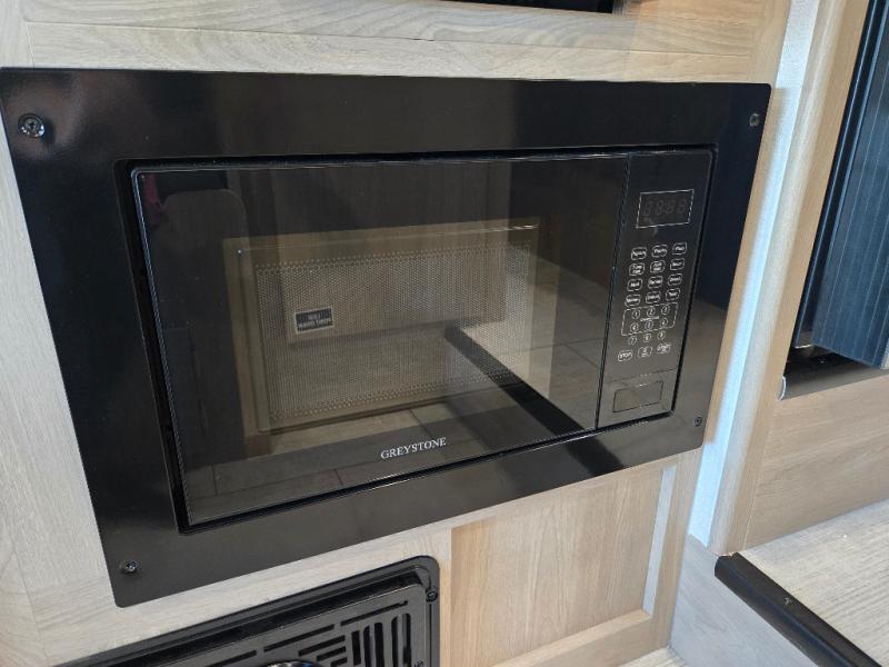 You will be met with comfort at every turn in this coach for six! Once you have stopped for the day, you can make lunch on the three burner cooktop and grab a cold drink from the 10 cu. ft. 12V refrigerator. There is a J-lounge with a pedestal table and extension where you can dine together, and the swing-arm TV in the cab will let you check the weather before heading outdoors. The rear corner full bath will let everyone freshen up when you return from hiking, and you'll enjoy a queen bed slide out to sleep on each night, while your guest take the J-lounge and cab-over bunk!