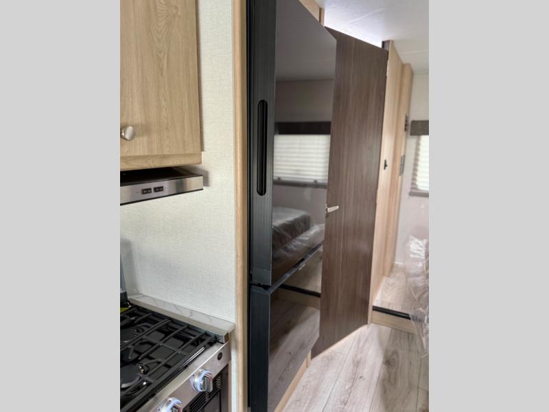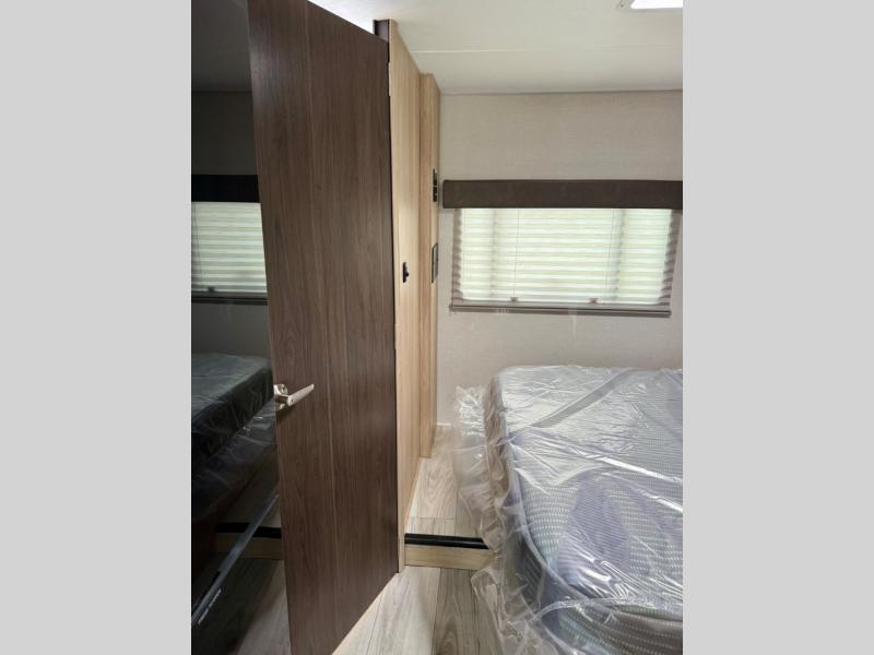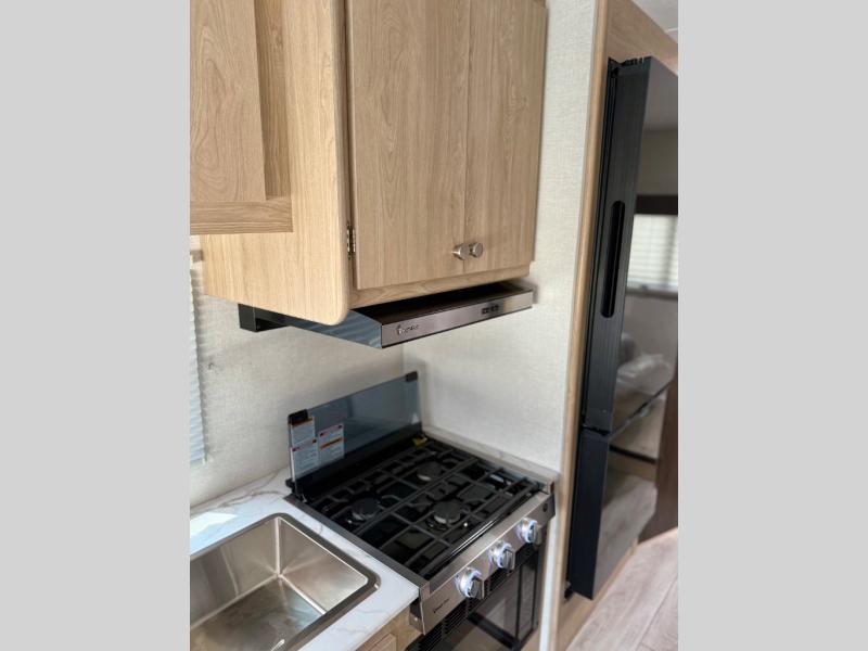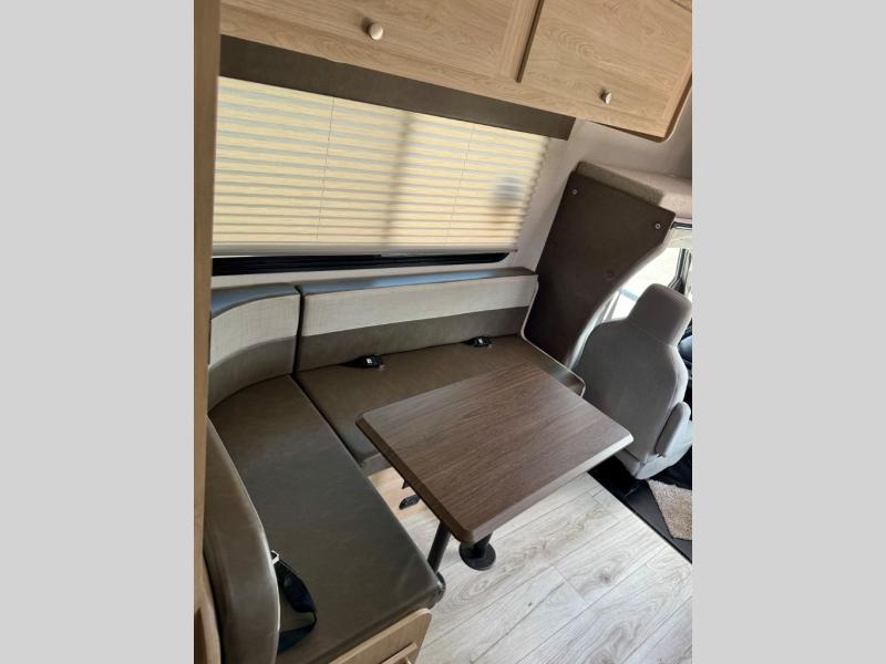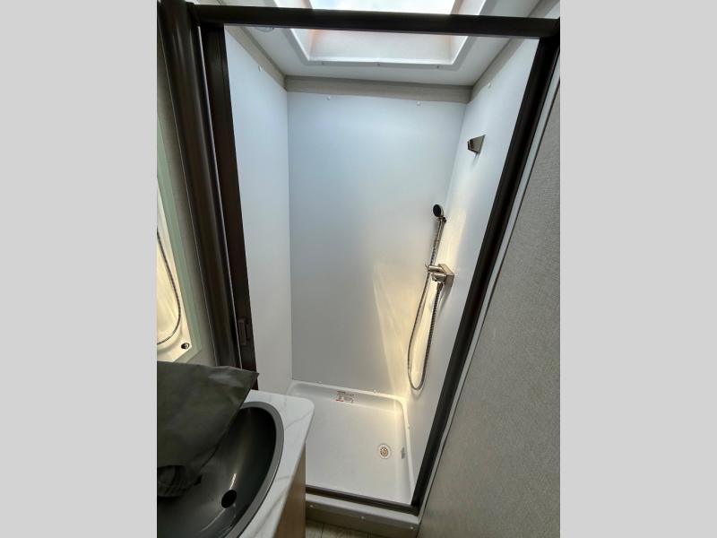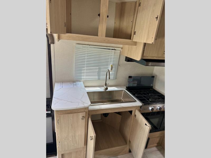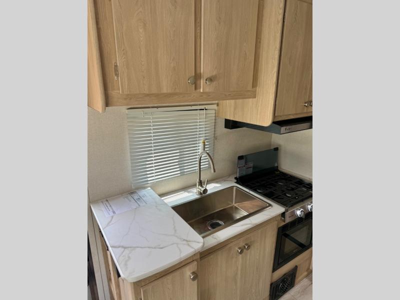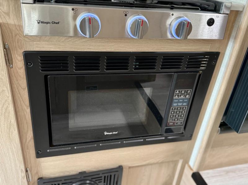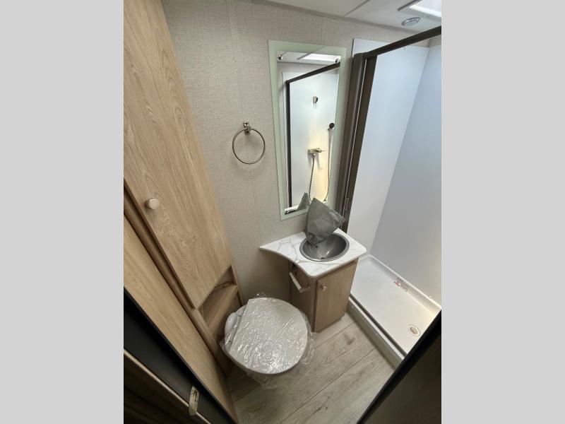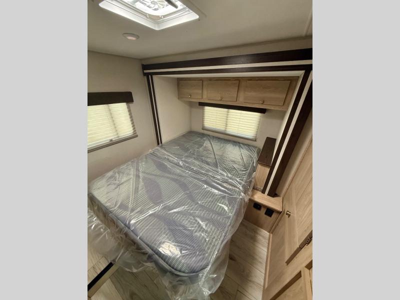 You will be met with comfort at every turn in this coach for six! Once you have stopped for the day, you can make lunch on the three burner cooktop and grab a cold drink from the 10 cu. ft. 12V refrigerator. There is a J-lounge with a pedestal table and extension where you can dine together, and the swing-arm TV in the cab will let you check the weather before heading outdoors. The rear corner full bath will let everyone freshen up when you return from hiking, and you'll enjoy a queen bed slide out to sleep on each night, while your guest take the J-lounge and cab-over bunk!