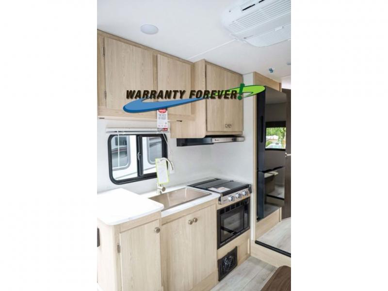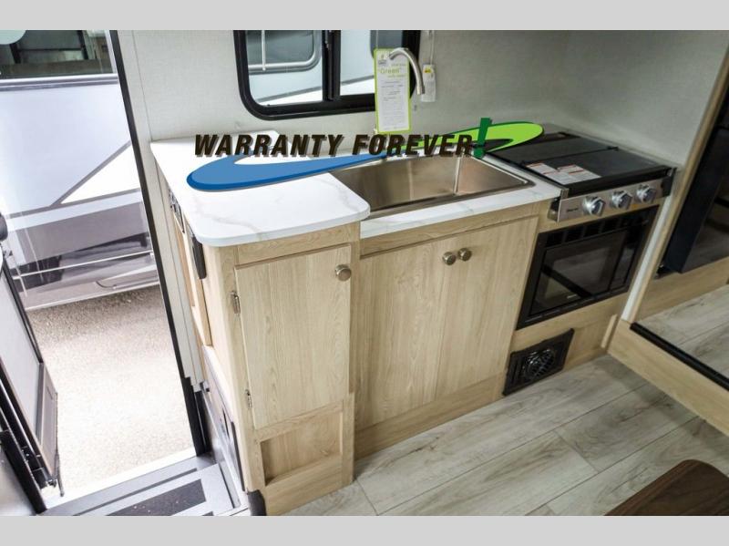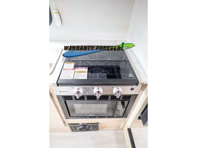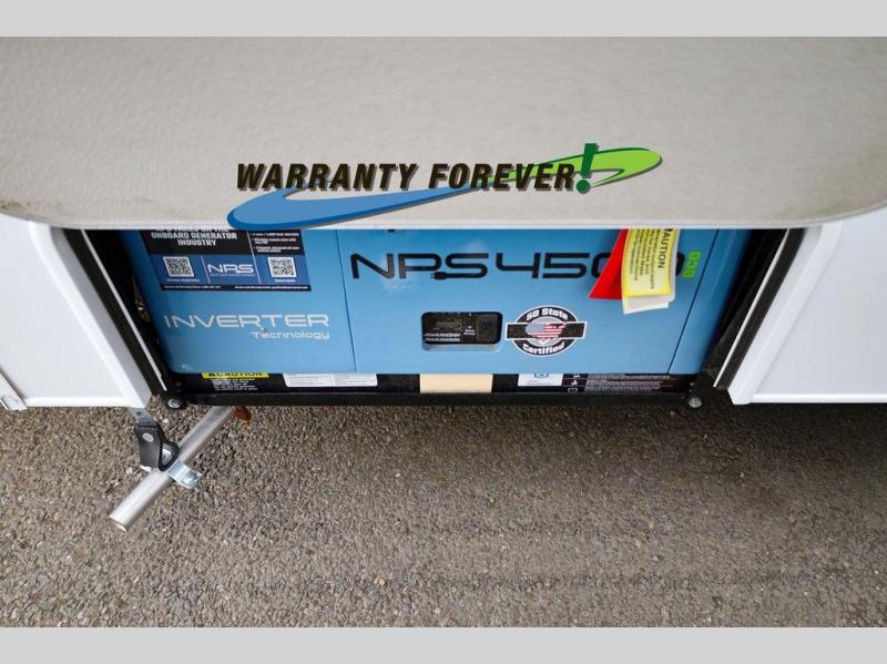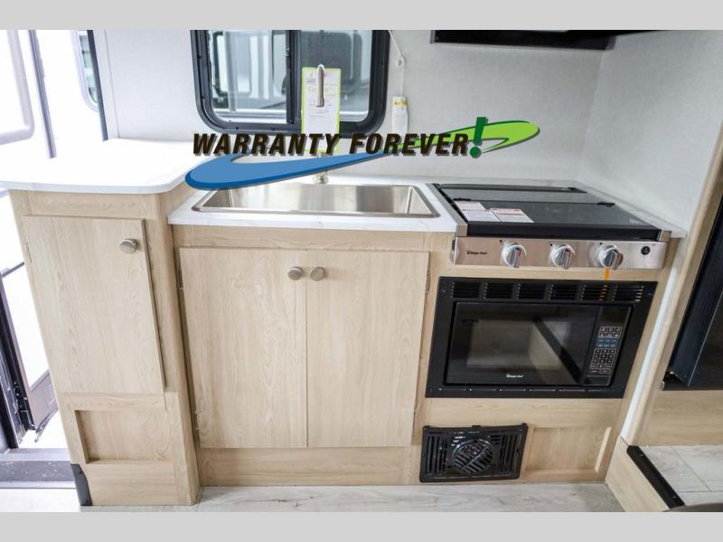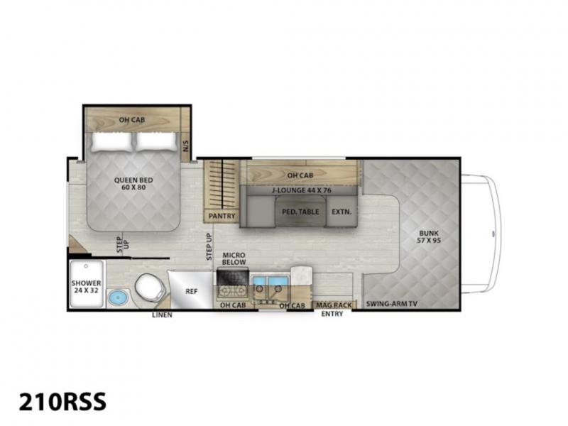 You will be met with comfort at every turn in this coach for six! Once you have stopped for the day, you can make lunch on the three burner cooktop and grab a cold drink from the 10 cu. ft. 12V refrigerator. There is a J-lounge with a pedestal table and extension where you can dine together, and the swing-arm TV in the cab will let you check the weather before heading outdoors. The rear corner full bath will let everyone freshen up when you return from hiking, and you'll enjoy a queen bed slide out to sleep on each night, while your guest take the J-lounge and cab-over bunk!