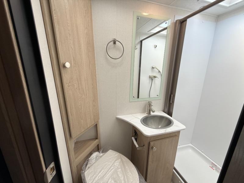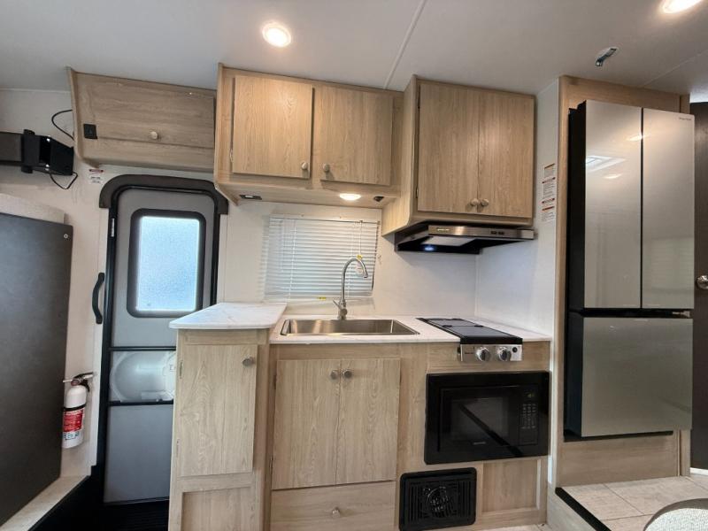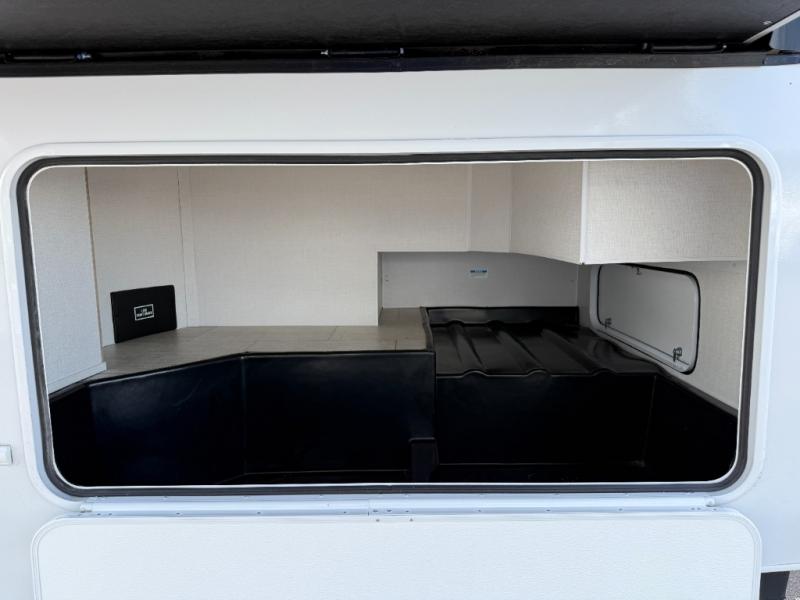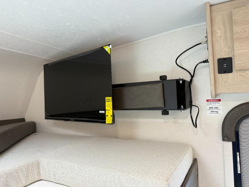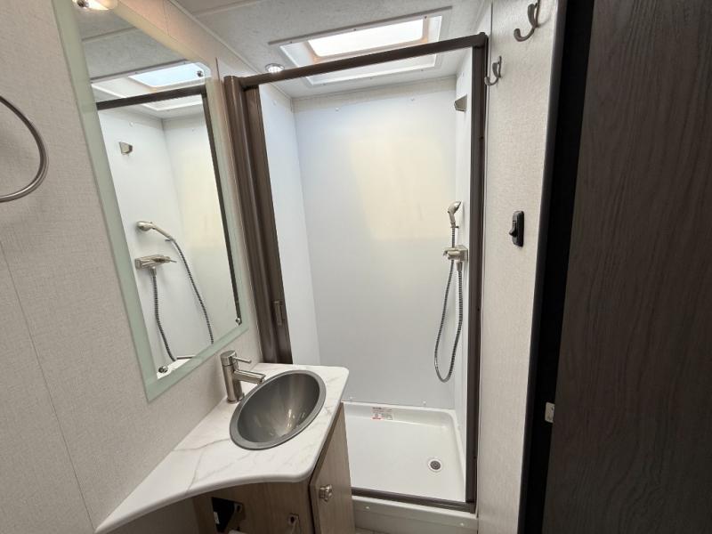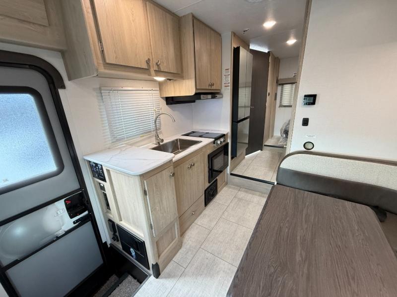 You will be met with comfort at every turn in this coach for six! Once you have stopped for the day, you can make lunch on the three burner cooktop and grab a cold drink from the 10 cu. ft. 12V refrigerator. There is a J-lounge with a pedestal table and extension where you can dine together, and the swing-arm TV in the cab will let you check the weather before heading outdoors. The rear corner full bath will let everyone freshen up when you return from hiking, and you'll enjoy a queen bed slide out to sleep on each night, while your guest take the J-lounge and cab-over bunk!