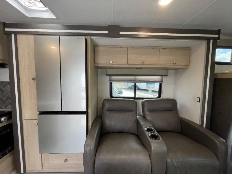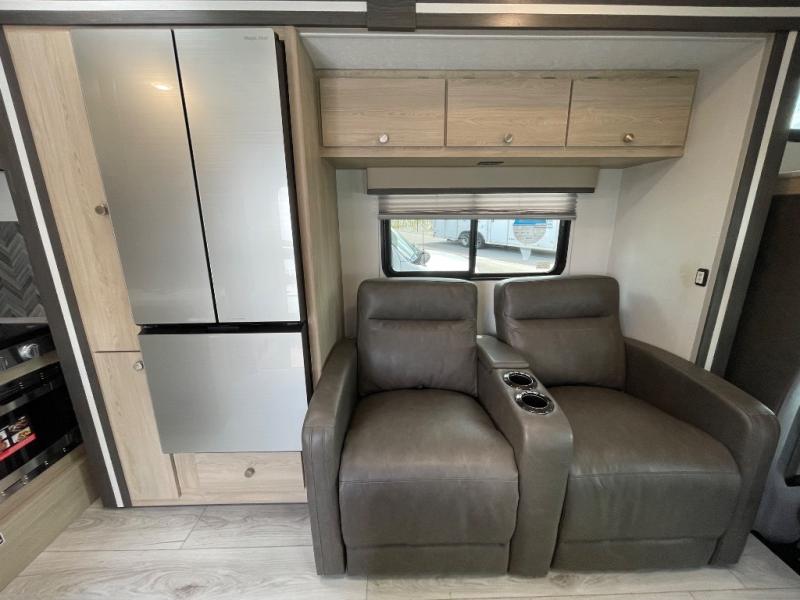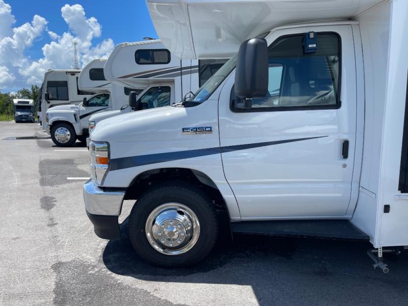 The worst thing you do could is pass up this Leprechaun Class C gas motorhome! This coach is filled with exceptionally helpful amenities, like the flip-down extension in the kitchen, the J-lounge with 18" extension, the full bathroom to stay clean throughout your trip. You have lots of great options with this coach because there is an optional outdoor kitchen table you can add as well as an optional outdoor entertainment center or optional power recliners. The two slides create extra space on the interior for you to relax, and the swing-arm TV will be fun to watch.