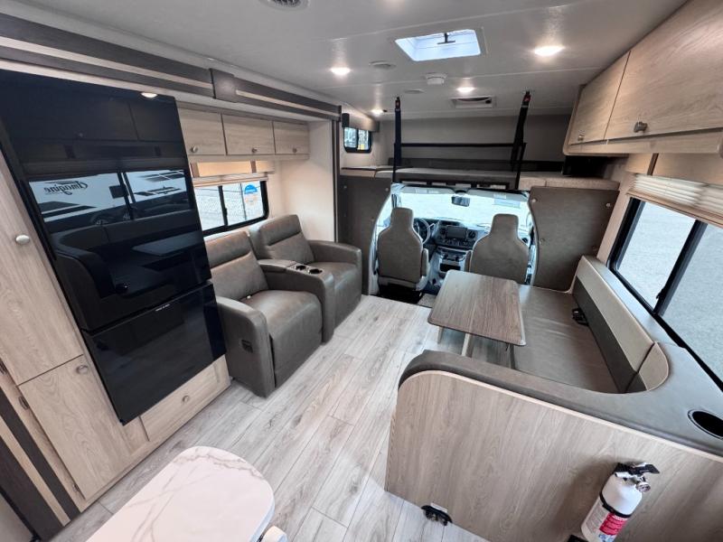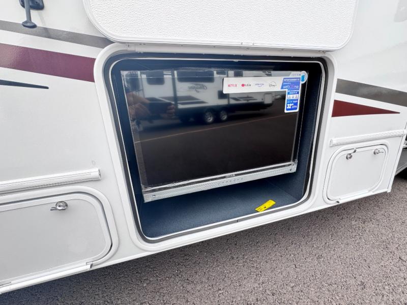 The worst thing you do could is pass up this Leprechaun Class C gas motorhome! This coach is filled with exceptionally helpful amenities, like the flip-down extension in the kitchen, the J-lounge with 18" extension, the full bathroom to stay clean throughout your trip. You have lots of great options with this coach because there is an optional outdoor kitchen table you can add as well as an optional outdoor entertainment center or optional power recliners. The two slides create extra space on the interior for you to relax, and the swing-arm TV will be fun to watch.