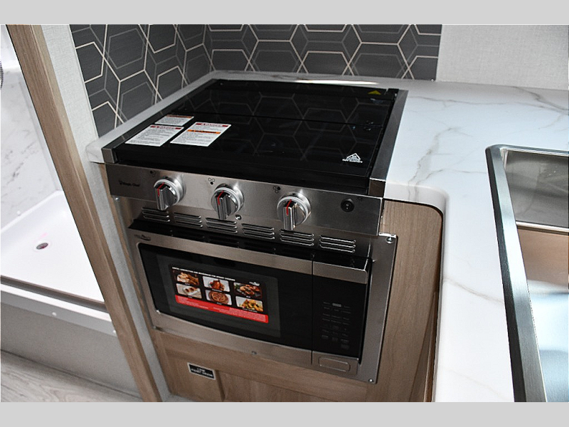 Prep meals with ease using the 3-burner cooktop, microwave, refrigerator, and double sink.
