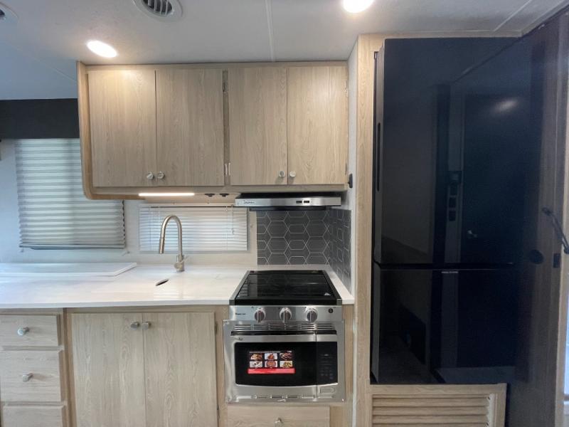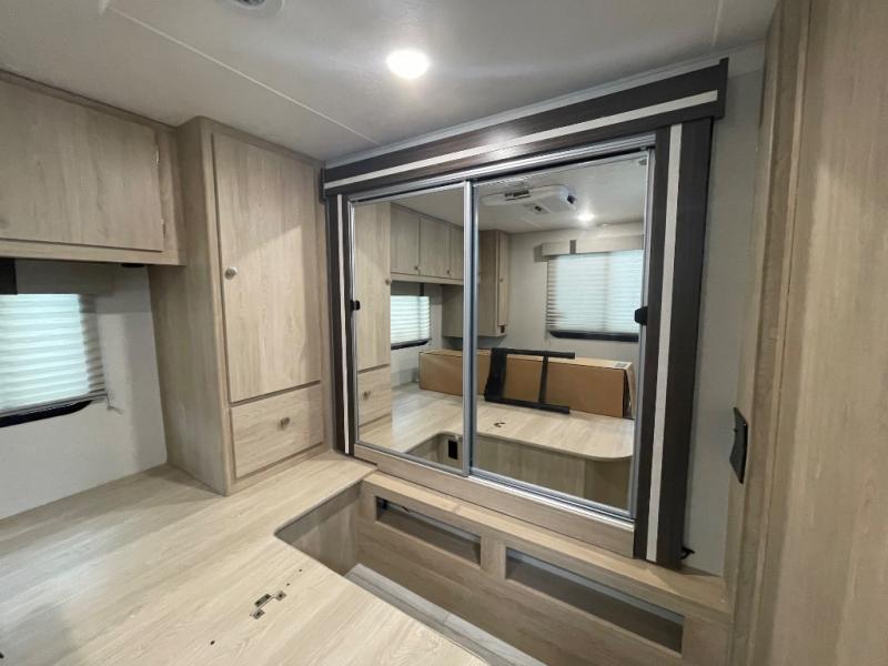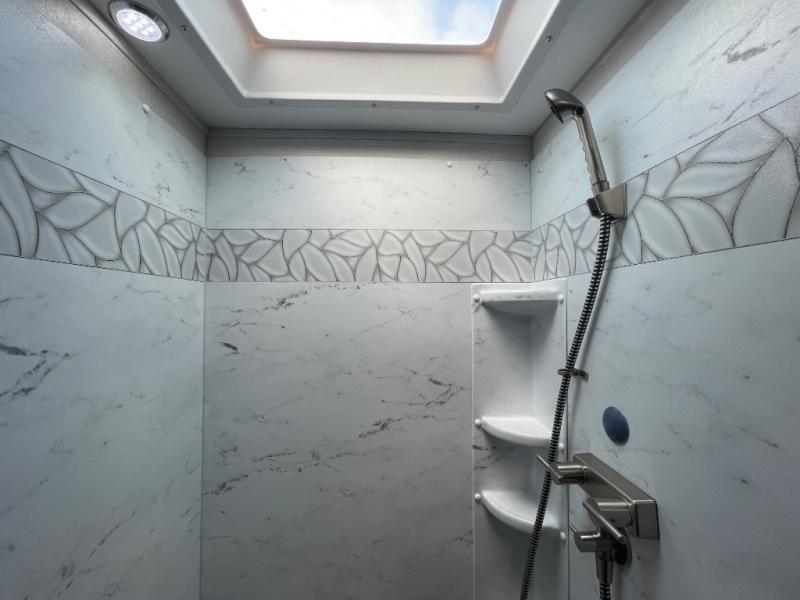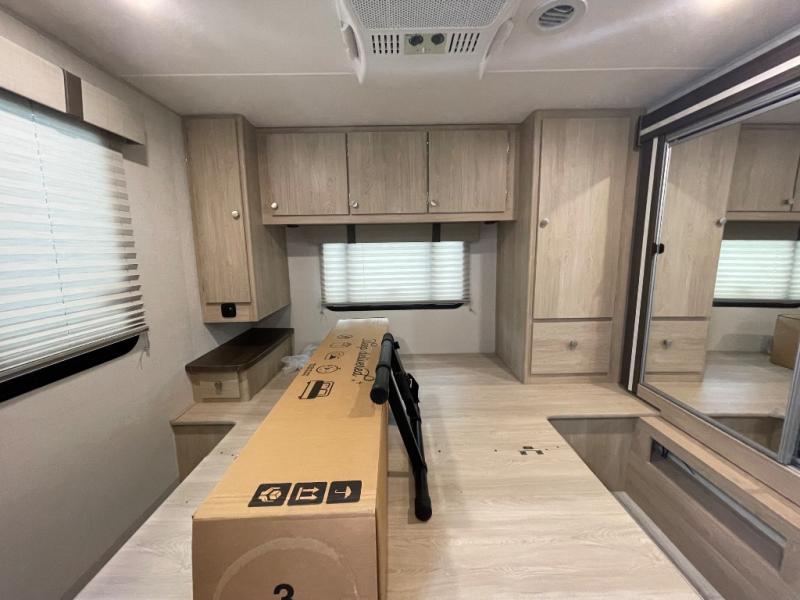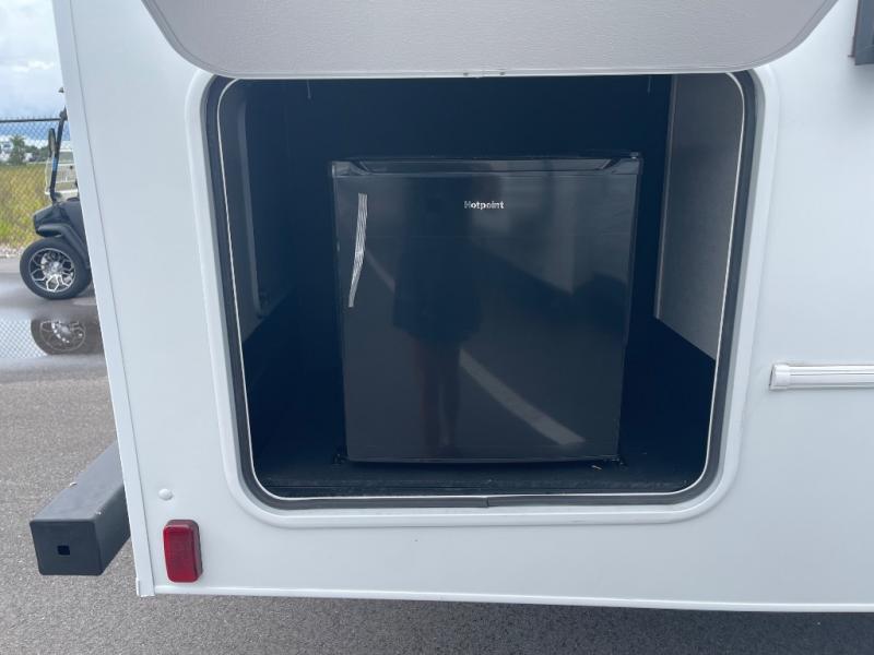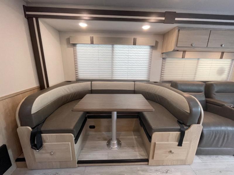 You'll have the time of your life in this Leprechaun Class C gas motorhome! There is a rear private bedroom with a queen-size bed and a wardrobe slide, and the bedroom is right next to the bathroom for convenience. Here you'll find a private toilet and sink with the shower right across the hall, and you can close off this space to make one big bathroom if you want! Out in the main living area, there is a large slide that holds the U-shaped dinette and sofa. These pieces of furniture sit directly across from the kitchen so that you can chat with the chef while preparing meals on the three-burner range or in the microwave. If you enjoy cooking outdoors, you might want to choose the optional camp kitchen!