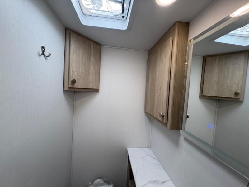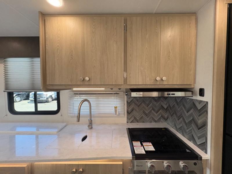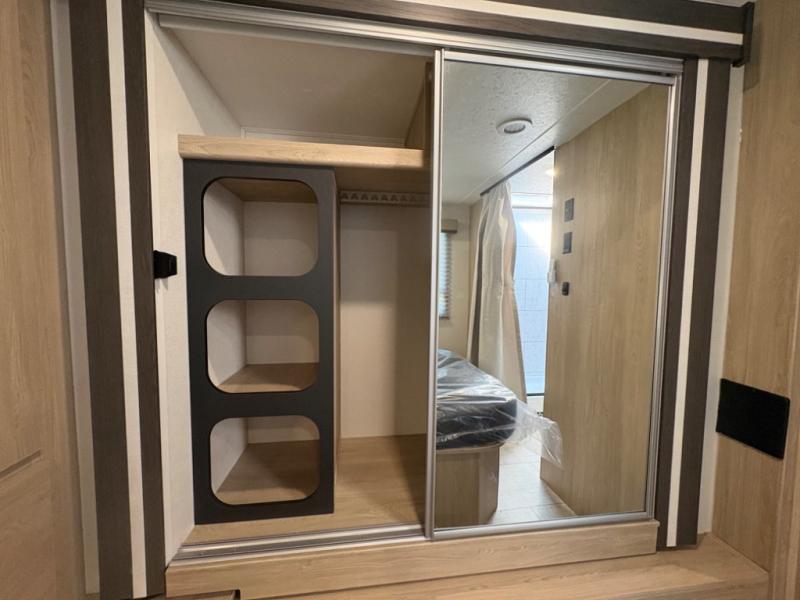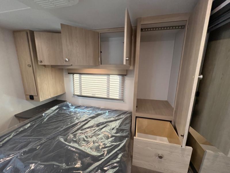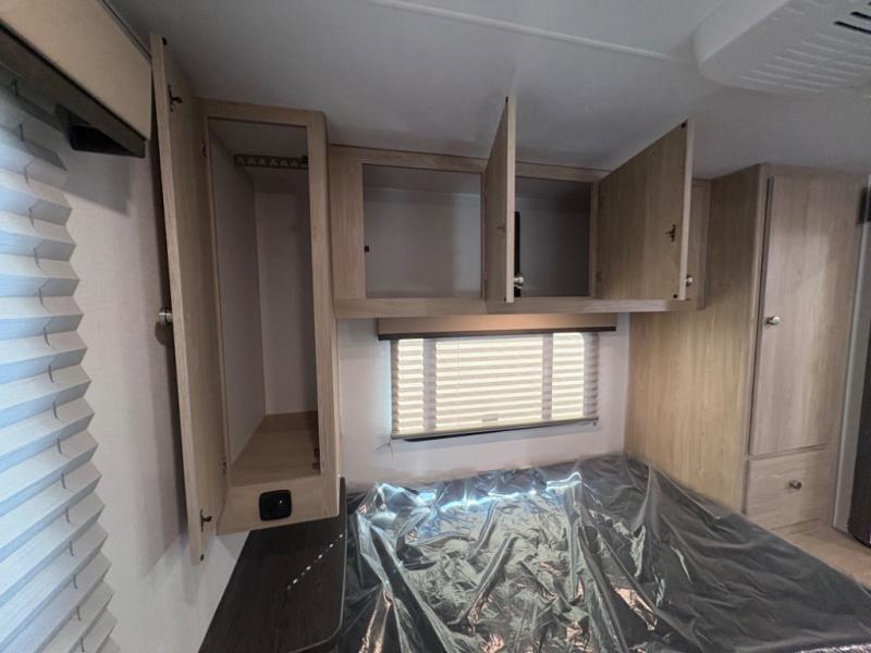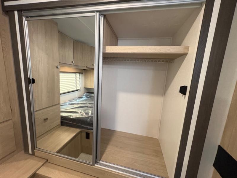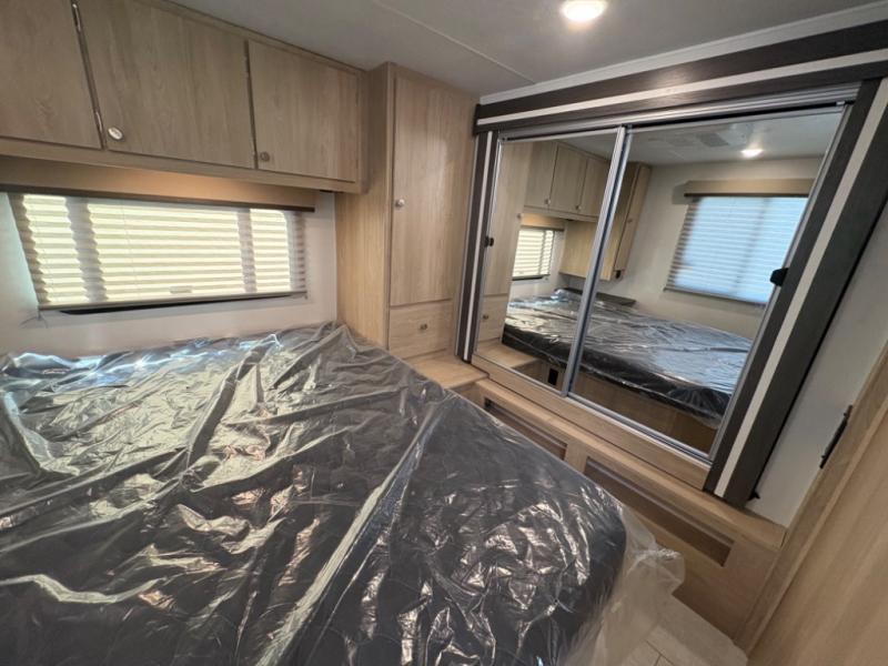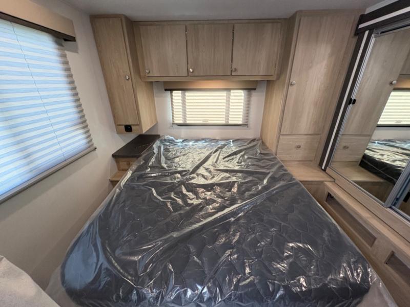 The Leprechaun 319MB offers a spacious, thoughtfully designed layout with a residential feel. The private rear bedroom features a walk-around queen bed, wardrobes, and plenty of storage, while the living area provides a comfortable sofa, convertible dinette, and large cab-over bunk — perfect for family or guests. A fully equipped kitchen with a 3-burner range, oven, microwave, and large refrigerator makes cooking easy wherever you camp.