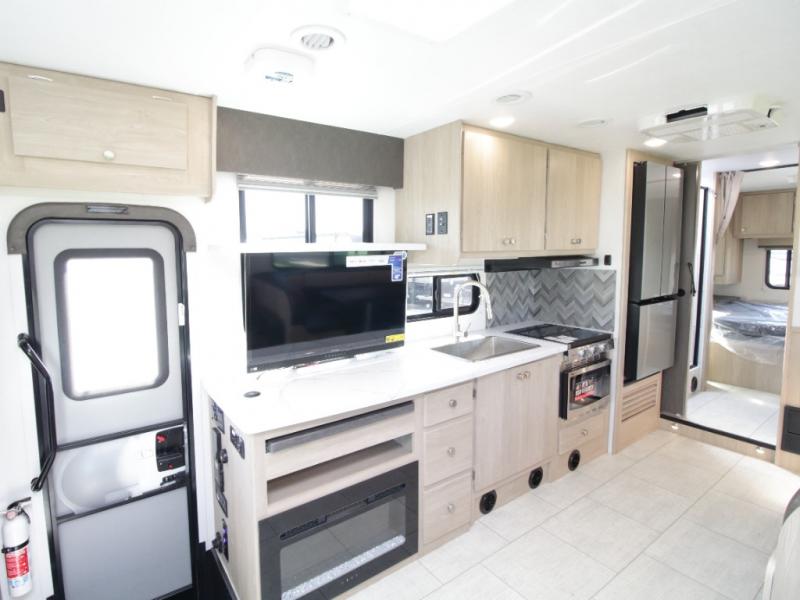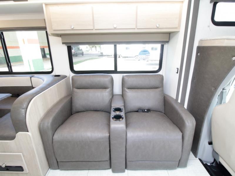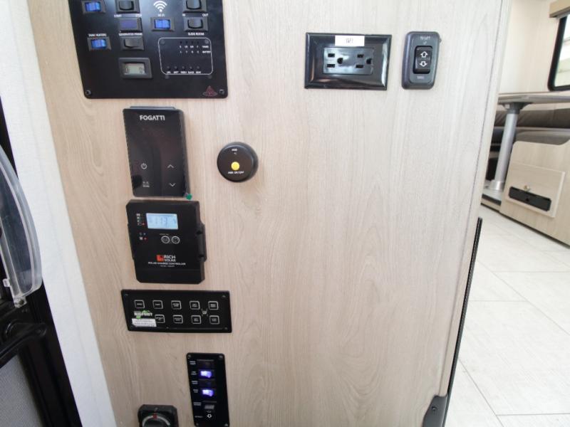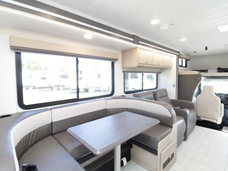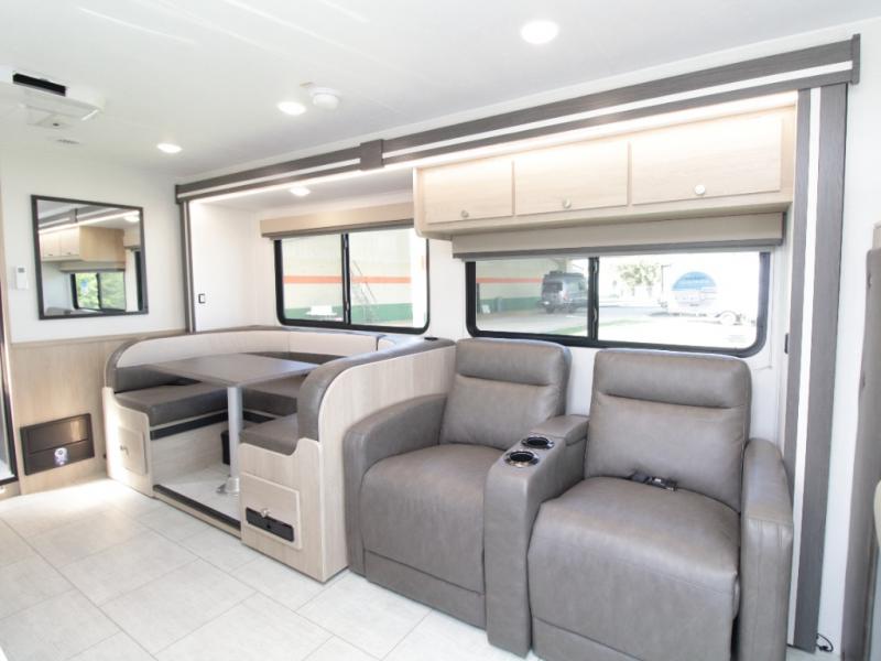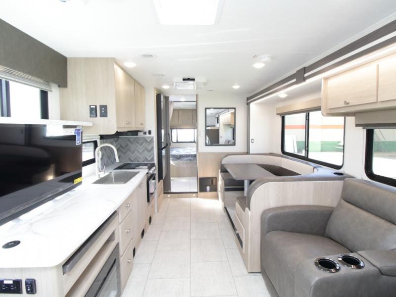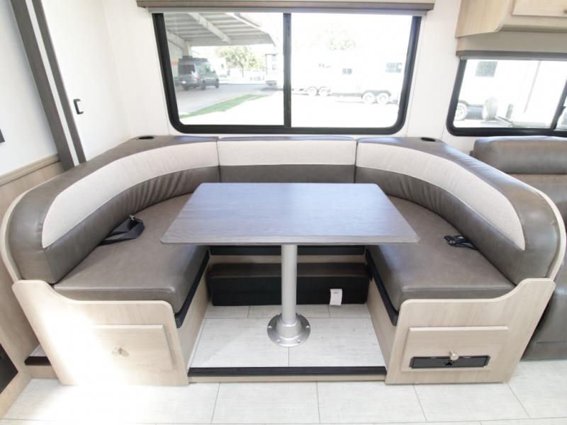 Every Leprechaun motorhome is designed with residential comfort and lasting quality. You’ll appreciate details like premium vinyl flooring, pleated night shades, and a skylight above the shower for natural light. A 15,000 BTU A/C, on-demand tankless water heater, and USB charging ports keep your RV cool, efficient, and connected.