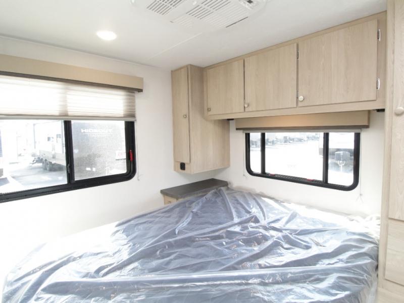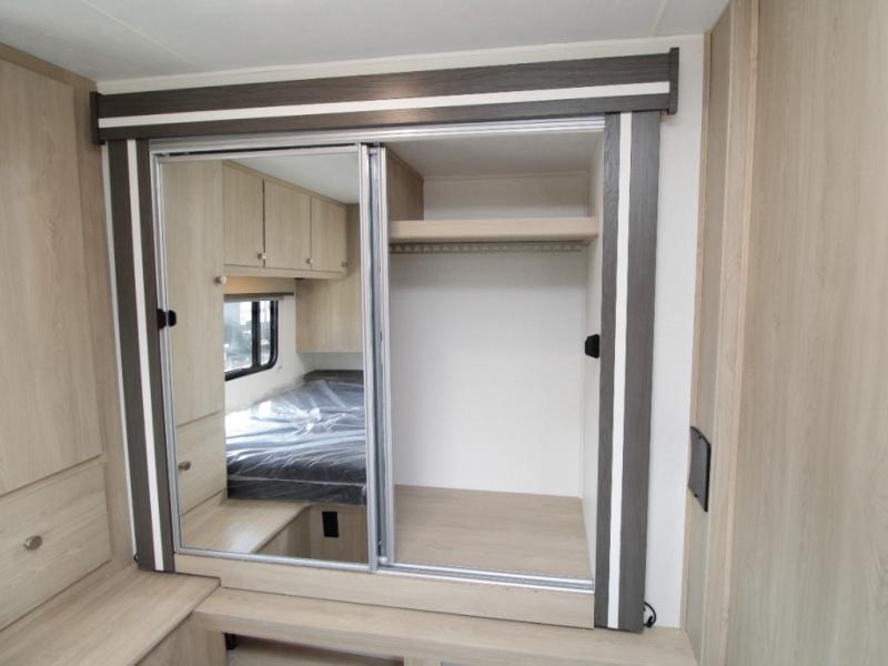 Rear Private Bedroom – Queen bed with a wardrobe slide for extra storage.