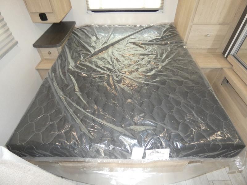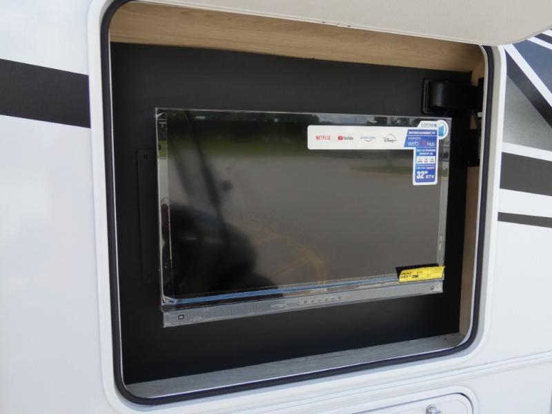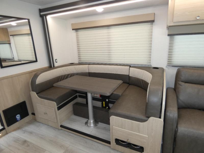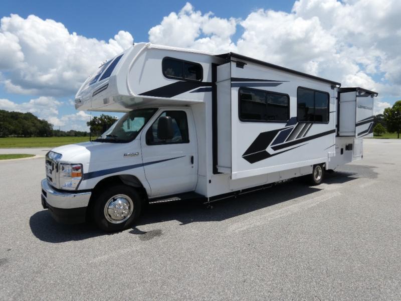 You'll have the time of your life in this Leprechaun Class C gas motorhome! There is a rear private bedroom with a queen-size bed and a wardrobe slide, and the bedroom is right next to the bathroom for convenience. Here you'll find a private toilet and sink with the shower right across the hall, and you can close off this space to make one big bathroom if you want! Out in the main living area, there is a large slide that holds the U-shaped dinette and theater seating. These pieces of furniture sit directly across from the kitchen so that you can chat with the chef while preparing meals on the three-burner range or in the microwave.