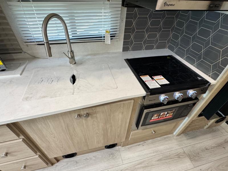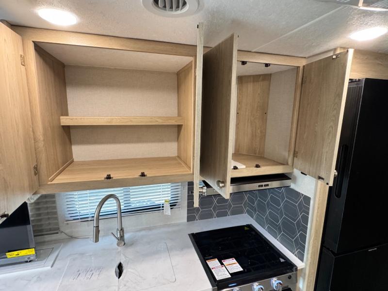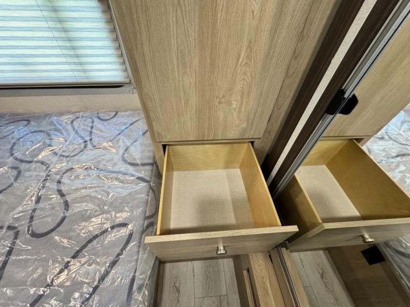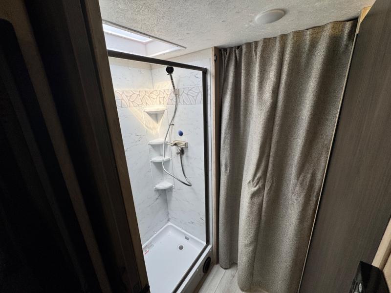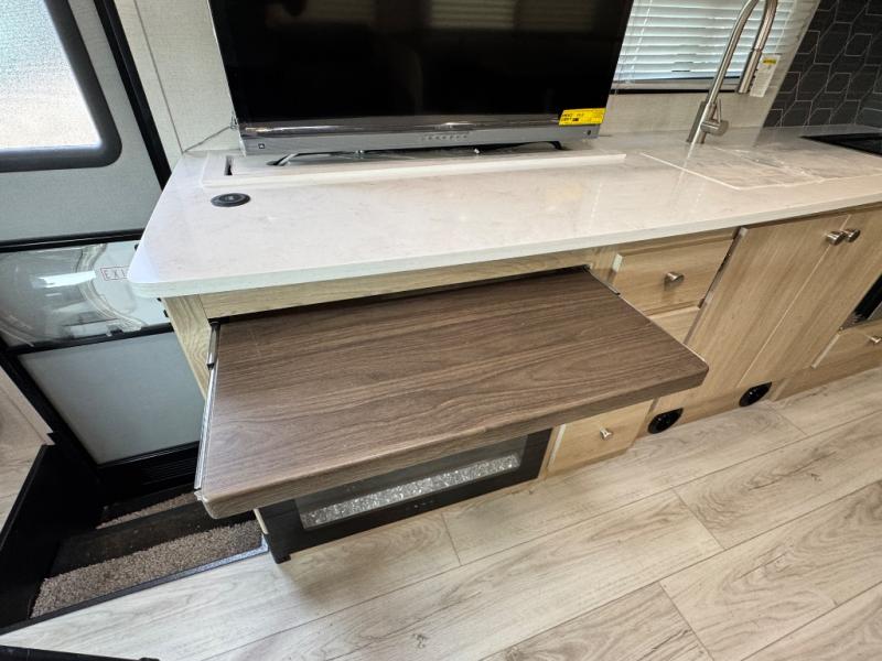 You'll have the time of your life in this Leprechaun Class C gas motorhome! There is a rear private bedroom with a queen-size bed and a wardrobe slide, and the bedroom is right next to the bathroom for convenience. Here you'll find a private toilet and sink with the shower right across the hall, and you can close off this space to make one big bathroom if you want! Out in the main living area, there is a large slide that holds the U-shaped dinette and sofa. These pieces of furniture sit directly across from the kitchen so that you can chat with the chef while preparing meals on the three-burner range or in the microwave. If you enjoy cooking outdoors, you might want to choose the optional camp kitchen!
