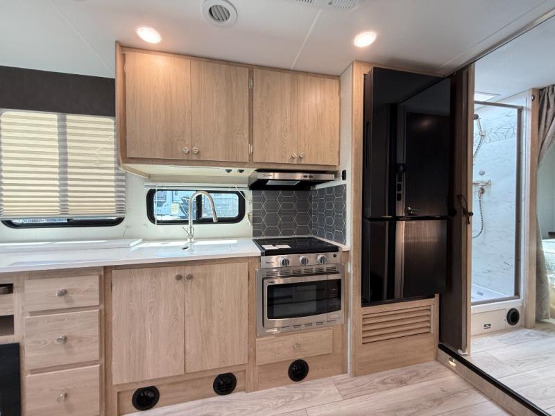 You'll have the time of your life in this Leprechaun Class C gas motorhome! There is a rear private bedroom with a queen-size bed and a wardrobe slide, and the bedroom is right next to the bathroom for convenience. Here you'll find a private toilet and sink with the shower right across the hall, and you can close off this space to make one big bathroom if you want! Out in the main living area, there is a large slide that holds the U-shaped dinette and sofa. These pieces of furniture sit directly across from the kitchen so that you can chat with the chef while preparing meals on the three-burner range or in the microwave. If you enjoy cooking outdoors, you might want to choose the optional camp kitchen!